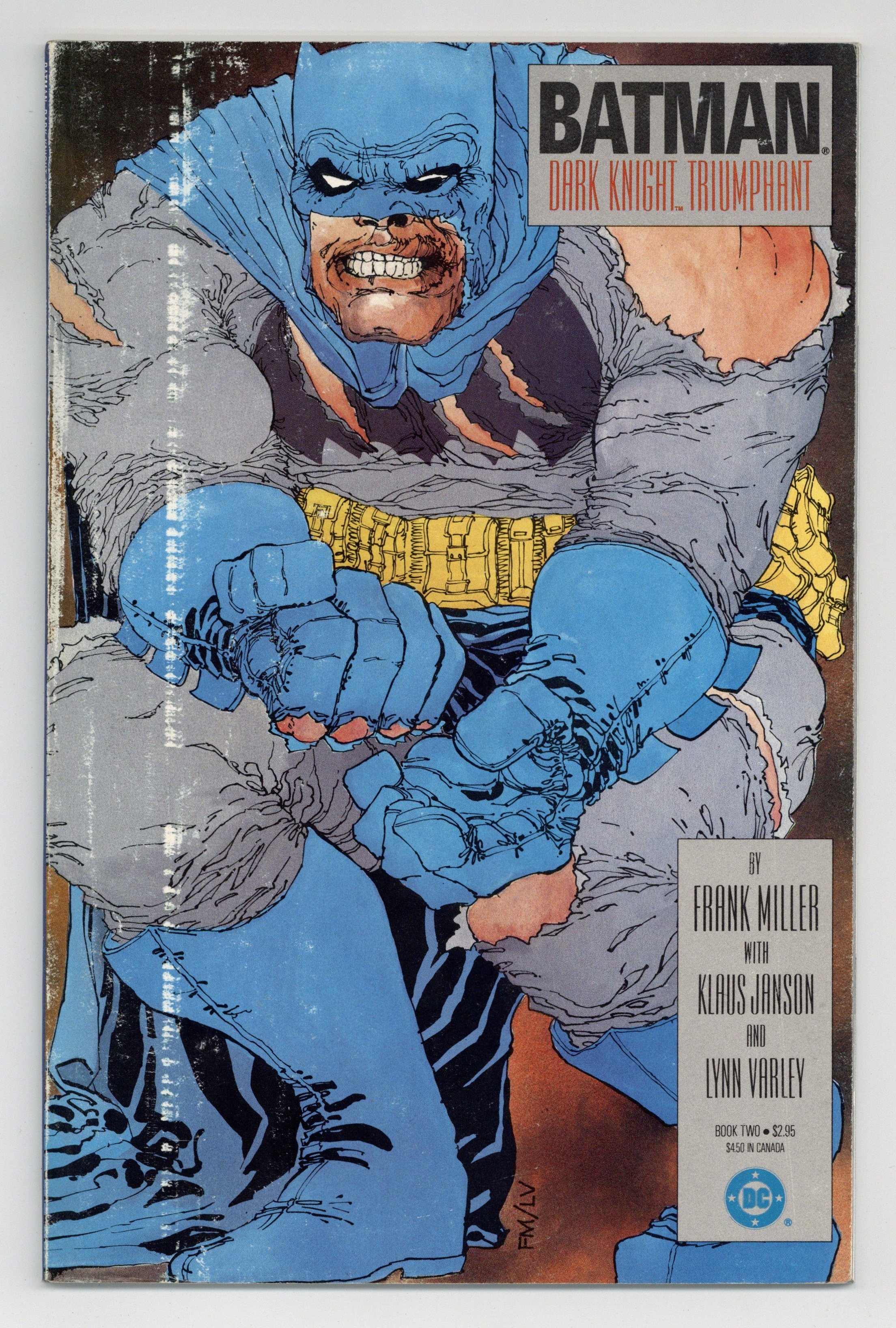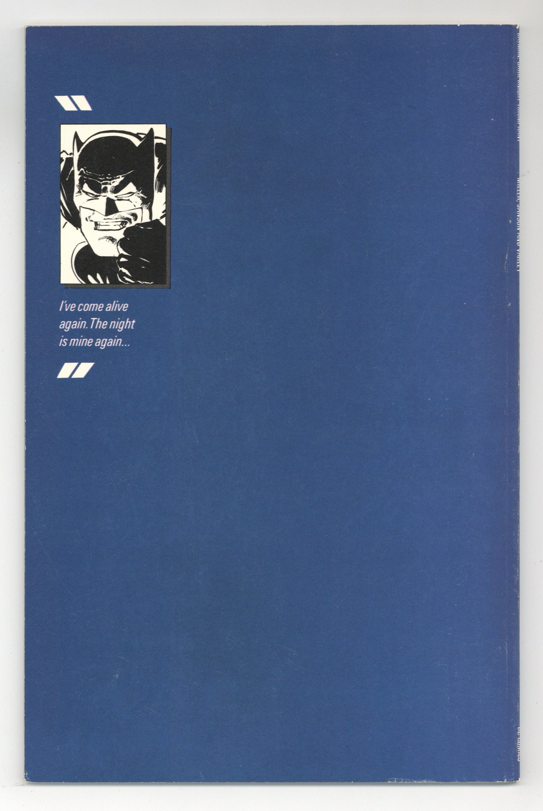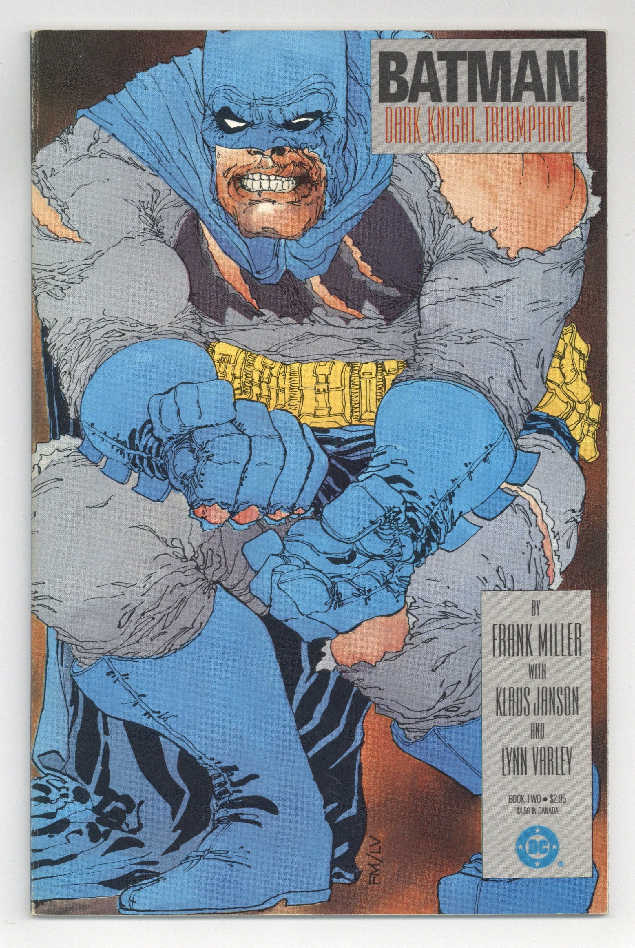 First printing. Direct Edition. NOTE: 1st printing has almost matching grey background on inside front cover and facing page. 2nd printing doesn't have matching gray background--grays are very different. 3rd printings are labeled as such. Cover by Frank Miller. "Dark Knight Triumphant," script by Frank Miller, pencils by Frank Miller, inks by Klaus Janson; an aging Batman battles the Mutant gang and their anonymous leader; While walking to work, considering retirement, Jim Gordon is almost killed by a 17-year old boy with an M60; Carrie Kelly, a young girl who owes her life to Batman, seeks out her hero and becomes Robin. 52 pgs., full color. Cover price $2.95.
