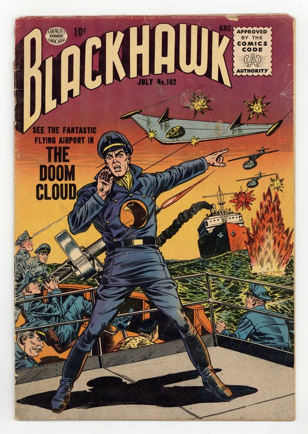 Cover by Dick Dillin and Chuck Cuidera. Stories by Joe Millard, Robert Bernstein and unknown. Art by Dick Dillin, Chuck Cuidera and Sam Citron. Featuring Blackhawk in: "Master of Mankind" by Joe Millard, Dick Dillin and Chuck Cuidera; "The Doom Cloud" by Millard, Dillin and Cuidera; "The Red Professor's Secret" by Robert Bernstein, Dillin and Cuidera; and 1-page text story "Intercepted Peril," reprinted (and retitled) from Modern Comics (1945) #95. Plus: Back-up story "Critical Target" by Bernstein and Sam Citron. 36 Pages, Full Color. Cover price $0.10.