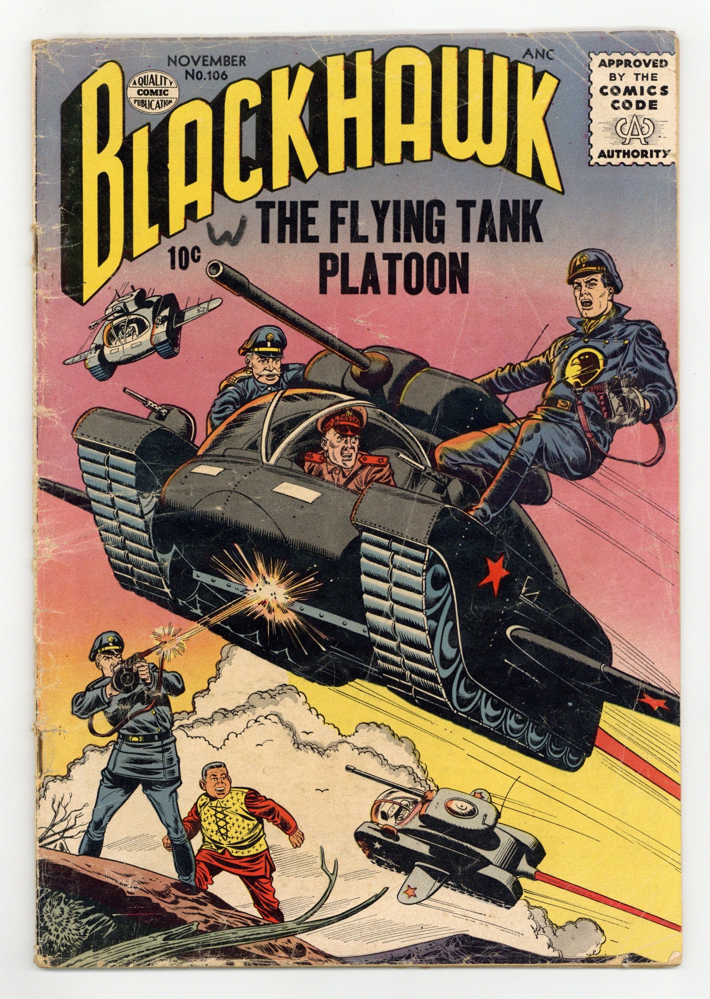 Cover by Dick Dillin and Chuck Cuidera. Stories by Robert Bernstein and unknown. Art by Dick Dillin, Chuck Cuidera and Sam Citron. Featuring Blackhawk in: "The Flying Tank Platoon" by Robert Bernstein, Dick Dillin and Chuck Cuidera; "Stars of Disaster" by Bernstein, Dillin and Cuidera; and "The Red Raiders" by Bernstein, Dillin and Cuidera. Plus: Back-up story "Sam's Sixth Sense" by Bernstein and Sam Citron. And: 1-page text story "Dollars for Doughnuts," reprinted from Plastic Man (1943 Vital/Quality) #52. 36 Pages, Full Color. Cover price $0.10.