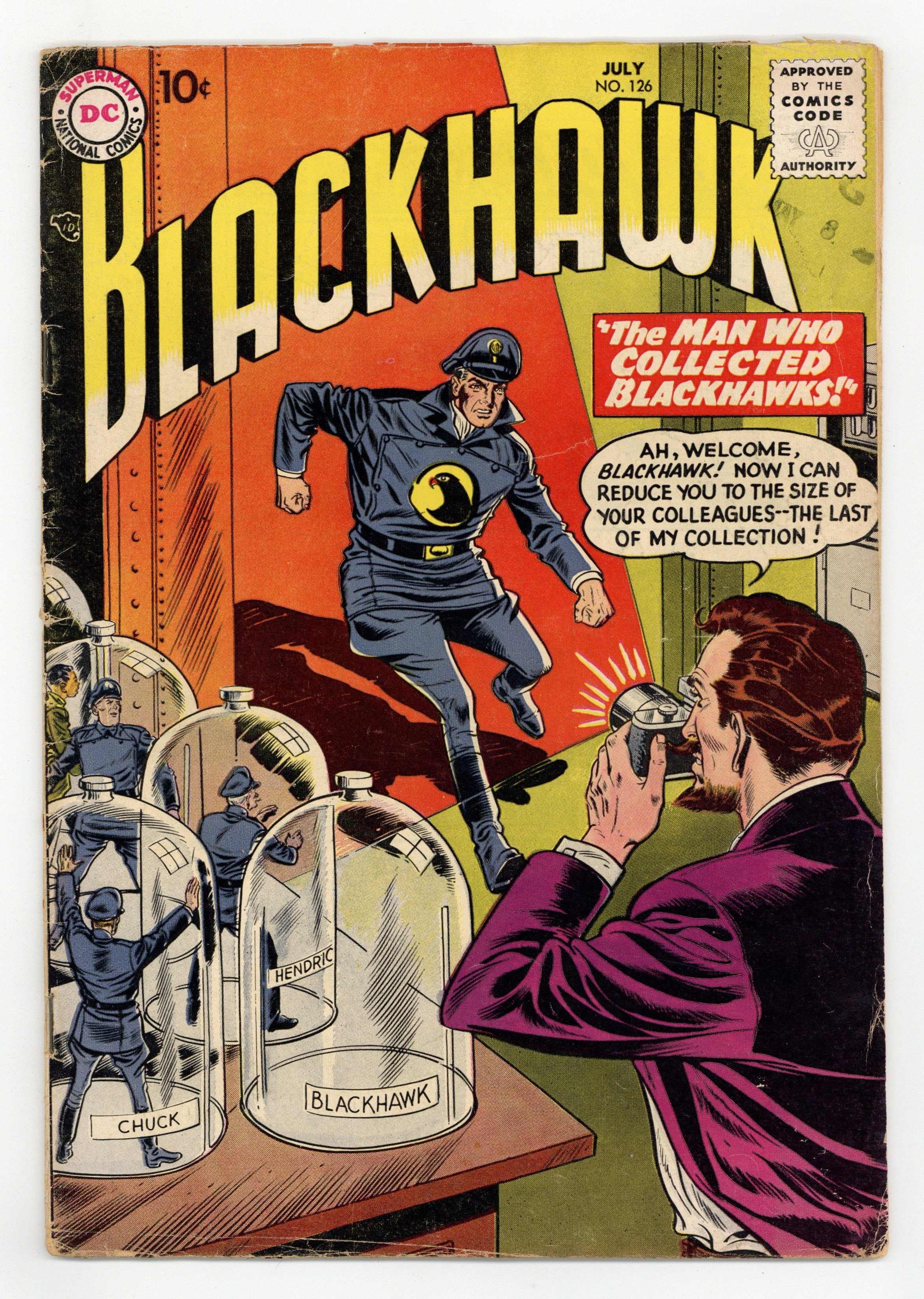 Cover by Dick Dillin and Charles Cuidera. Featuring: 8 page Blackhawk story "The Secret of the Glass Fort" drawn by Dick Dillin and Charles Cuidera; 8 page Blackhawk story "Hendrickson, King for a Day" drawn by Dick Dillin and Charles Cuidera; 2 page reprint story "Pike's Peak Gold Rush" written by Gardner Fox and drawn by Irwin Hasen & Bob Lander; 8 page Blackhawk story "The Man Who Collected Blackhawks" drawn by Dick Dillin and Charles Cuidera. Cover price $0.10.