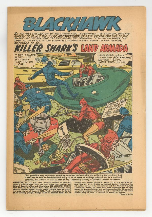 Cover by Dick Dillin & Charles Cuidera. Stories by Dave Wood, Jack Miller and unknown. Art by Dick Dillin, Charles Cuidera and Sheldon Moldoff. Three stories! "Killer Shark's Land Armada" - Killer Shark uses decoys to commit crimes on land. Plus: "The Wedding of Lady Blackhawk" - Zinda and Blackhawk get married, but the rest of the Blackhawks are jealous. And: "The Clown Prince of Crime" - Jo-Jo the clown decides to use clown stunts to disrupt the theatre, movies and television because he blames them for the decline of circuses. Also: 1-page text story "Tide of Victory"! 32 pages, full color. Cover price $0.10.
