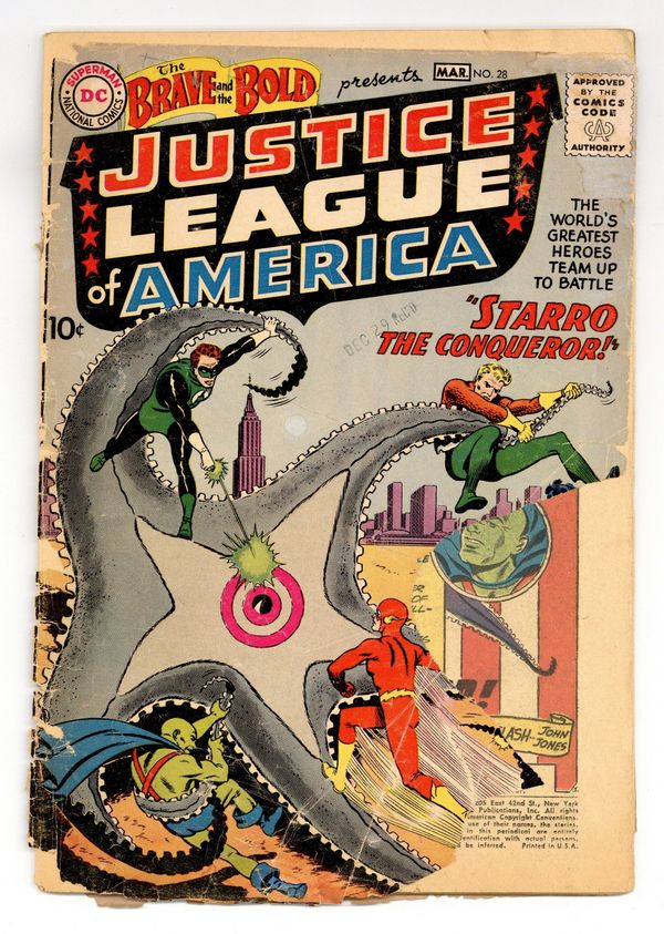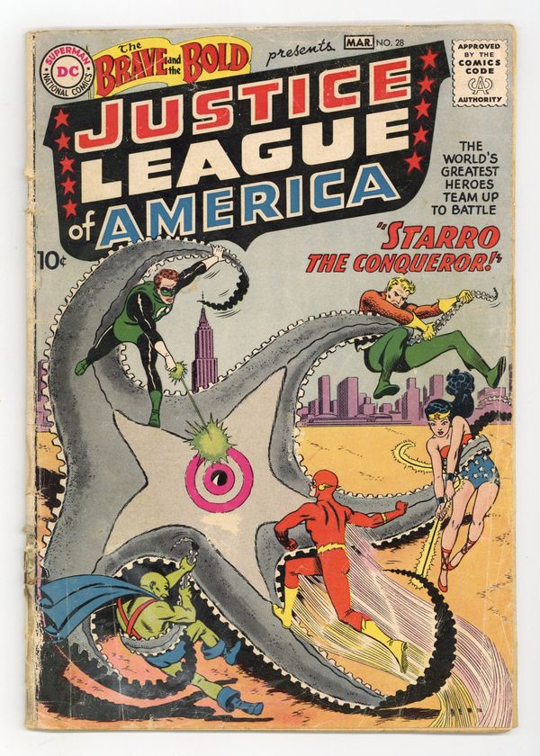 Starts Jan 3 Cover by pencils Mike Sekowsky, inks by Murphy Anderson. First appearance of Justice League of America, Starro, and Snapper Carr in "Starro the Conqueror!", script by Gardner Fox, pencils by Mike Sekowsky, inks by Bernard Sachs, Joe Giella, and Murphy Anderson; Peter the Puffer Fish alerts Aquaman to an attack on Earth from an alien starfish named Starro the Conqueror; Starro has altered three ordinary starfish into his lieutenants; Aquaman alerts his friends Wonder Woman, Superman, Green Lantern, Batman, Flash, and J'onn J'onzz; Though Superman and Batman are too busy to attend, the rest meet and split up into teams. It's Fun to Help Others! public service announcement with Superboy by Jack Schiff, art by Curt Swan and Stan Kaye. Starro vs. Green Lantern, script by Gardner Fox, pencils by Mike Sekowsky, inks by Joe Giella; One of Starro's lieutenants steals and explodes an atomic bomb to absorb its power. Starro vs. Wonder Woman and John Jones, script by Gardner Fox, pencils by Mike Sekowsky, inks by Bernard Sachs. Starro vs. the Flash!, script by Gardner Fox, pencils by Mike Sekowsky, inks by Murphy Anderson. Starro vs. Justice League of America, script by Gardner Fox, pencils by Mike Sekowsky, inks by Bernard Sachs. 36 Pages, Full Color. Cover price $0.10.