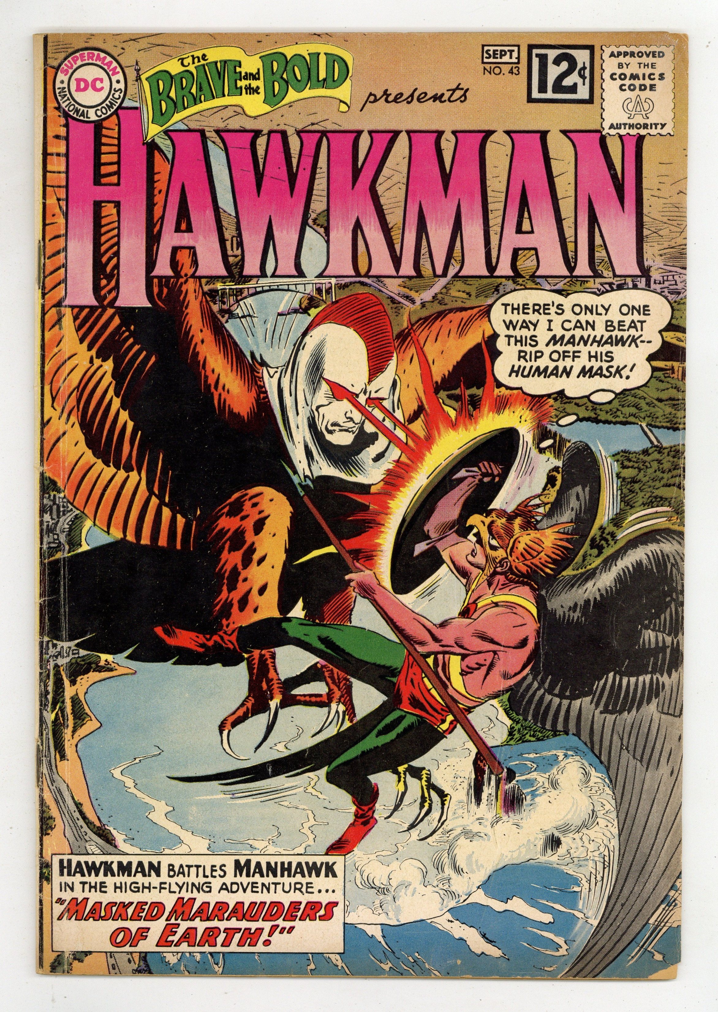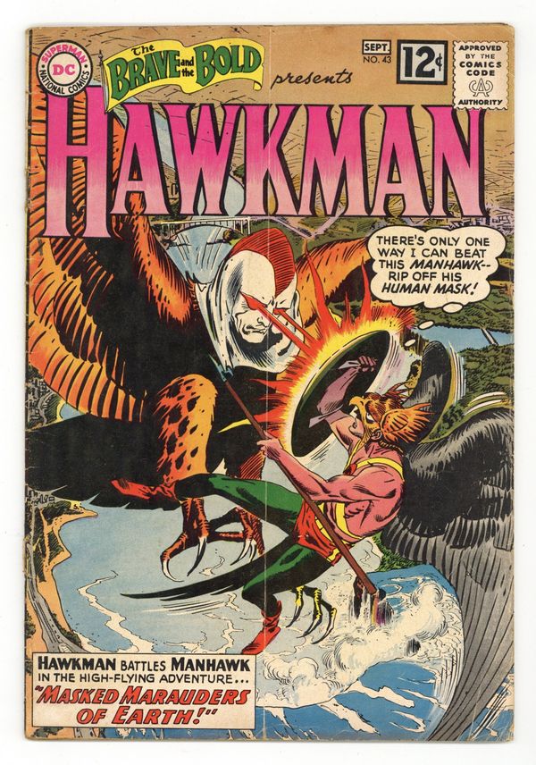 Cover by Joe Kubert. Hawkmans origin in "The Masked Marauders of Earth!", script by Gardner Fox, art by Joe Kubert; On Thanagar, Hawkman receives word that the Manhawks are committing crimes in Midway City, which leads him to remember how the Manhawks were originally responsible for the establishment for the Thangarian police force by his father; Hawkman and Hawkgirl return to Earth to defeat the Manhawks again. 36 Pages, Full Color. Cover price $0.12.