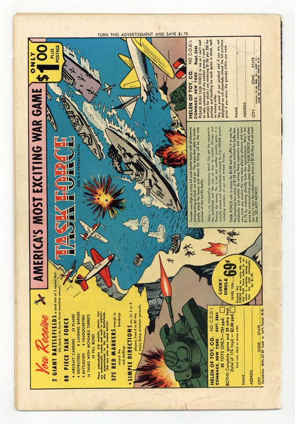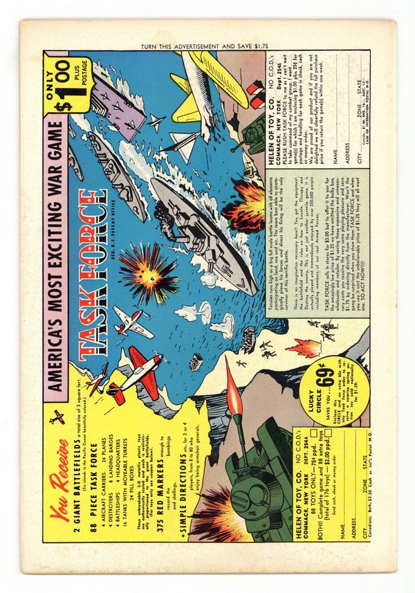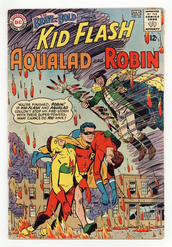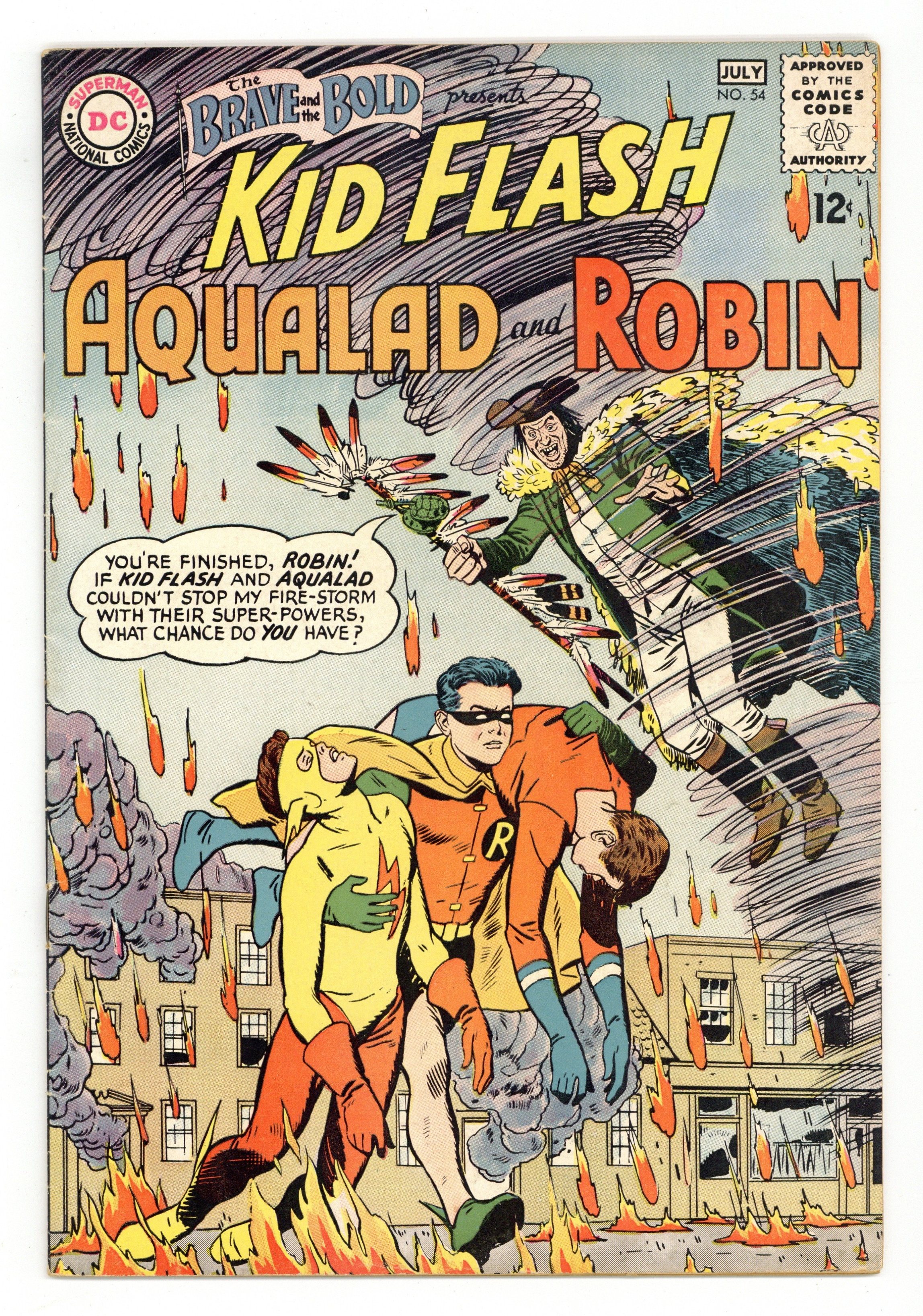 Cover by Bruno Premiani. 1st appearance and origin of the Teen Titans (Robin, Kid Flash, Aqualad) in "The Thousand-and-One Dooms of Mr. Twister," script by Bob Haney, art by Bruno Premiani; The townsfolk of Hatton Corners is in the midst of a dispute; The adults of the neighborhood feel that the teen populace are too wild and unruly, whereas the teens feel that the adults are too "un-hip" and incapable of relating to teenage problems; Ironically, the teen youth movement is led by Eddie Corliss, son of the town's mayor; Eddie organizes a club house meeting and invites three famous teen super-heroes to come to Hatton Corners to support their cause; They invite Aqualad, Kid Flash and Robin; Before the heroes arrive however, a crazed super-villain known as Mister Twister blusters through town riding atop a giant cyclone. Cap's Hobby Center by Henry Boltinoff. 36 Pages, Full Color. Cover price $0.12.