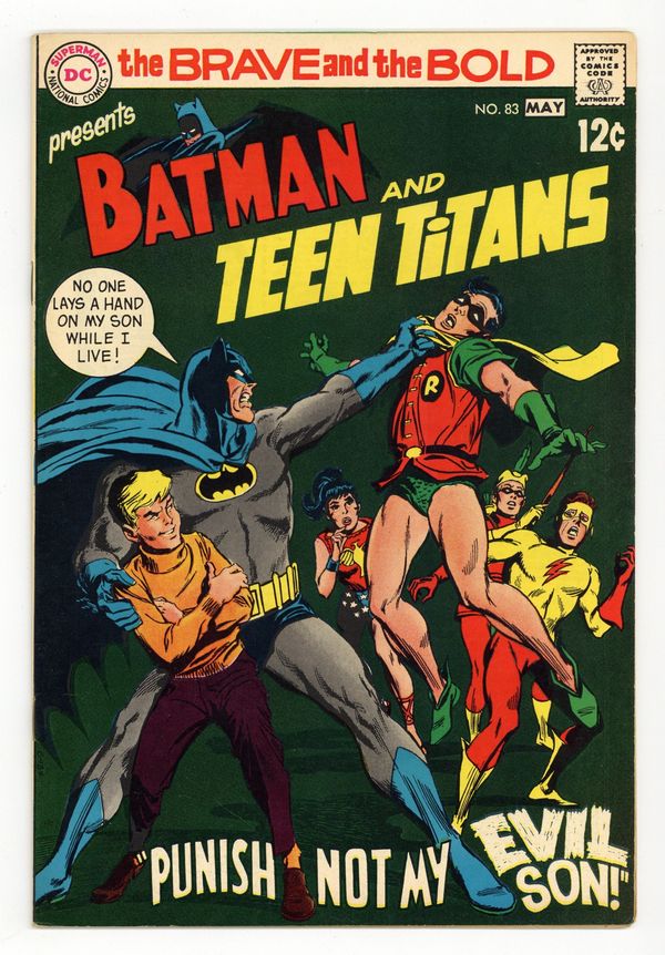 Batman and the Teen Titans star in "Punish Not My Evil Son." Due to a promise Bruce's father had made to his friend to take care of his child, Lance Bruner arrives in the life of Bruce Wayne as his new ward. Dick and the rest of the Titans try to help Lance mend his delinquent ways, but Lance resists. When he finds out that Bruce and Dick are really Batman and Robin, Lance believes he can cash in on this knowledge. Characters: Batman; Teen Titans [Robin [Dick Grayson]; Speedy [Roy Harper]; Wonder Girl [Donna Troy]; Kid Flash [Wally West]]; Alfred Pennyworth; Lance Bruner; Grantland Stark; Milo Manton; Charles Hinton. Written by Bob Haney, with art by Neal Adams. Cover by Irv Novick. 36 Pages, Full Color. Cover price $0.12.
