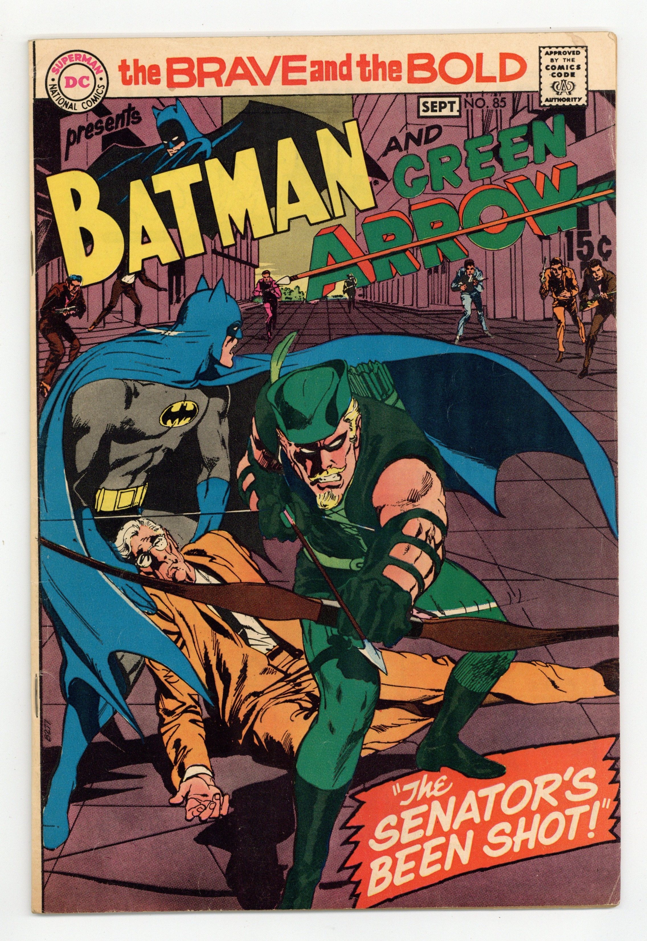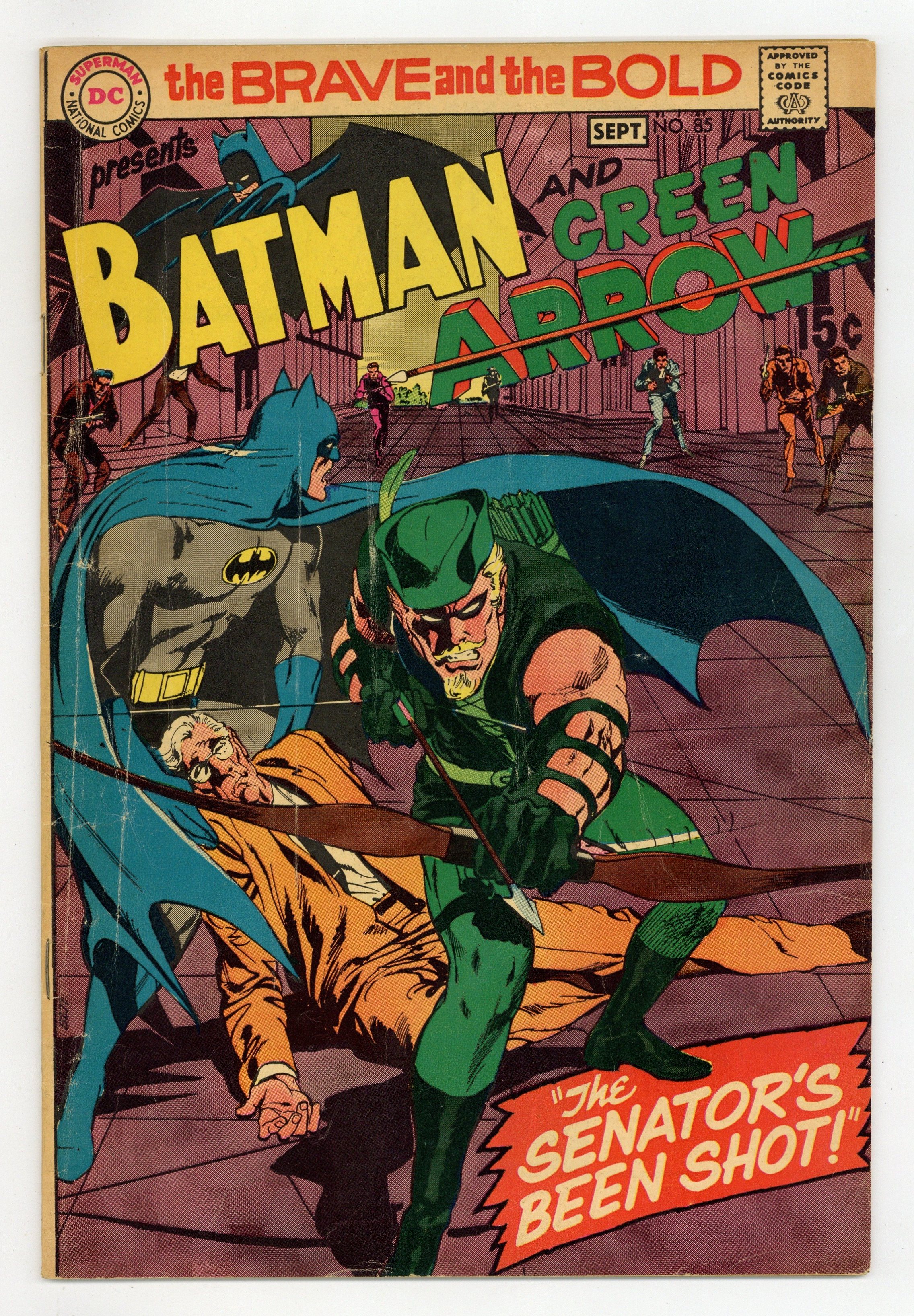First 15-cent cover price. Cover by Neal Adams. "The Senator's Been Shot!", script by Bob Haney, art by Neal Adams; When the newly voted senator for Gotham City is shot before he can vote on a important anti-crime bill, Bruce Wayne is selected to finish the rest of the Senator's term during his recovery so that the crucial deciding vote for the bill be made; Meanwhile, as Batman, Bruce attempts to find out who was responsible for having the senator shot and along the way teams up with the Green Arrow to bring the shooter to justice, just in time for Bruce to vote in favor of the crime bill. First appearance of the new Green Arrow costume. One-page Adams biography written by his wife. 36 Pages, Full Color. Cover price $0.15.