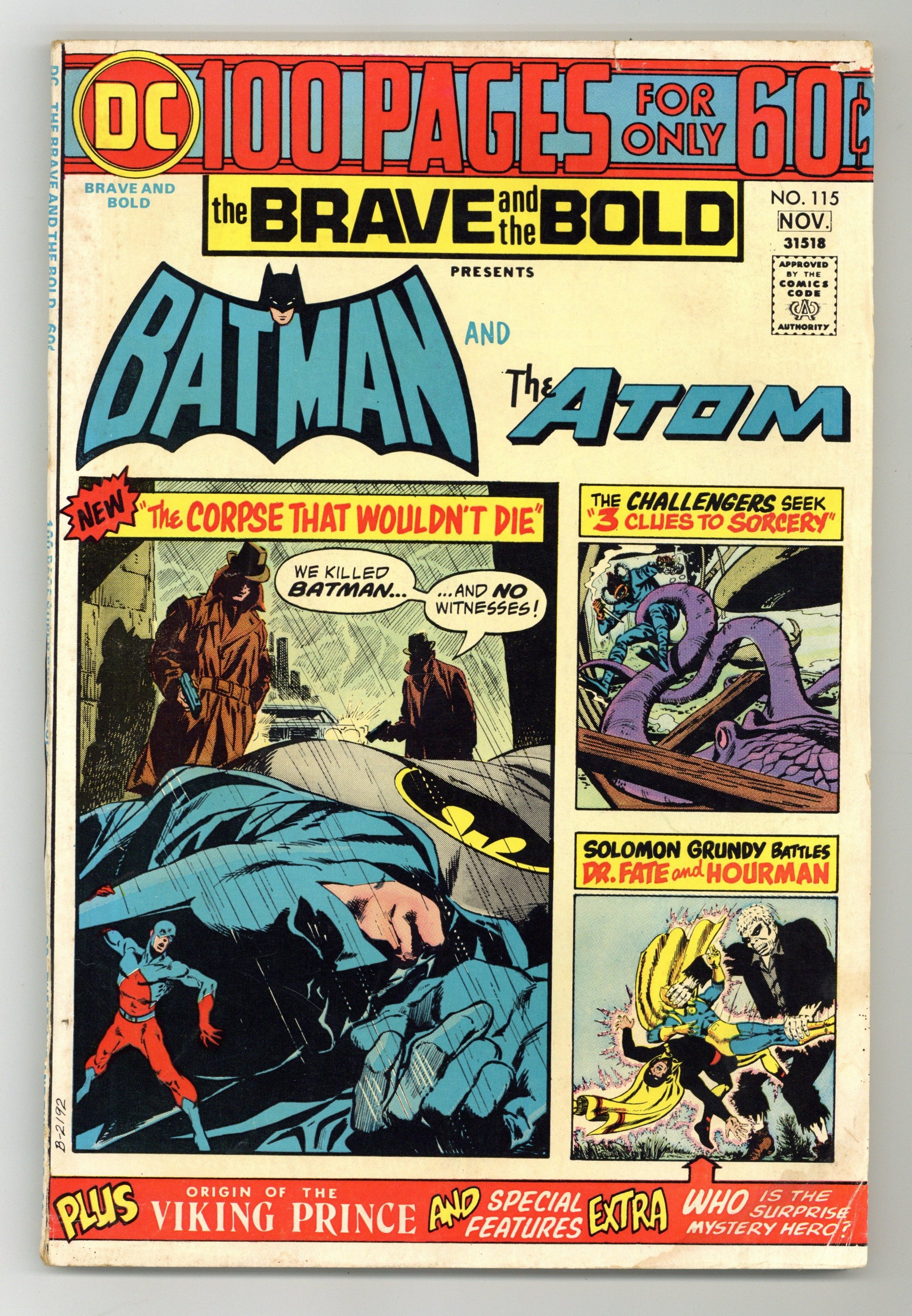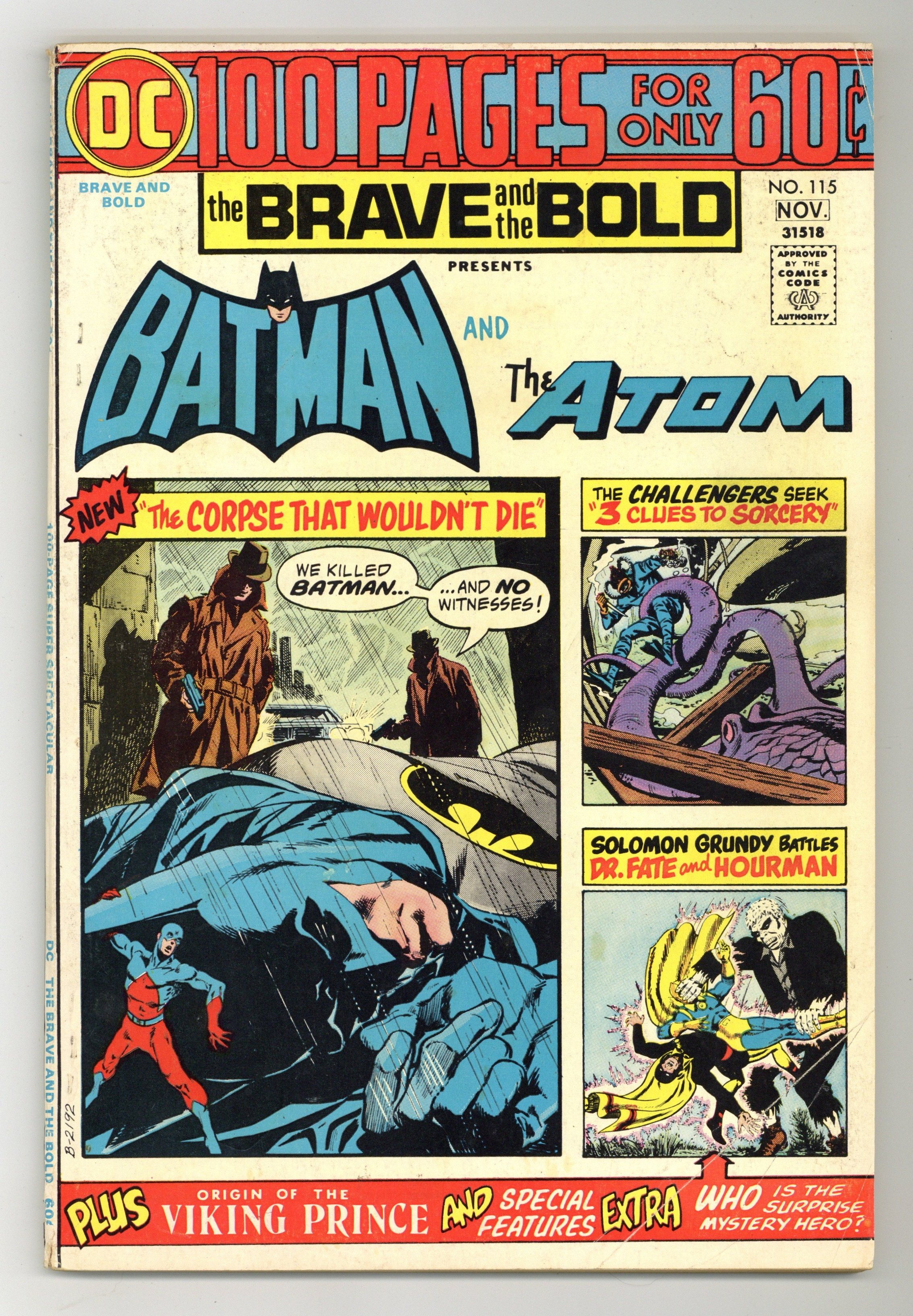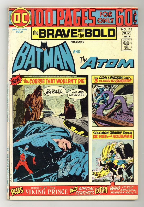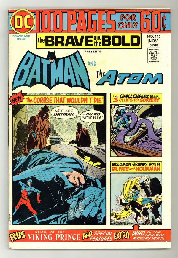 Cover by Jim Aparo, Bob Brown, and Murphy Anderson. "The Corpse That Wouldn't Die!", script by Bob Haney, art by Jim Aparo; When Batman is electrocuted and declared brain dead while on the trail of the kidnapped Debbie Manton, the Atom must enter the detective's brain and reactivate it to finish the case and in doing so restores the Batman's brain to normal functioning. Reprint back-up stories: "The Three Clues to Sorcery," pencils by Bob Brown, inks by Bob Brown; A mad professor, and his men, kidnap June Robbins in order to have the Challengers collect three different mystical stones; However, the Challengers turn the tables when they use the power of the stones to overpower the kidnappers and rescue June. "Solomon Grundy Goes on a Rampage!" starring Hourman, Dr. Fate, and Green Lantern (Alan Scott), script by Gardner Fox, art by Murphy Anderson. "Origin of the Viking Prince!" (from Brave and Bold 23), script by Bob Haney, art by Joe Kubert. "The Case of the Innocent Thief" starring the Atom, script by Gardner Fox, pencils by Gil Kane, inks by Murphy Anderson. 100 Pages, Full Color. Cover price $0.60.