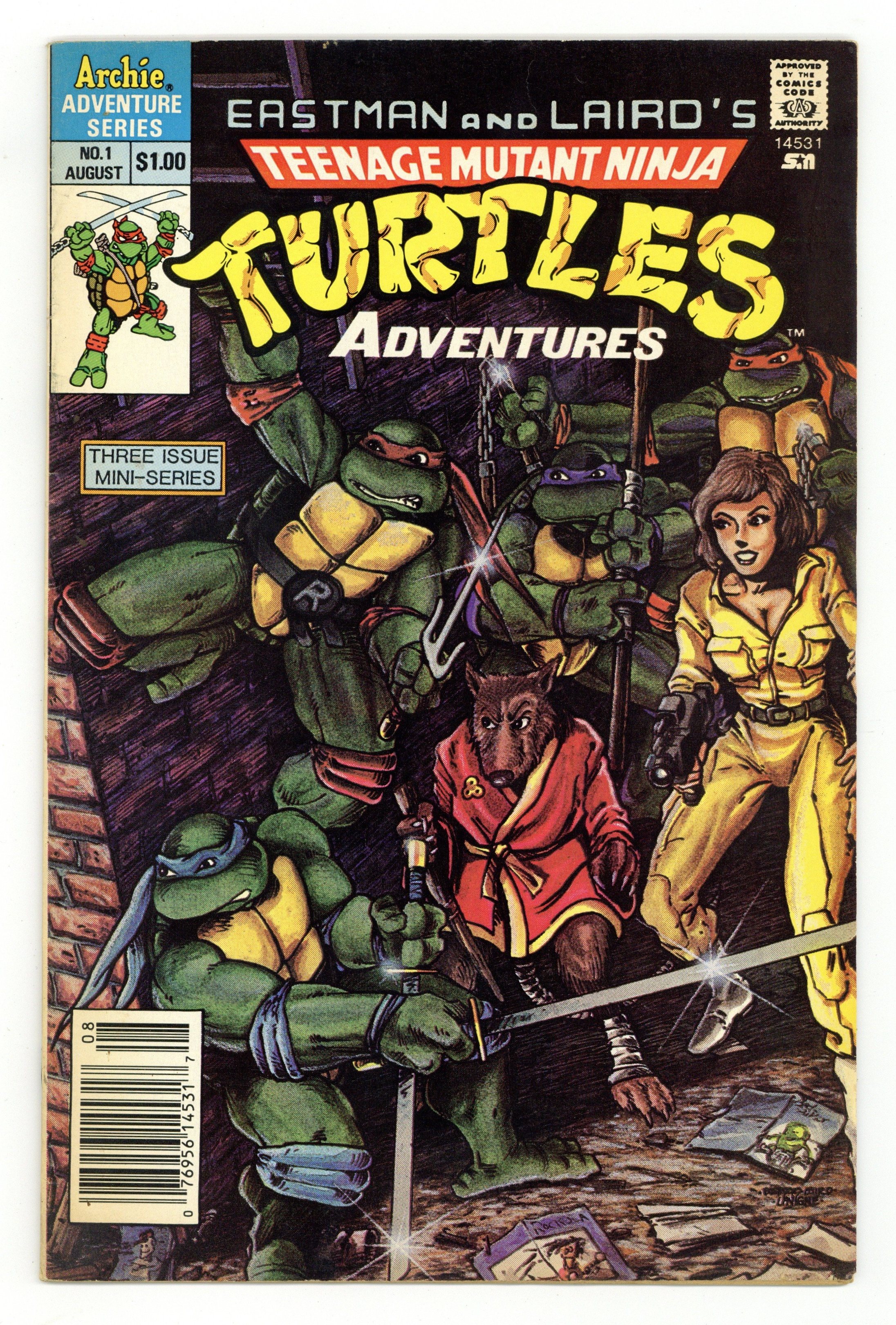 Published Aug 1988 by Archie Publications.$40.00Newsstand Edition. Story by Michael Dooney, David Wiser, and Patti Howeth. Art by Michael Dooney and David Garcia. Cover by Kevin Eastman and Peter Laird. Cover price $1.00.