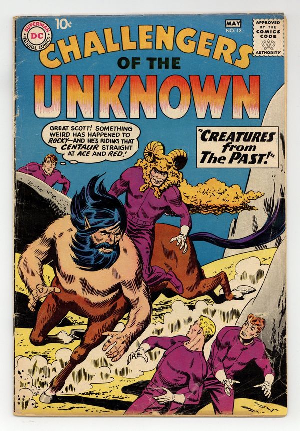 $33.00"The Prisoner of the Tiny Space Ball." The Challengers free an alien from confinement and then help him liberate his planet from a ruthless tyrant. "The Creatures from the Past." The Challengers, June Robinson, and a scientist search for the legendary Golden Fleece. Art and cover by Bob Brown. Cover price $0.10.