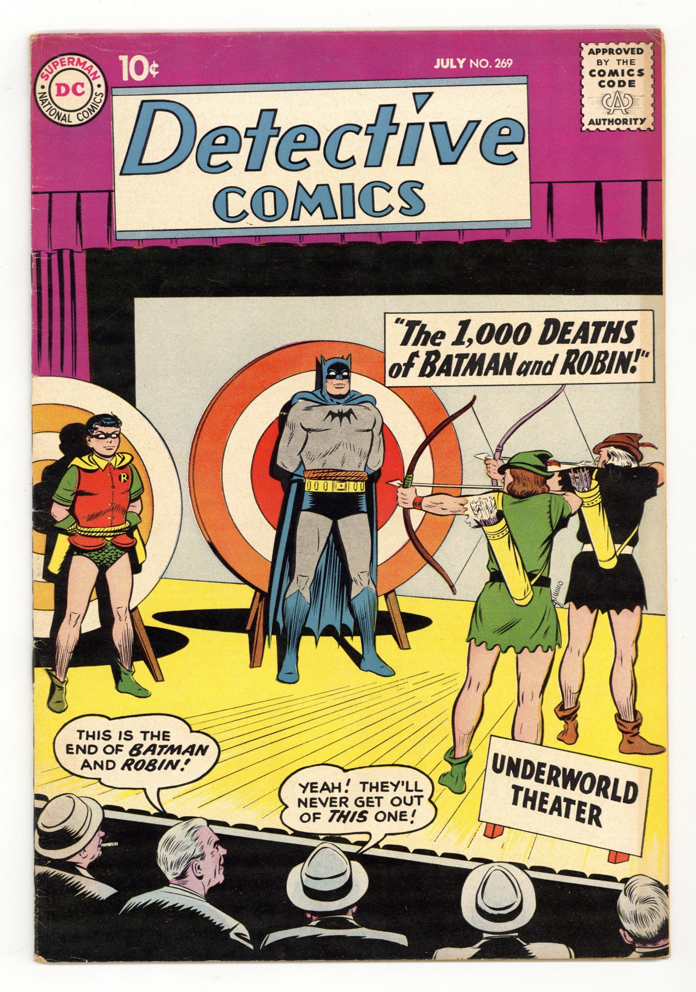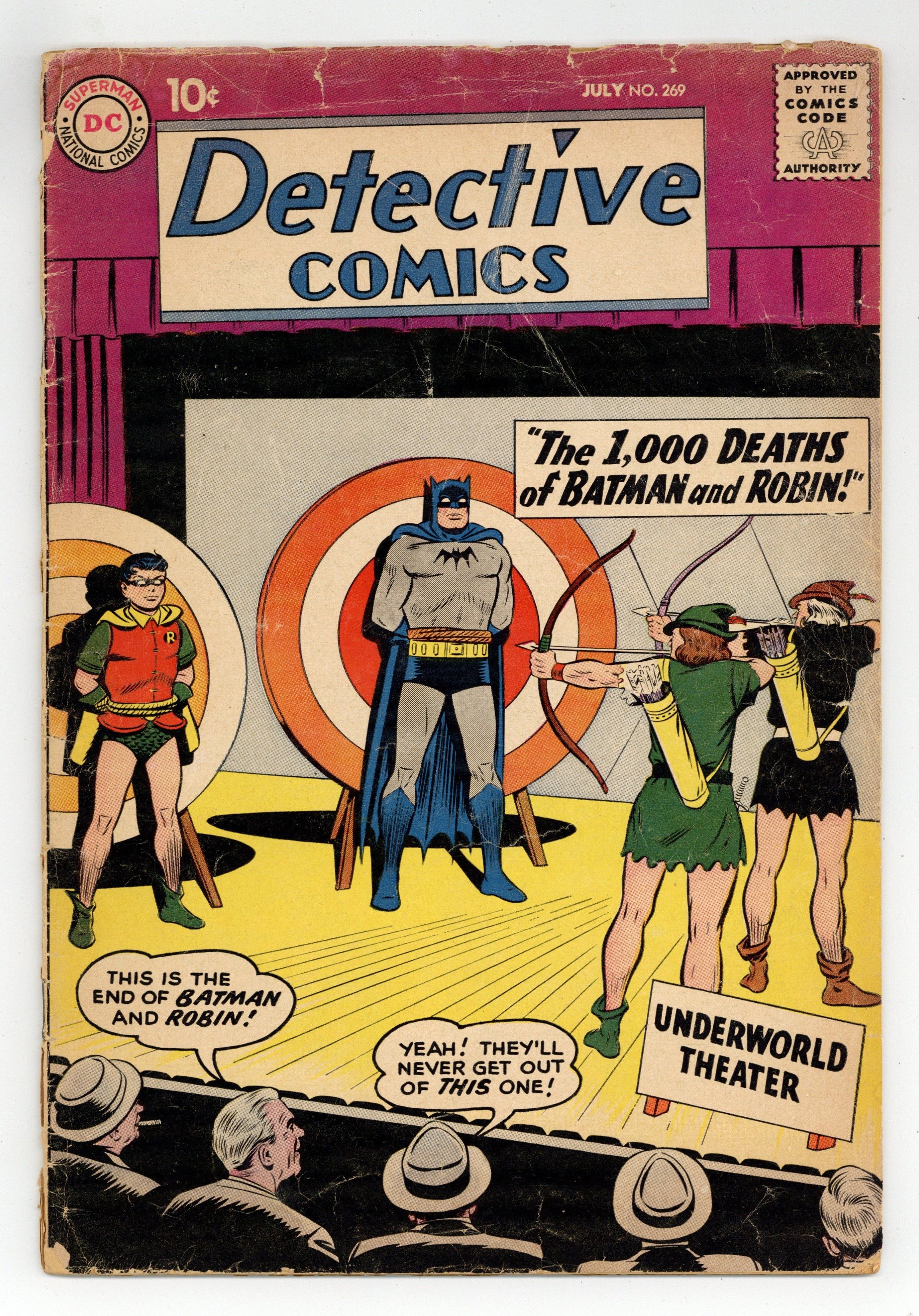 Starts Dec 8 Cover pencils by Curt Swan, inks by Stan Kaye. "The Thousand Deaths of Batman!" starring Batman and Robin, pencils by Sheldon Moldoff, inks by Charles Paris; A criminal director, for a price, stages plays for the underworld in which Batman and Robin actors are "killed," until the real Batman and Robin take the crook-actors places; After a few performances, the director becomes suspicious and finally learns the truth; During the night in which the leader of the gangsters is among the audience, the director has prepared deadly traps on stage to eliminate the Dynamic Duo. Warden Willis two-page humor by Henry Boltinoff. "The Menace of the Magnetic Meteorite!" starring Roy Raymond TV Detective, art by Ruben Moreira; Roy vs. Borgal. Half-page Casey the Cop story by Henry Boltinoff. "The Man Who Exposed John Jones" starring John Jones Manhunter from Mars, art by Joe Certa; A former film executive is operating a blackmail racket, and he thinks he can blackmail Detective Jones with proof he is a Martian. 36 pgs., full color. Cover price $0.10.