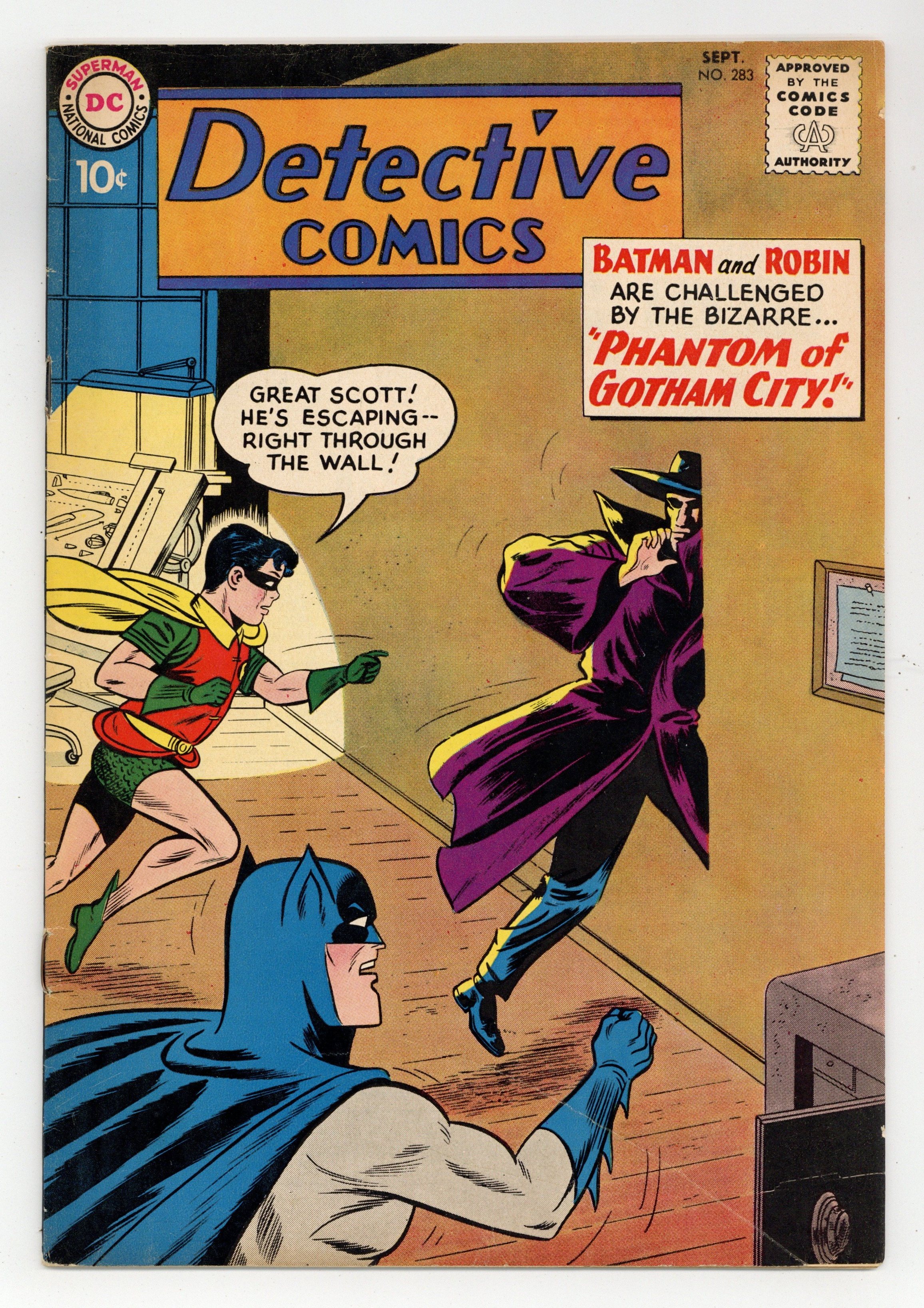 Cover art by Sheldon Moldoff. "The Phantom of Gotham City" starring Batman and Robin, pencils by Sheldon Moldoff, inks by Charles Paris; Batman and Robin face a Phantom who can walk through walls and direct strange and terrible energies at them, but who may not be a villain; When the Phantom deliberately saves Robin's life, Batman prepares a trap to learn the secret identity of the Phantom and he finally realizes that he is an alien. Bike Safety = Bike Fun! public service announcement, script by Jack Schiff, art by Bernard Baily. "Captives on the Moon" starring Roy Raymond TV Detective, art by Ruben Moreira. Half-page Lefty Looie story by Henry Boltinoff. "The Amazing One-Man Crew" starring John Jones Manhunter from Mars, script by Jack Miller, art by Joe Certa; Manhunter volunteers to crew a cargo ship single-handedly after the real crew quits because of a jinx. 36 pgs., full color. Cover price $0.10.