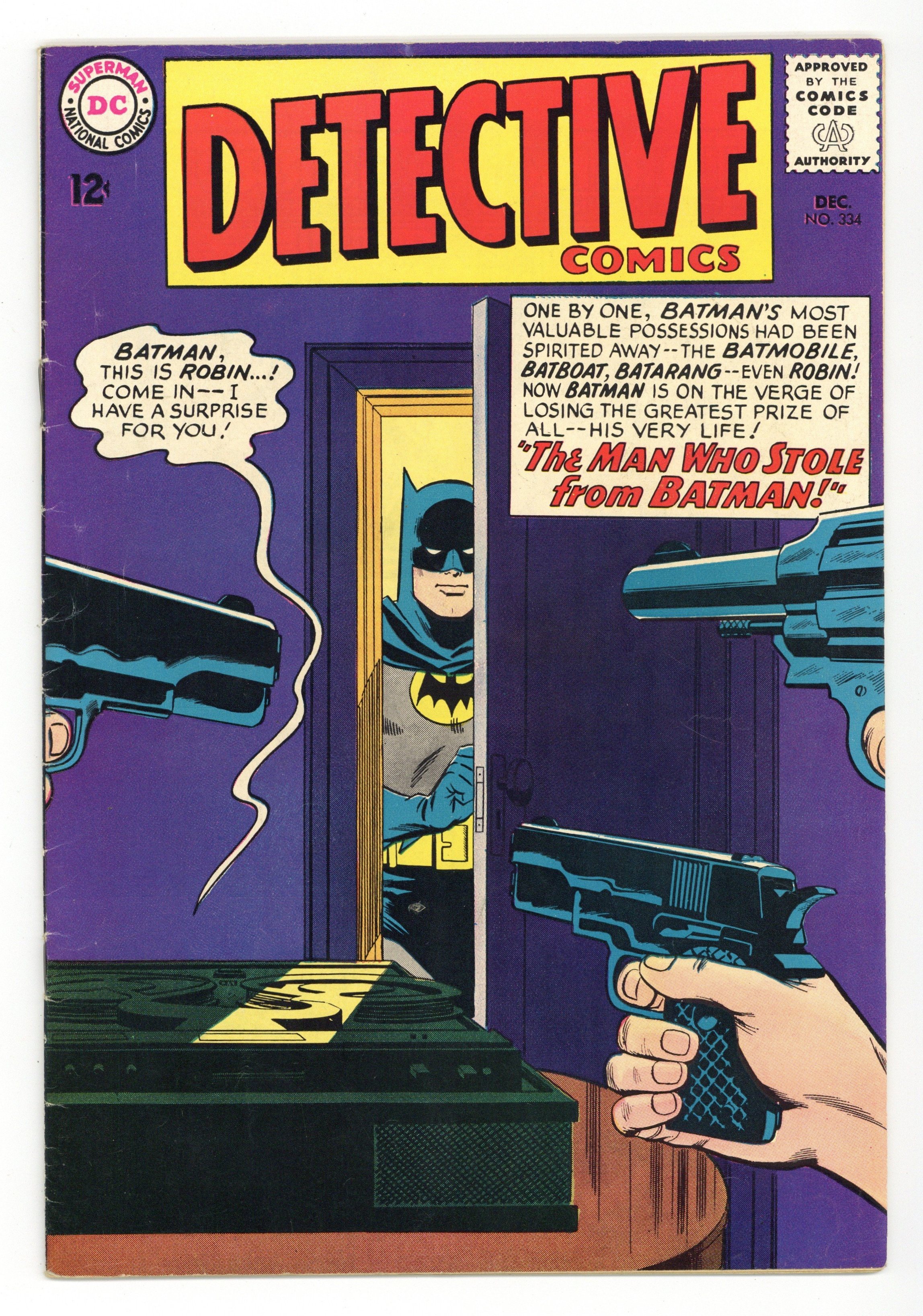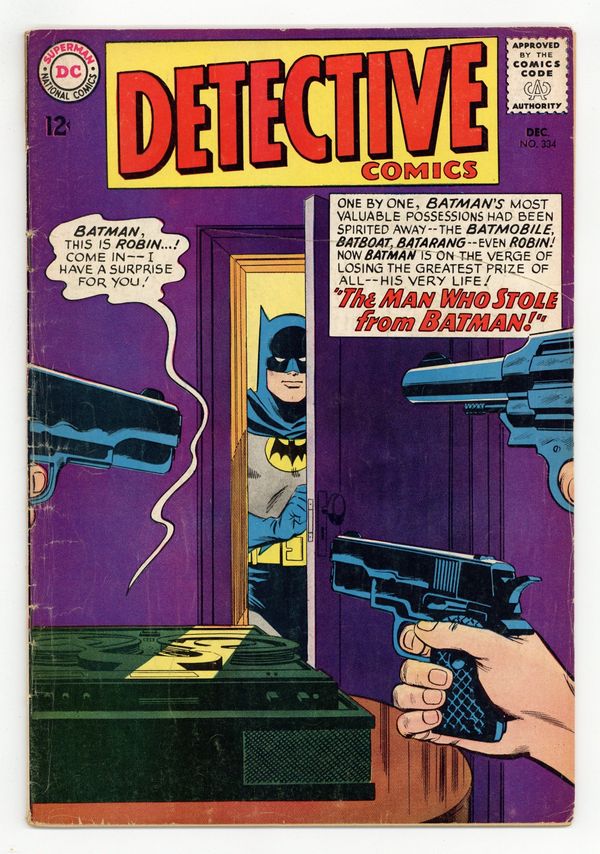 Written by Gardner F. Fox. Art by Sheldon Moldoff (ghost for Bob Kane) and Joe Giella. Cover by Carmine Infantino and Joe Giella. The Man Who Stole from Batman!; A new and unusual villain makes him presence known by stealing from the Batman: his Batmobile, Bat-a-Rang, and Bat-Boat, yet Batman cannot figure out WHY he would do such a thing; 1st appearance of the Outsider. Written by Gardner F. Fox. Art by Carmine Infantino and Sid Greene. Battle of the Elongated Weapons! starring Ralph Elongated Man Dibny. Casey the Cop humor page by Henry Boltinoff. Children of Tomorrow! public service announcement by Jack Schiff, art by Bernard Baily. Rocky and Bullwinkle star in a one-page Cheerios ad. 36 pages, full color. $0.12. Cover price $0.12.