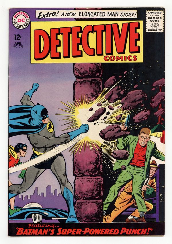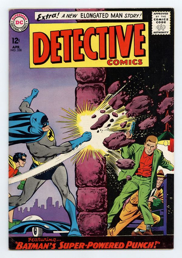 Written by Gardner Fox. Art by Sheldon Moldoff (as ghost for Bob Kane) and Joe Giella. Cover by Carmine Infantino and Joe Giella. Batman's Power-Packed Punch!; A chemical spills on Bruce Wayne, giving Batman super strength in his right arm; Batman punches a wrecking ball away; a crook deduces that Bruce and Batman are the same person, but doesnt tell anyone. Written by Gardner Fox. Art by Carmine Infantino and Sid Greene. Case of the Curious Compass! starring Elongated Man. The Greatest Robberies of All Time! article by Julius Schwartz, art by Morris Waldinger and Tom Nicolosi. Warden Willis humor page by Henry Boltinoff. Letter to the editor from comics writer Mike Friedrich. Are You a Silent Witness? public service announcement by Jack Schiff, art by Sheldon Moldoff. 36 pages, full color. $0.12. Cover price $0.12.