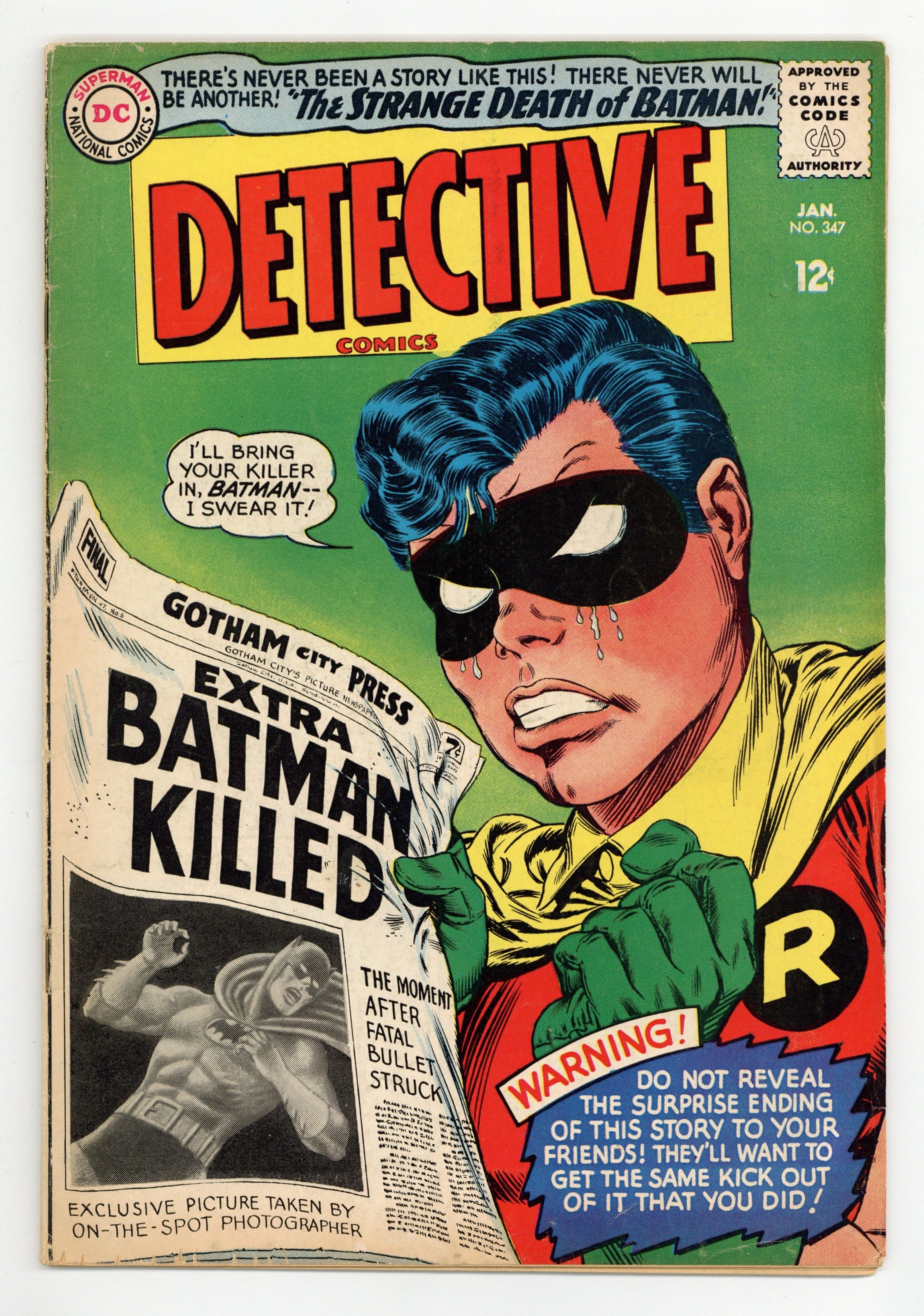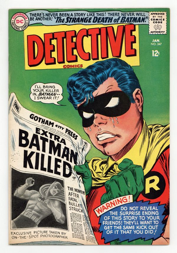 Written by Gardner Fox. Art by Carmine Infantino and Joe Giella. Cover by Carmine Infantino and Murphy Anderson. The Strange Death of Batman!; Batman and Robin put an end to the crime spree of the Bouncer by taking away his costume's properties of elasticity; But writer Gardner Fox wonders how the story would have turned out differently if Batman had been killed by the Bouncer and Robin had had to come up with a way to neutralize the Bouncer's abilities. Written by Gardner Fox. Art by Carmine Infantino and Sid Greene. The Man Who Hated Money!; A thief tears up the money he steals, spurring the Elongated Man into action. Casey the Cop humor page by Henry Boltinoff. Letter to the editor from comics writer Mike Friedrich. Rocky and Bullwinkle star in a one-page Cheerios ad. 36 pages, full color. $0.12. Cover price $0.12.