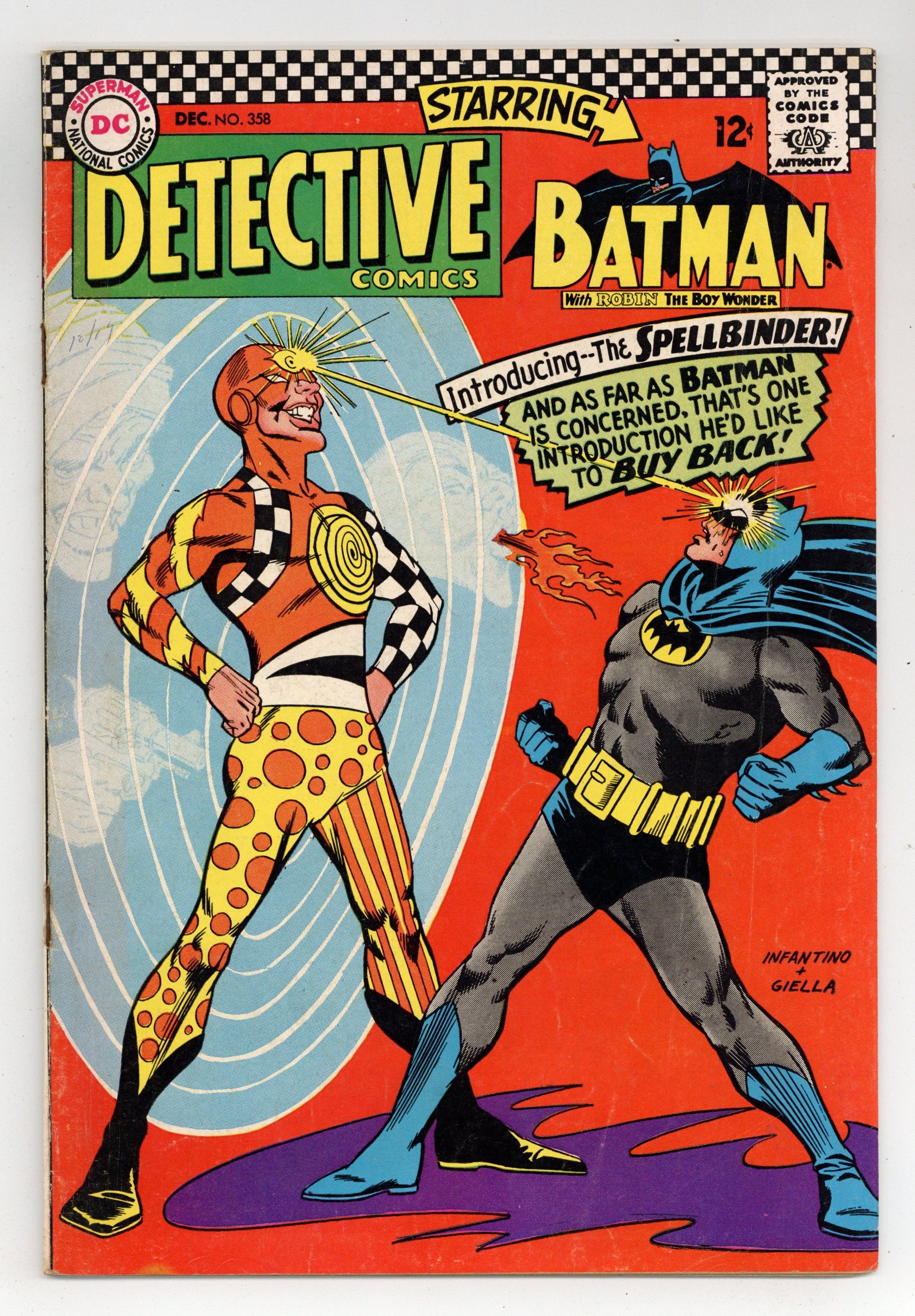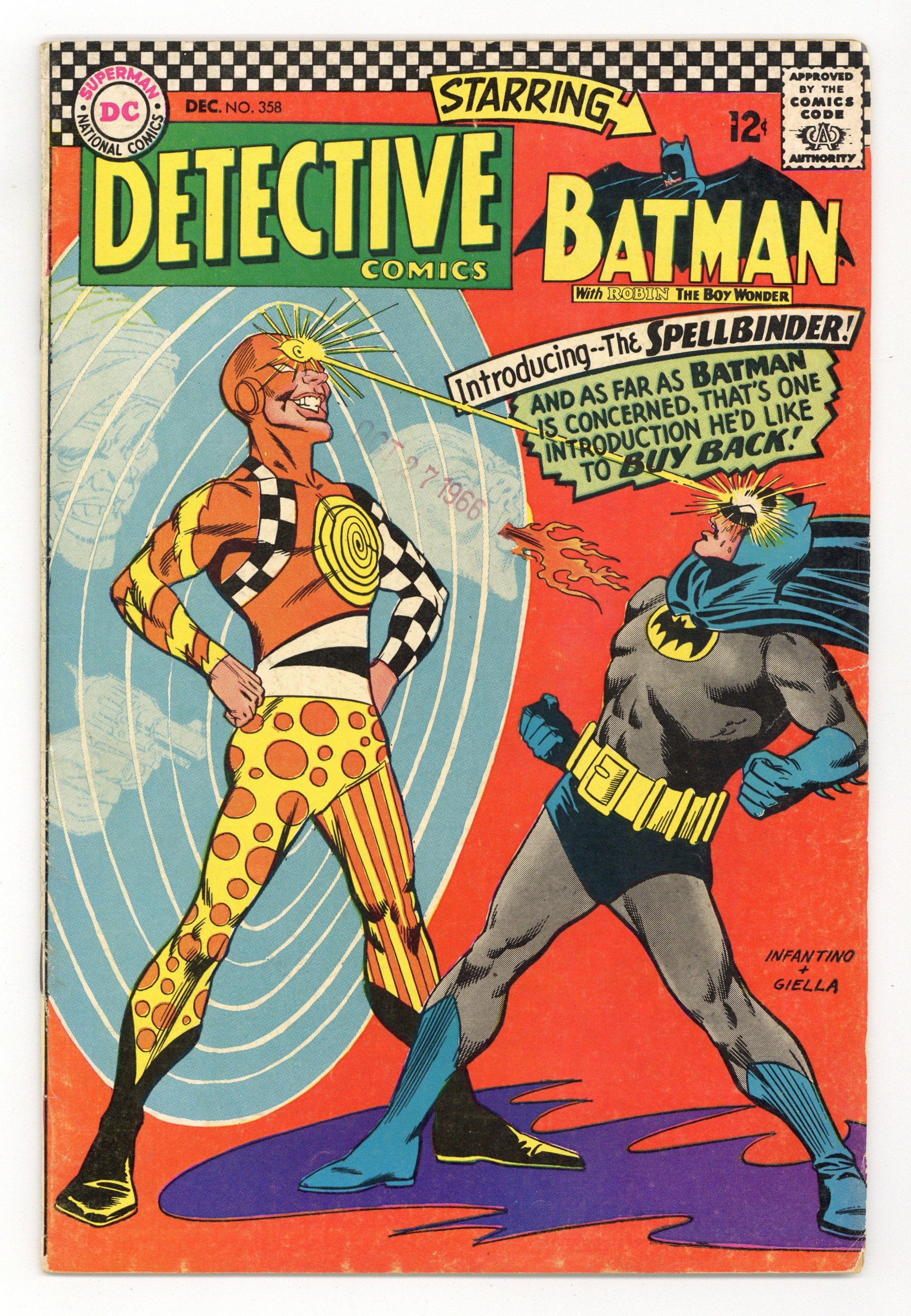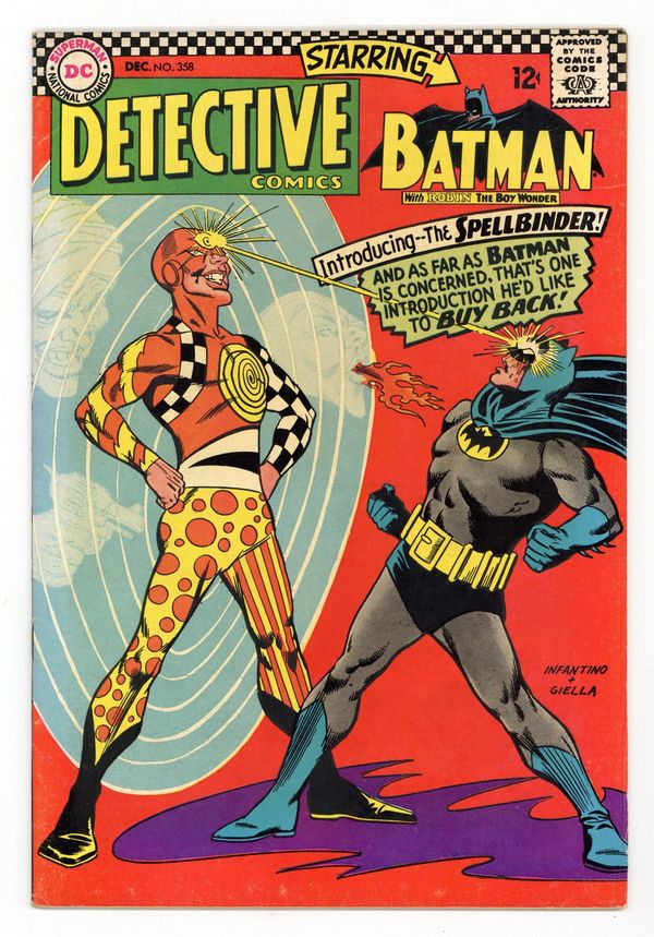 Written by John Broome. Art by Sheldon Moldoff (ghosting for Bob Kane) and Joe Giella. Cover by Carmine Infantino and Joe Giella. The Circle of Terror!; Batman and Robin battle Spellbinder, a new supervillain who puts Batman into a trance. Written by Gardner Fox. Art by Sid Greene. The Faker-Takers of the Baker's Dozen!; Sue Dibny is going to unveil the paintings Peter Baker at an art gallery, but the paintings are missing. Cap's Hobby Hints by Henry Boltinoff. Pennies for UNICEF! public service announcement with Superman, written by Jack Schiff, art by Sheldon Moldoff. 36 pages, full color. $0.12. Cover price $0.12.