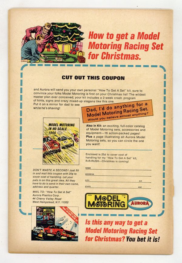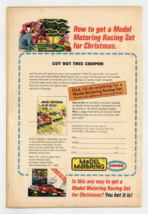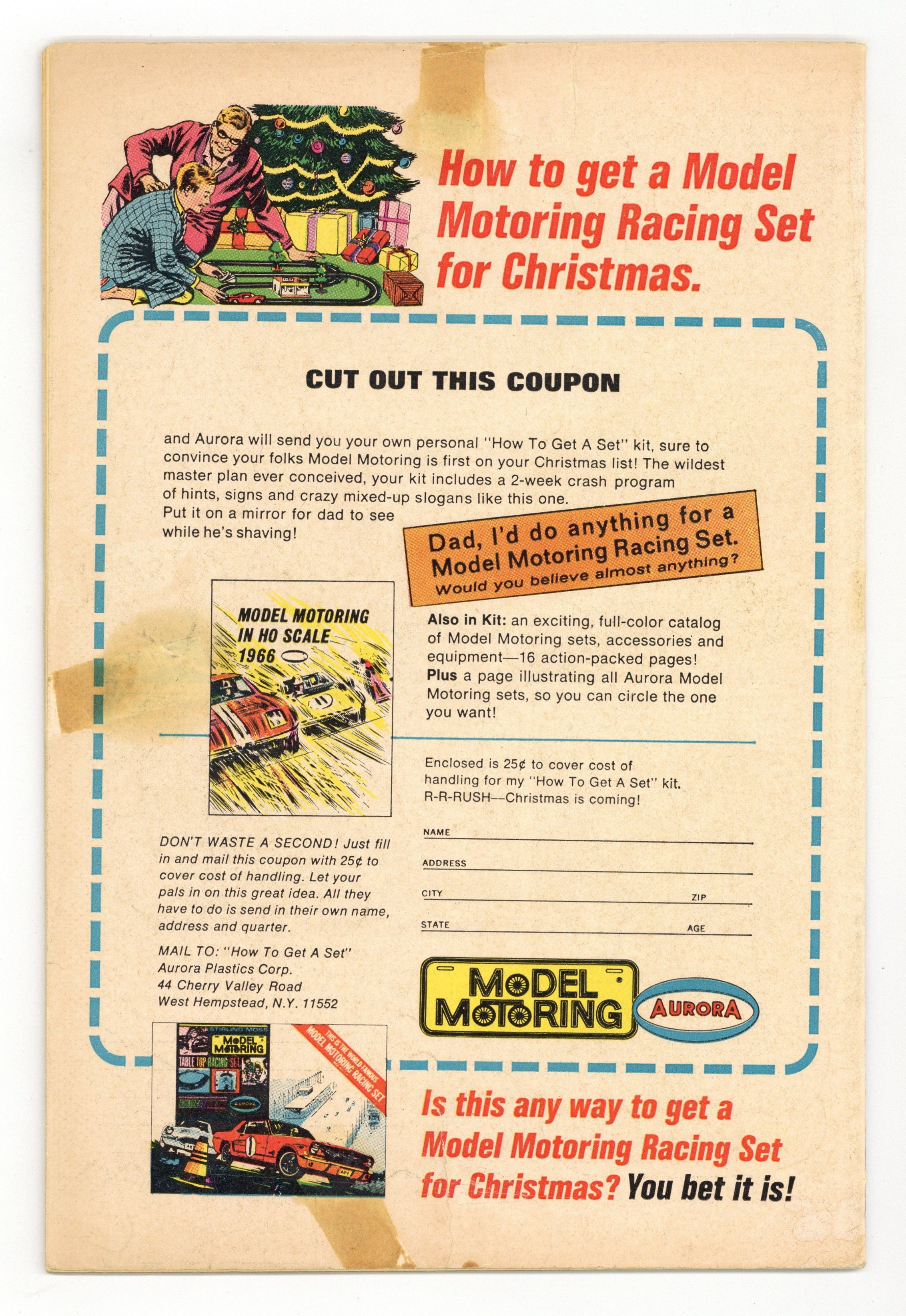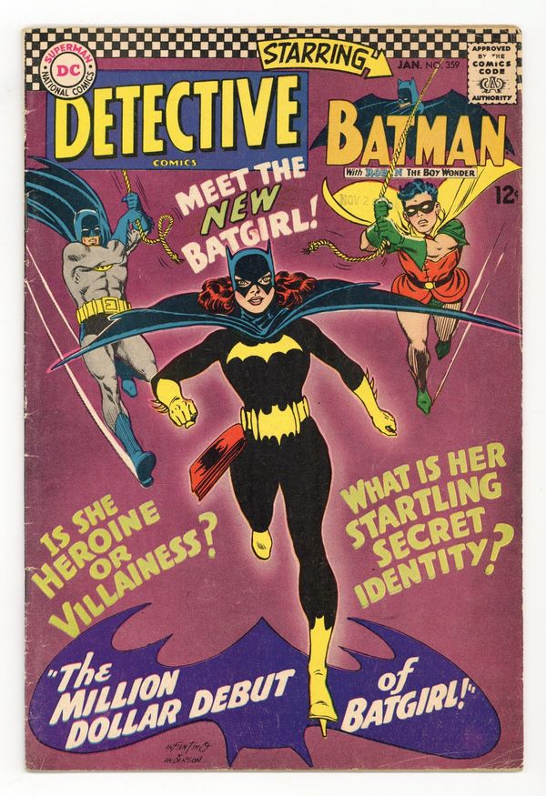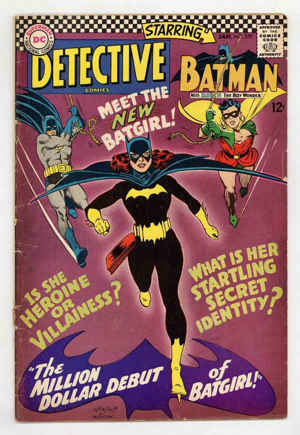 Written by Gardner Fox. Art by Carmine Infantino and Sid Greene. Cover by Carmine Infantino and Murphy Anderson. 1st appearance of the new Batgirl (Barbara Gordon) in The Million Dollar Debut of Batgirl!; Batgirl goes to a costume party dressed as Batgirl; she sees Killer Moth attack Bruce Wayne. Written by Gardner Fox. Art by Murphy Anderson. Riddle of the Sleepytime Taxi!; Ralph Elongated Man Dibny and Sue fall asleep in the back seat of a taxi while going to a costume party; Ralph discovers that crooks criminals are putting passengers to sleep to copy secret documents. Cap's Hobby Hints activity page by Henry Boltinoff. Letter to the editor from comics writer Mark Evanier. 36 pages, full color. $0.12. Cover price $0.12.