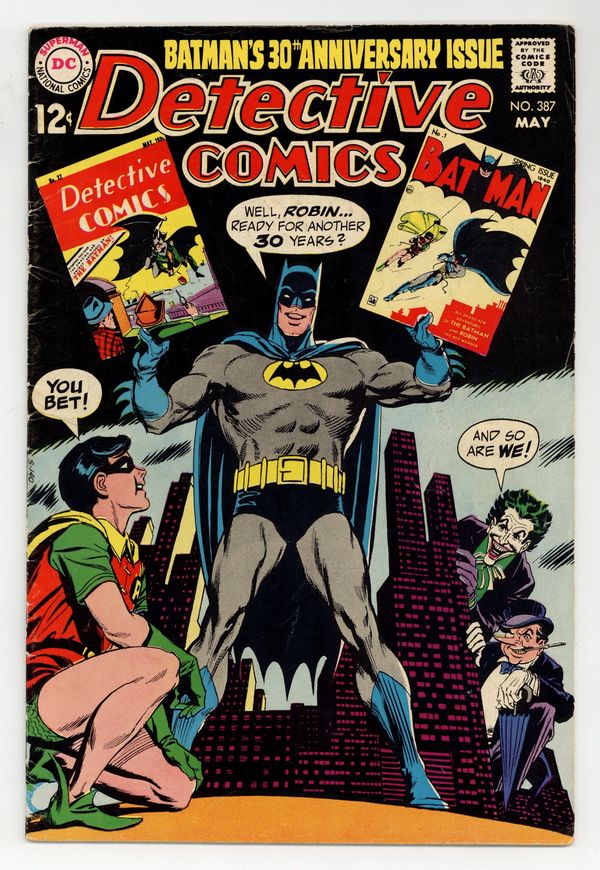 $50.0030th anniversary issue; Joker and Penguin on cover with Batman and Robin. Last 12c cover-priced issue. Cover by Irv Novick. "The Cry of the Night is – Sudden Death!", script by Mike Friedrich, pencils by Bob Brown, inks by Joe Giella; Batman and Robin swing across Gotham City; They arrive at a crime scene where the wealthy atomic chemist Lambert has been murdered with a poker in his own living room; Commissioner Gordon is accusing Lambert's hippy son Mel, whose fingerprints were found on the murder instrument. "The Case of the Chemical Syndicate," script by Bill Finger, art by Bob Kane; Commissioner Gordon relaxes at home entertaining his young socialite friend Bruce Wayne; Wayne asks if anything exciting has happened lately, and Gordon explains that a fellow called the "Bat-Man" is puzzling him; Gordon receives a call that chemical manufacturer Lambert has been found murdered. Detective Comics #27 Fact File, art by Sheldon Moldoff. Batman's Souvenir Album; Collage of various panels of Bat-items & people. Letters from comics writer Martin Pasko. 36 pgs., full color. $0.12. Cover price $0.12.