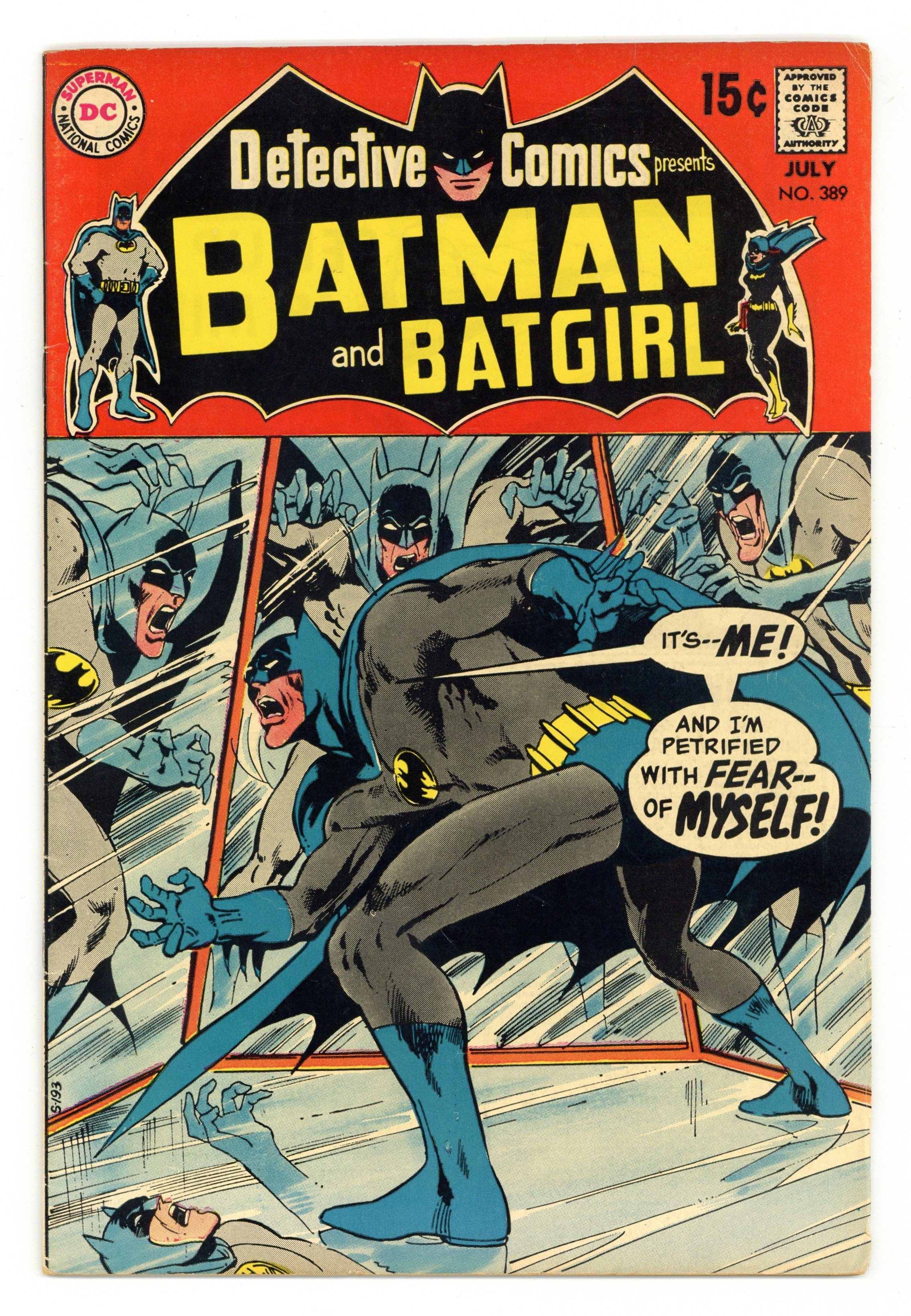 Cover by Neal Adams. "Batman's Evil Eye," script by Frank Robbins, pencils by Bob Brown, inks by Joe Giella; The Scarecrow is released from jail, and shortly thereafter Batman seems to have regained his ability to strike terror into the hearts of gangsters merely by his presence; But it is all part of a fear-trap sprung against Batman himself. "Batgirl's Bag of Tricks!," script by Frank Robbins, pencils by Gil Kane, inks by Murphy Anderson; Continuing from last issue, Batgirl is caught in the sights of a bunch of crooks masquerading as members of the Justice League at a costume party who were trying to obtain stolen jewels, however were double crossed by their partner Darlene Dawson, who had set up Barbara Gordon to take the fall little realizing that Barbara was the real Batgirl. Letters from letter hack Guy H. Lillian III and comics writer Martin Pasko. 36 pgs., full color. $0.15. Cover price $0.15.