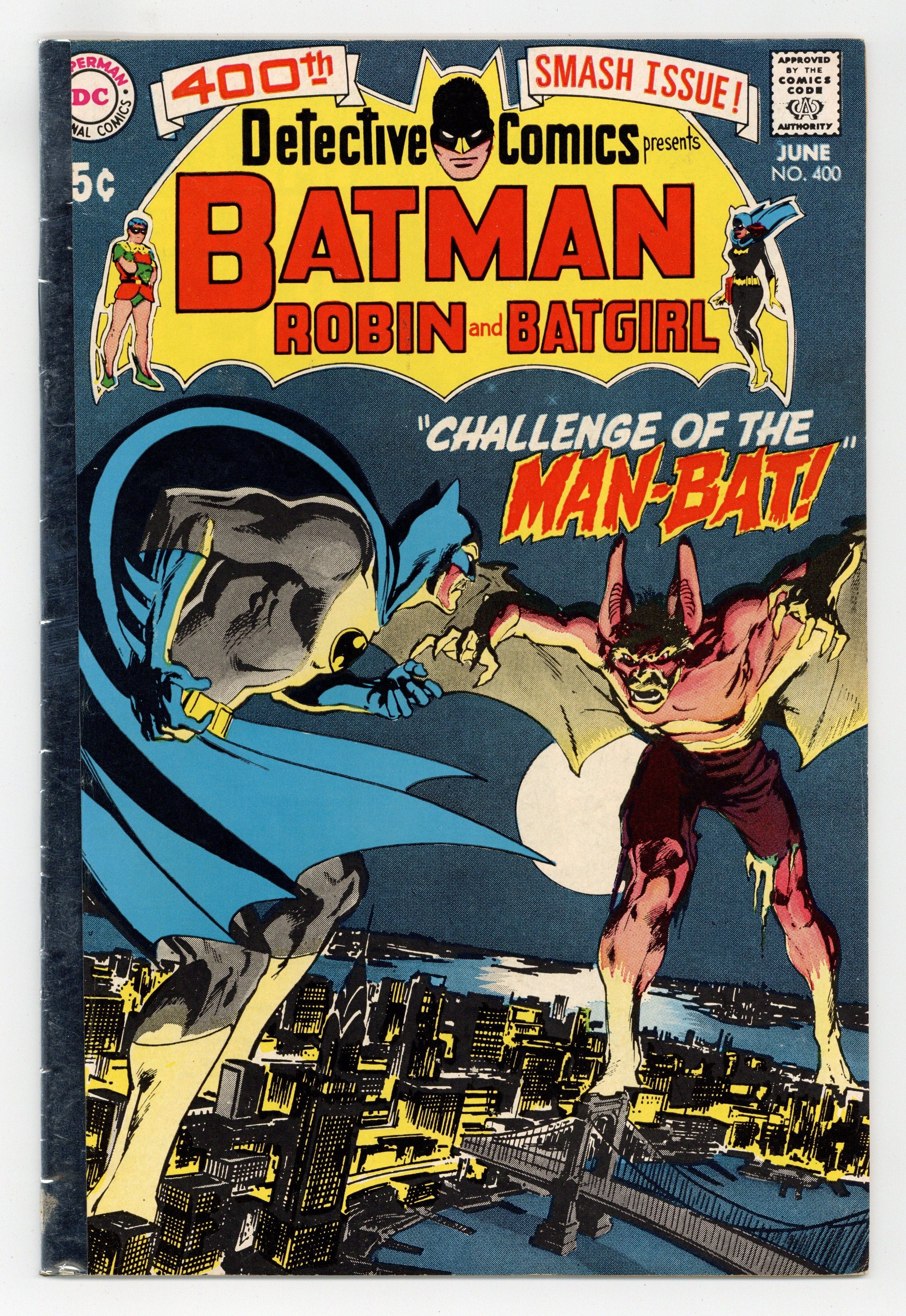 Cover by Neal Adams. Milestone issue featuring 1st appearance of Man-Bat in "Challenge of the Man-Bat!", script by Frank Robbins, pencils by Neal Adams, inks by Dick Giordano; Zoologist Kirk Langstrom is working late at the Gotham Natural History Museum putting together a bat habitat; he aims to perfect a serum that can endow people with enhanced auditory abilities via a specialized bat gland extract; Elsewhere in the city, a group of thieves known as the Blackout Gang break into a vault; Back at the museum, Kirk Langstrom is pleased with his progress and decides to test his new formula upon himself; he mutates into Man-Bat. "A Burial for Batgirl!," script by Denny O'Neil, pencils by Gil Kane, inks by Vince Colletta; Barbara Gordon has come to Hudson University to help with a Edgar Allen Poe festival; She discovers a murder and captures Hank Osher, who appears to be the murderer; Batgirl begins to believe that Hank has been framed and investigates further, which leads to her being captured and bricked into a wall. Letter to the editor from writer Alan Brennert. 36 pgs., full color. $0.15. Cover price $0.15.