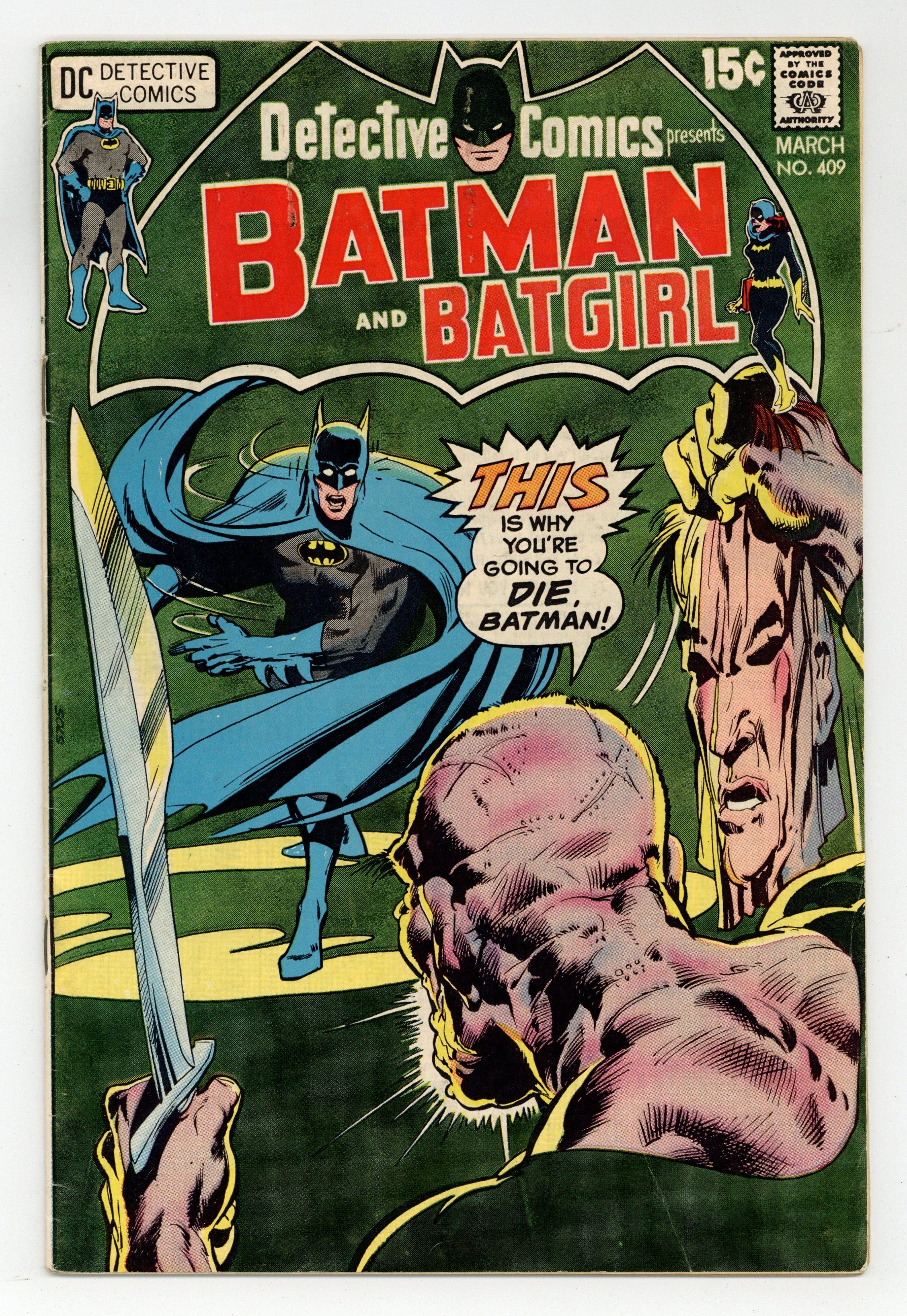 Cover pencils by Neal Adams, inks by Dick Giordano. "Man in the Eternal Mask!," script by Frank Robbins, pencils by Bob Brown, inks by Frank Giacoia; Batman and an artist must discover the identity of a mysterious mutilator of the artists portraits. "Night of the Sharp Horns!," script by Frank Robbins, pencils by Don Heck, inks by Dick Giordano; Continuing from last issue... Barbara Gordon was in Madrid, Spain, to collect a rare manuscript for Gotham Library when she suddenly found herself caught up in a murder mystery involving an aging bull fighters lost bull; Suspecting bull fighter El Grandos, a young bullfighter named Paco, or the grounds keeper Manolo as potential suspected, Batgirl sets out to search for clue and stop the "Phantom Bullfighter" from striking again the next night. Letter to the editor from cartoonist Michael Cherkas. Statement of ownership - average print run 406,782; average paid circulation 209,630. 36 pgs., full color. $0.15. Cover price $0.15.