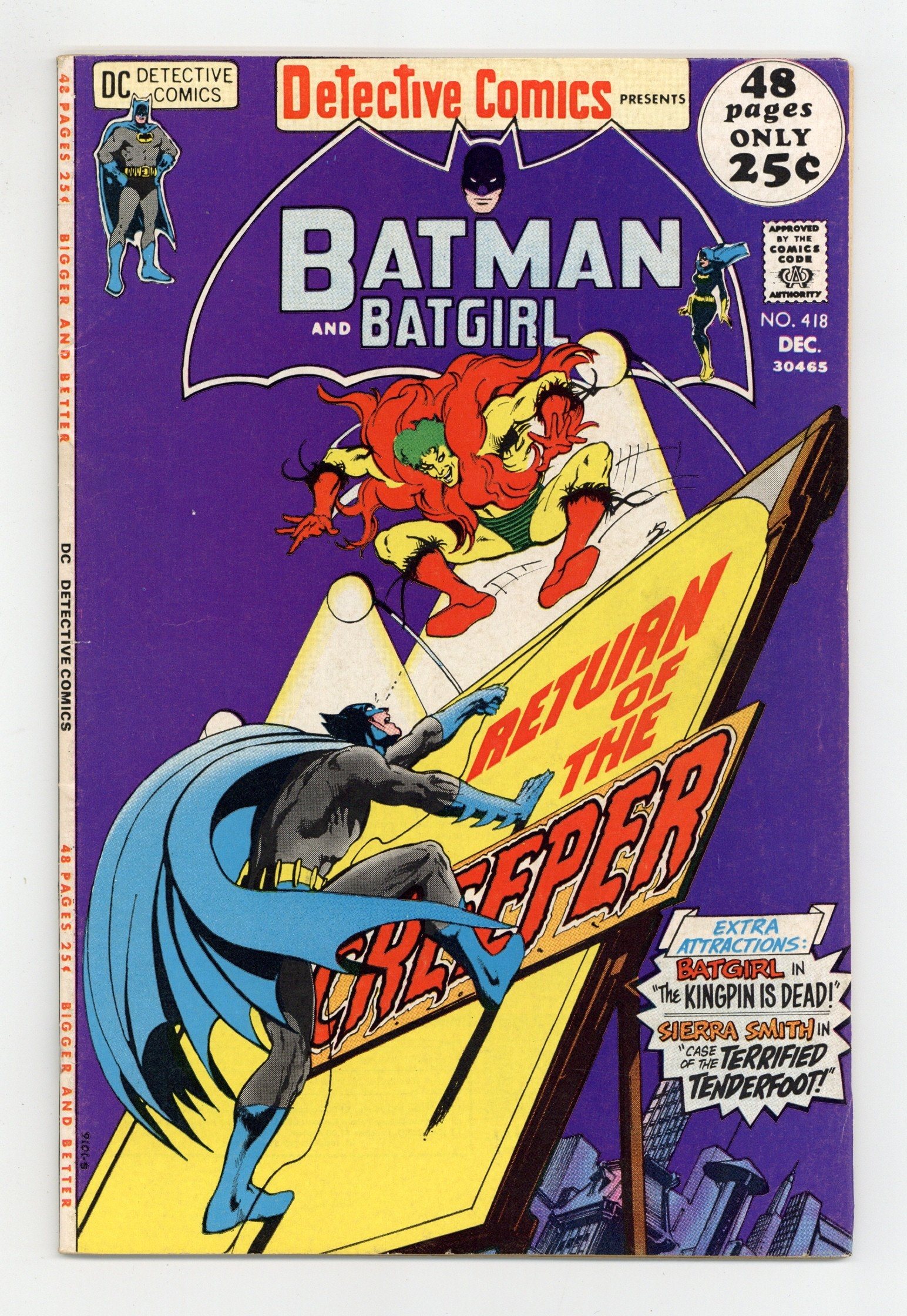 52-page giant issue. Cover art by Neal Adams. "...And Be a Villain!", script by Denny O'Neil, pencils by Irv Novick, inks by Dick Giordano; The Creeper is unable to transform back into his Jack Ryder identity and is being driven insane by Dr. Yatzs serum; But Yatzs son Ishmael has the Creeper steal for him, promising to cure him of his condition, and Batman becomes involved with the case as a result. "The Kingpin is Dead!", script by Frank Robbins, art by Don Heck; During the premiere of a new movie titled "The Stepfather" - based on the true story of the 1920's crime kingpin known as Floyd Marcus - premieres at a Gotham theater, Marcus (who is in attendance) is gunned down in cold blood upon his arrival; Recognizing the gunman as Marcus' step son Mike, Barbara Gordon changes into Batgirl to search his estate for proof linking him to the murder. "The Case of the Careless Caretaker," art by George Papp, reprinted from Gang Busters #40. "The Case of the Terrified Tenderfoot!", script by Joe Millard, pencils by Alex Toth, inks by Frank Giacoia, reprinted from Dale Evans Comics #1. Letters to the editor from cartoonist Fred Hembeck and comics writers Bob Rozakis and Denny O'Neil (!). 52 pgs., full color. $0.25. Cover price $0.25.