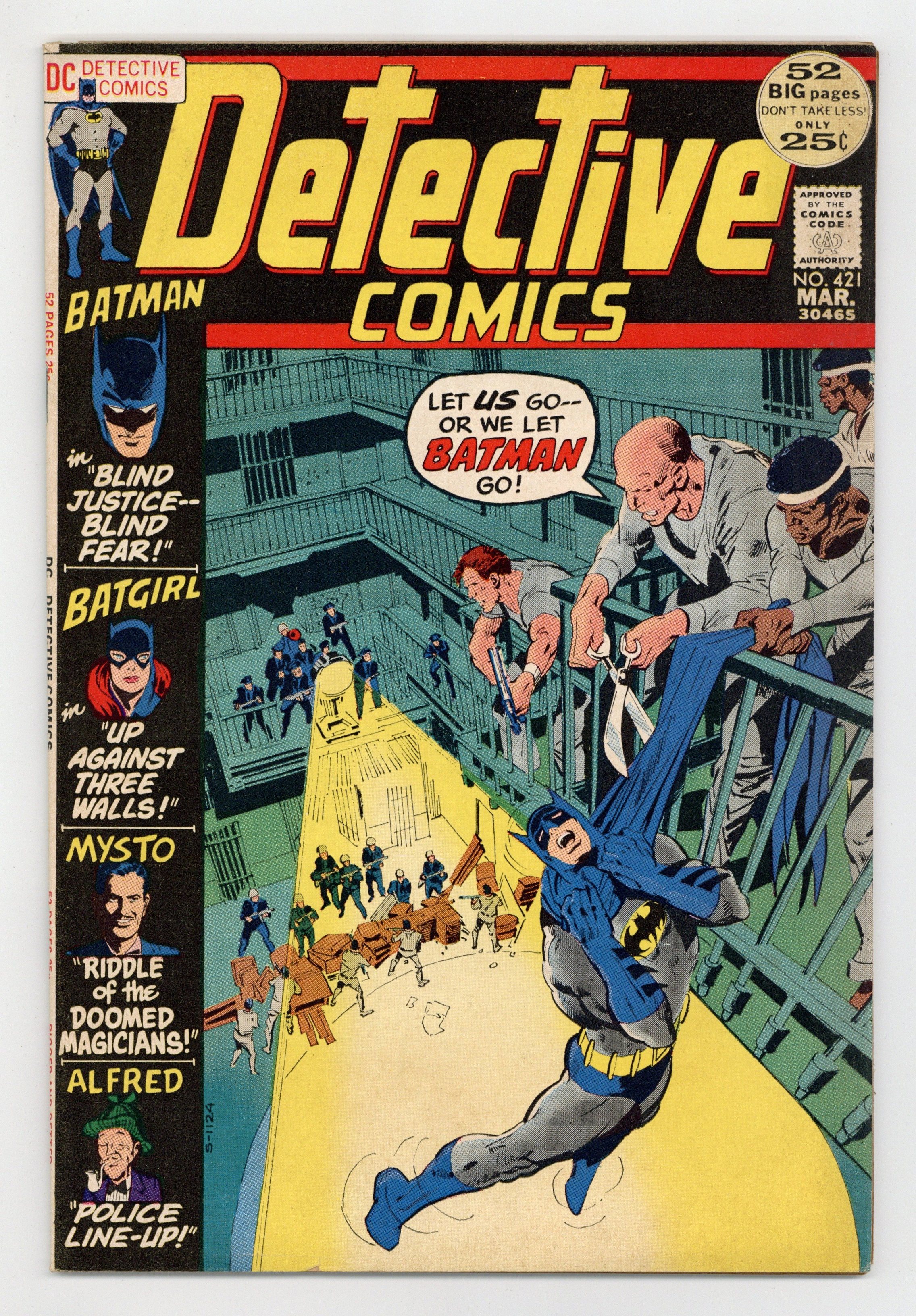 52-page giant. Cover pencils by Neal Adams and Alan Kupperberg (Batman head on the left border), inks by Dick Giordano. "Blind Justice...Blind Fear!," script and art by Frank Robbins; Batman must find a way of keeping a convict who has served his time alive during a prison break so that he can divulge information about corrupt politicians, despite a black militant con who wants to bargain for freedom and a hired killer out to get the man Batman wants to protect. "Up Against Three Walls!," script by Frank Robbins, art by Don Heck; Continuing from last issue... Commissioner Gordon and his daughter Barbara had traveled to Mexico City so that the Commissioner could teach the police there crime fighting techniques against drug smugglers; Arriving at police headquarters as Batgirl, Barbara learns that the local mob had demanded a ransom of twelve and a half million Pesos for their safe return. "Police Line-Up!," art by Jerry Robinson, reprinted from Batman #24. "The Riddle of the Doomed Magicians!," script by Bill Woolfolk, art by Leonard Starr, reprinted from Detective Comics #205. Letter to the editor from Jay Zilber. Statement of ownership - average print run 371,666; average paid circulation 199,112. 52 pgs., full color. $0.25. Cover price $0.25.