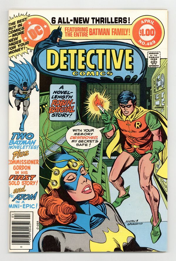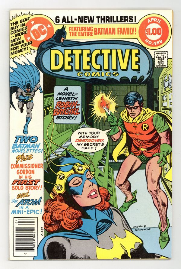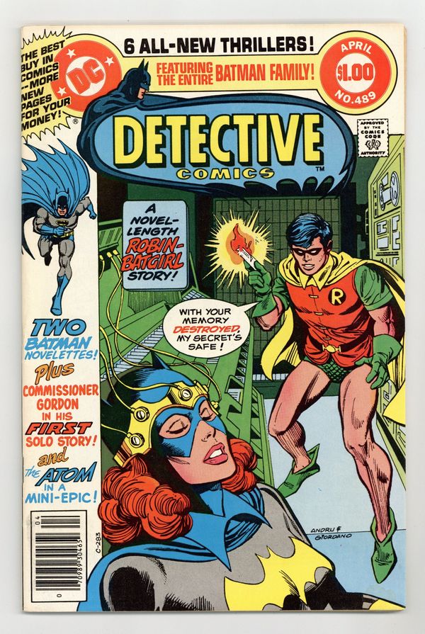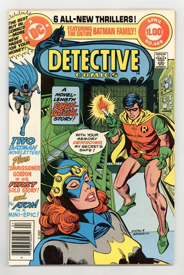 Tags: Giant-Sized Issue, Batman$23.0068-page giant. Cover pencils by Ross Andru, inks by Dick Giordano. "Creatures of the Night!", script by J. M. DeMatteis, pencils by Irv Novick, inks by Vince Colletta; Batman and a vampire hunter named Moon the Mystic separately stalk a vampire who may be Moon himself. "When the Inmates Run the Madhouse!", script by Paul Kupperberg, pencils by Irv Novick, inks by Steve Mitchell; Commissioner Gordon enters Gotham State Prison to negotiate with rioting cons, and runs into a trap set for him alone. "The Mind Warp Mystery," script by Jack C. Harris, pencils by Don Heck, inks by Vince Colletta; Shortly after two mysterious murders, Barbara Gordon loses her memory, and Robin and Commissioner Gordon must restore it and find the secret of the memory-loss and murders. "Computer Crisis" starring The Atom, script by Bob Rozakis, pencils by Alex Saviuk, inks by Vince Colletta. "The Bogus Butlers" starring Alfred, script by Bob Rozakis, pencils by Jose Delbo, inks by Bob Smith. "Where Strike the Assassins" starring Batman and the League of Assassins, script by Denny O'Neil, pencils by Don Newton, inks by Dan Adkins. Hostess snack cakes ad with Wonder Woman, "The Borrower." 68 pgs., full color. $1.00. Cover price $1.00.