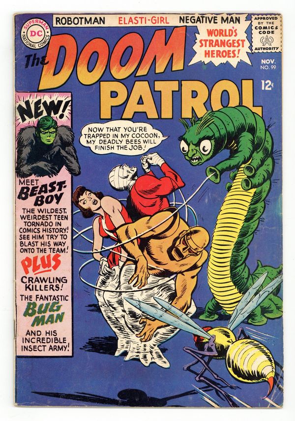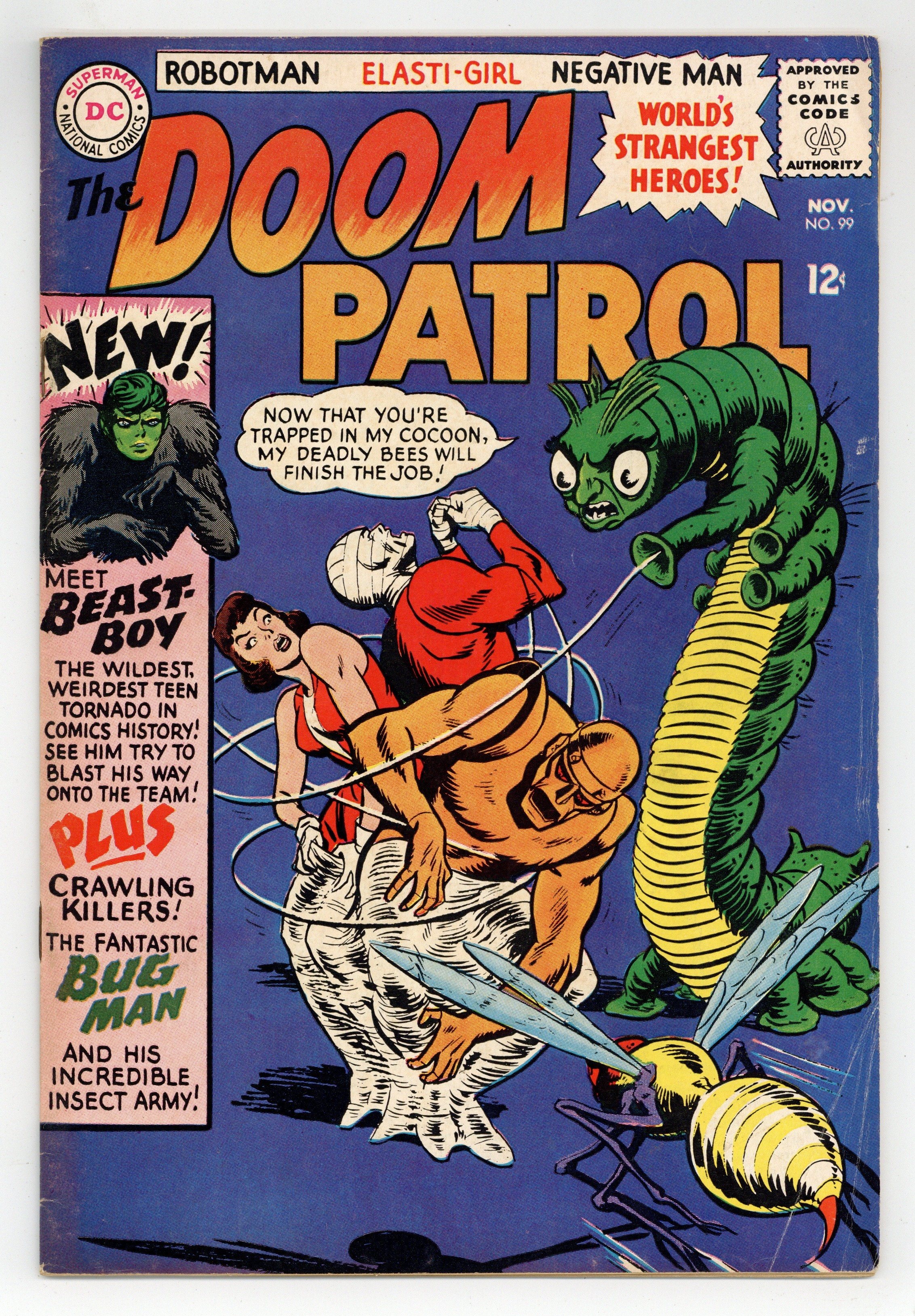 1st appearance of Beast Boy - Cover by Bob Brown. The Deadly Sting of the Bug Man (part 1), script by Arnold Drake, art by Bob Brown; The Doom Patrol put on a public display wherein Robotman dives off the hand of Elasti-Girl and is saved at the last minute by Larry's Negative Man form; This ends with Robotman almost face planting into the ground; hes humiliated when a pennant gets stuck to his face; Larry reveals to the others that he doesn't want to always rely on his Negative Man form and be a real man and fight for himself. In the Spider's Parlor(part 1). The Beast-Boy (part 1), script by Arnold Drake, art by Bob Brown; One night the Doom Patrol returns to their base to find that it's been trashed by what appears to be various different animals; Convinced that the attacker will return, the Doom Patrol set up a trap for them. That Kid's Not So Green! (part 1). Writer James Van Hise gets a mention on the letters page. 36 pgs., full color. $0.12. Cover price $0.12.