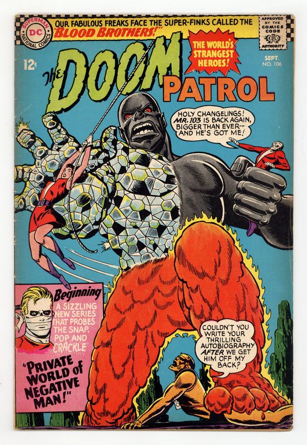 Cover art by Bob Brown. Blood Brothers (part 1), script by Arnold Drake, art by Bruno Premiani; Mr. Galtry hires Mr. 103 to kill the Doom Patrol. Get Hip to Old Folks! public service announcement, script by Jack Schiff, art by Morris Waldinger. Mento Meets the Atom Master (part 2). The Private World of Negative Man--Private World of Negative Man, script by Arnold Drake, art by Bruno Premiani; the origin of Negative Man. 36 pgs. $0.12. Cover price $0.12.