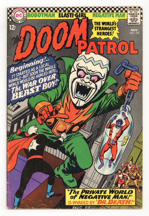 Cover art by Bob Brown. The War Over Beast Boy (part 1), script by Arnold Drake, art by Bruno Premiani; Doom Patrol versus Ultimax. Lost -- A Free Education! public service announcement starring Binky, script by Jack Schiff, art by Bob Oksner. Cap's Hobby Hints activity half-page by Henry Boltinoff. The War Over Beast Boy (part 2), script by Arnold Drake, art by Bruno Premiani; Rita is shrunk down and sent to a microscopic world; Galtry strikes a deal with Abu Hallam. The Race Against Dr. Death--The Private World of Negative Man, script by Arnold Drake, art by Bruno Premiani; Dr. Death tries to recruit Larry Trainor. 36 pgs. $0.12. Cover price $0.12.
