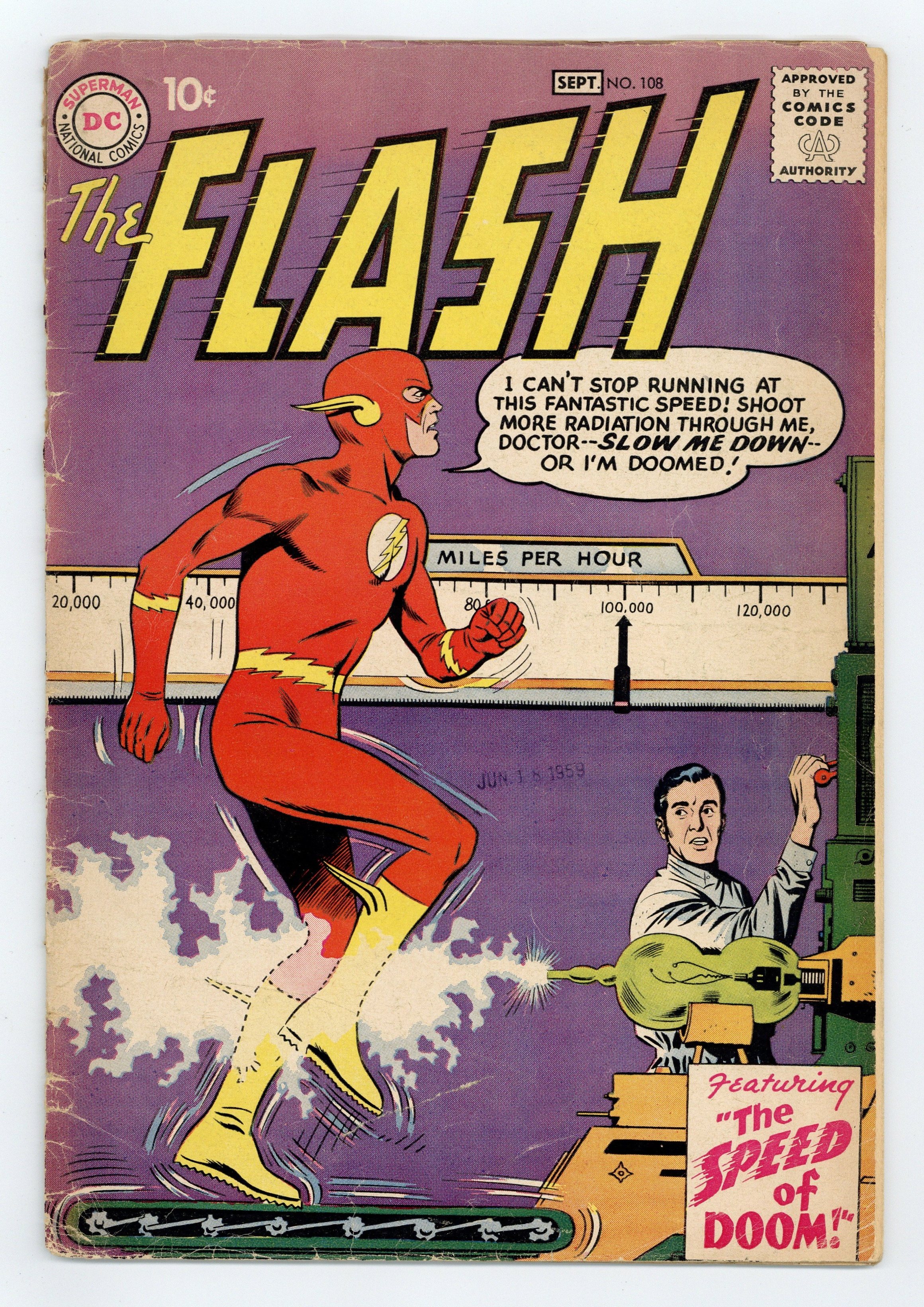 Cover pencils by Carmine Infantino, inks by Joe Giella. Grodd Trilogy part 3 in Super-Gorilla's Secret Identity, script by John Broome, pencils by Carmine Infantino, inks by Joe Giella; using his quadromobile, Gorilla Grodd escapes once again from Gorilla City; Grodd turns himself into a modern man with an evolution-accelerator; Flash is up for man of the year. The Speed of Doom!, script by John Broome, pencils by Carmine Infantino, inks by Frank Giacoia; Flash takes part in an experiment that is actually a trap set by an alien criminal named Kee Feleg. Peter Porkchops Gives Tips on Summer Fun public service strip. Flash Facts page. Palisades Amusement Park ad with Superman. John Daniel—Gorilla Extraordinary article. 36 Pages, Full Color. Cover price $0.10.