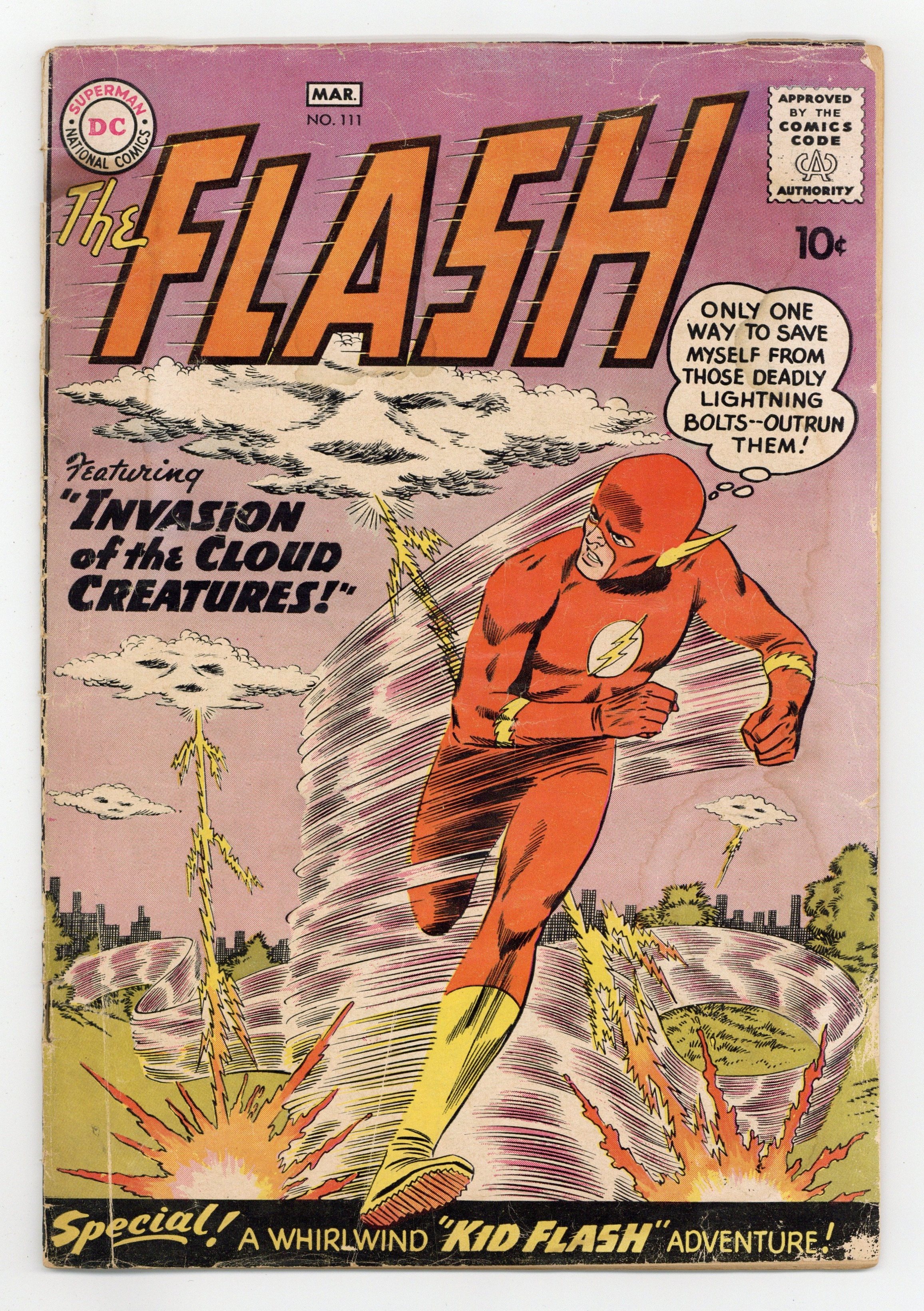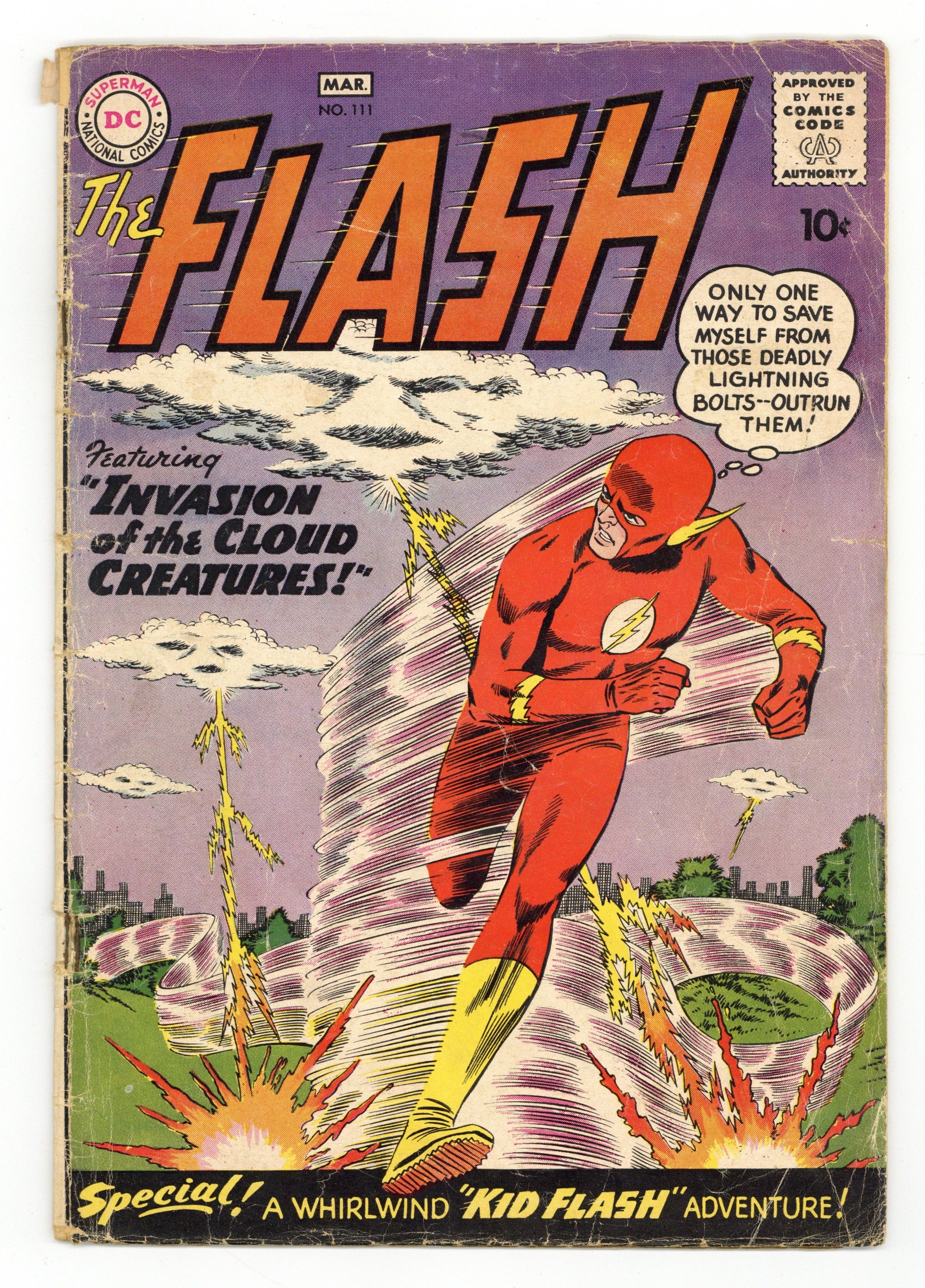 Cover pencils by Carmine Infantino, inks by Joe Giella. 2nd appearance of Kid Flash in The Challenge of the Crimson Crows, script by John Broome, pencils by Carmine Infantino, inks by Joe Giella; In Kid Flash's first solo adventure, he must stop a gang of kids before they get into trouble. Invasion of the Cloud Creatures!, script by John Broome, pencils by Carmine Infantino, inks by Murphy Anderson; Dr. Wiley Summers discovers Cloud Creatures who want to take over the Earth. It's Fun to Help Others public service announcement starring Superboy, script by Jack Schiff, pencils by Curt Swan, inks by Stan Kaye. The Speed of Sound! fact half-page. Volcanoes article. Ad for The Brave and the Bold #28 [first Justice League], pencils by Mike Sekowsky, inks by Murphy Anderson. Flash Facts filler page. 36 Pages, Full Color. Cover price $0.10.