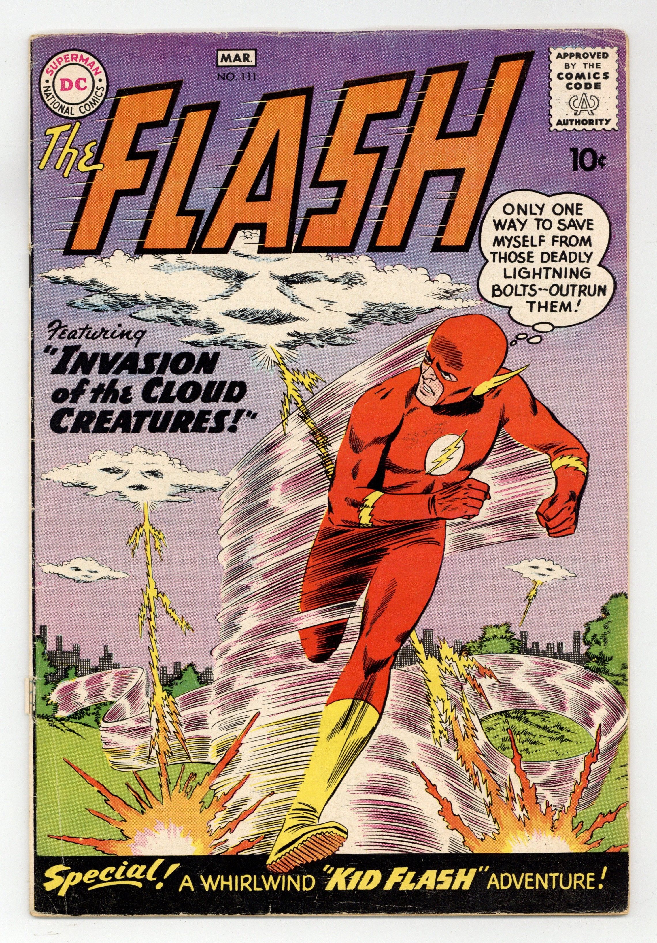 Starts Apr 4 Cover pencils by Carmine Infantino, inks by Joe Giella. 2nd appearance of Kid Flash in The Challenge of the Crimson Crows, script by John Broome, pencils by Carmine Infantino, inks by Joe Giella; In Kid Flash's first solo adventure, he must stop a gang of kids before they get into trouble. Invasion of the Cloud Creatures!, script by John Broome, pencils by Carmine Infantino, inks by Murphy Anderson; Dr. Wiley Summers discovers Cloud Creatures who want to take over the Earth. It's Fun to Help Others public service announcement starring Superboy, script by Jack Schiff, pencils by Curt Swan, inks by Stan Kaye. The Speed of Sound! fact half-page. Volcanoes article. Ad for The Brave and the Bold #28 [first Justice League], pencils by Mike Sekowsky, inks by Murphy Anderson. Flash Facts filler page. 36 Pages, Full Color. Cover price $0.10.