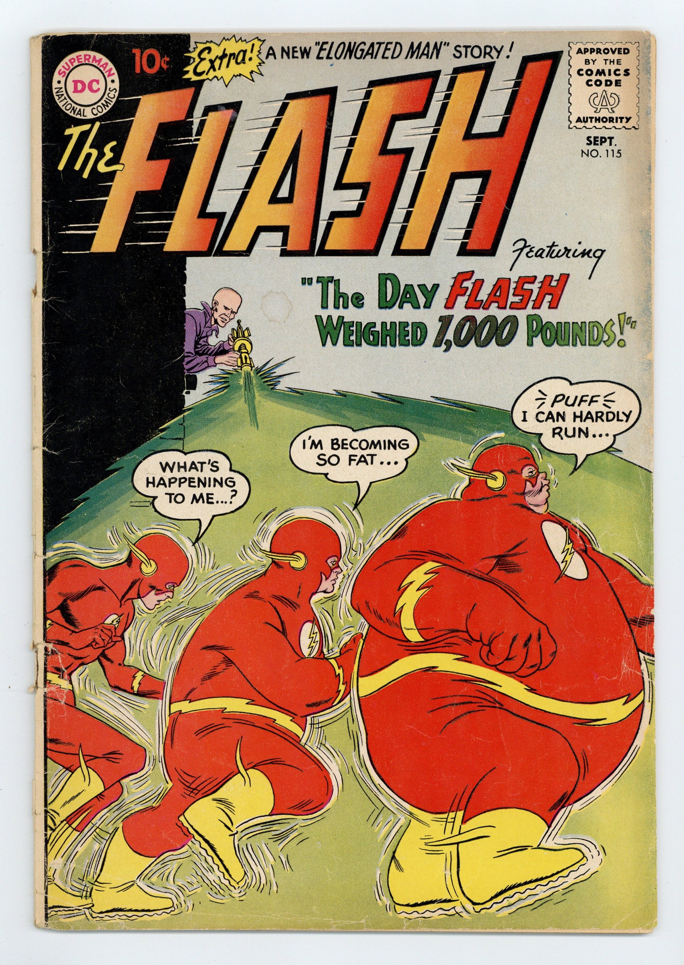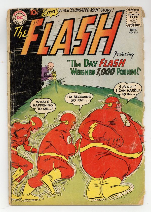 Cover pencils by Carmine Infantino, inks by Joe Giella. The Day Flash Weighed 1,000 Pounds!, script by John Broome, pencils by Carmine Infantino, inks by Joe Giella; Gorilla Grodd, disguised as William Dawson, uses a special gun that causes Flash to gain 1,000 pounds. The Elongated Man's Secret Weapon!, script by John Broome, pencils by Carmine Infantino, inks by Murphy Anderson; Ralph the Elongated Man Dibny travels to the Yucatan to see the Gingo tree that gives him his ability to stretch; Flash and Ralph are reduced in size. Ad for Giant Superman Annual. Jack Rabbit Hop! fact half-page. 36 Pages, Full Color. Cover price $0.10.