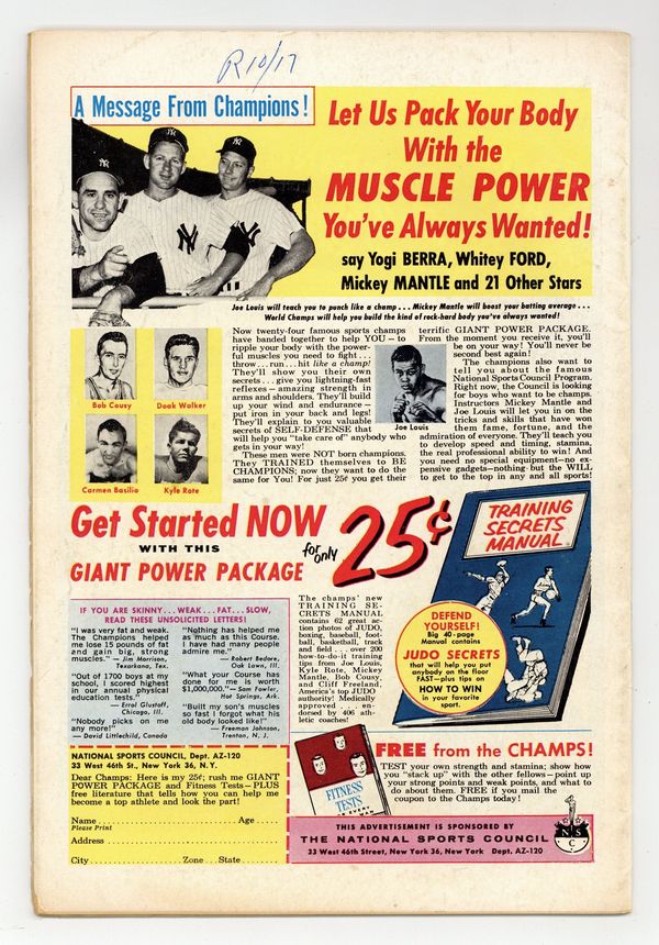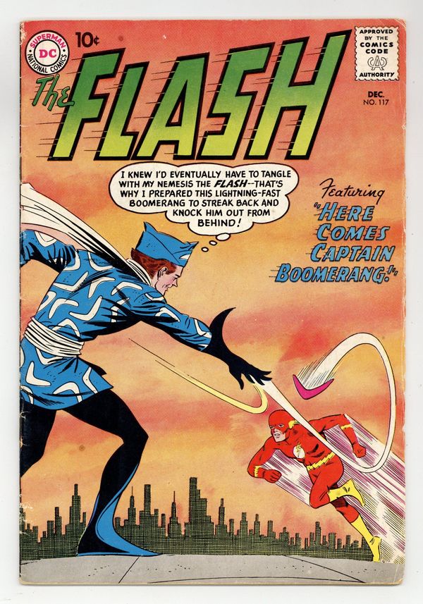Starts Apr 4 Cover pencils by Carmine Infantino, inks by Joe Giella. First appearance of Captain Boomerang in Here Comes Captain Boomerang!, script by John Broome, pencils by Carmine Infantino, inks by Murphy Anderson; W.W. Wiggins, the head of a game company, hires Digger Harkness to be his boomerang expert; Harkness becomes Captain Boomerang, commits crimes, and battles Flash. The Madcap Inventors of Central City!, script by Gardner Fox, pencils by Carmine Infantino, inks by Joe Giella; Winky, Blinky, and Noddy build a machine and start an inventing business. Letter to the editor from Fox himself! Ad for Giant Superman Annual. Comparative Speed Records fact page. Training Secrets Manual ad featuring Bob Cousy, Doak Walker, Carmen Basilio, and Kyle Rote. 36 Pages, Full Color. Cover price $0.10.