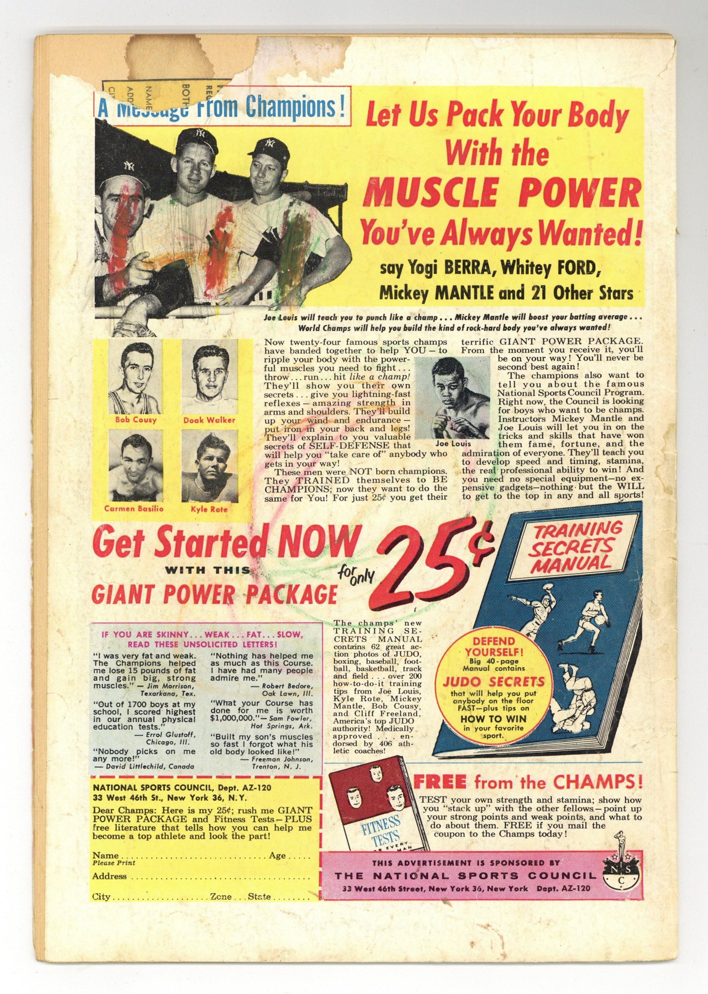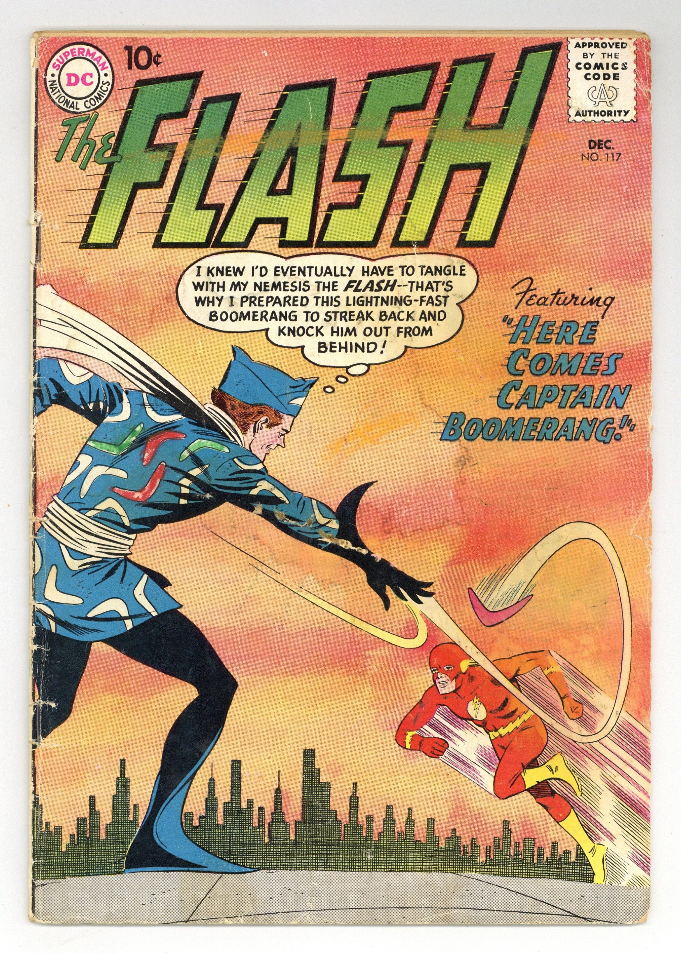 Cover pencils by Carmine Infantino, inks by Joe Giella. First appearance of Captain Boomerang in Here Comes Captain Boomerang!, script by John Broome, pencils by Carmine Infantino, inks by Murphy Anderson; W.W. Wiggins, the head of a game company, hires Digger Harkness to be his boomerang expert; Harkness becomes Captain Boomerang, commits crimes, and battles Flash. The Madcap Inventors of Central City!, script by Gardner Fox, pencils by Carmine Infantino, inks by Joe Giella; Winky, Blinky, and Noddy build a machine and start an inventing business. Letter to the editor from Fox himself! Ad for Giant Superman Annual. Comparative Speed Records fact page. Training Secrets Manual ad featuring Bob Cousy, Doak Walker, Carmen Basilio, and Kyle Rote. 36 Pages, Full Color. Cover price $0.10.
