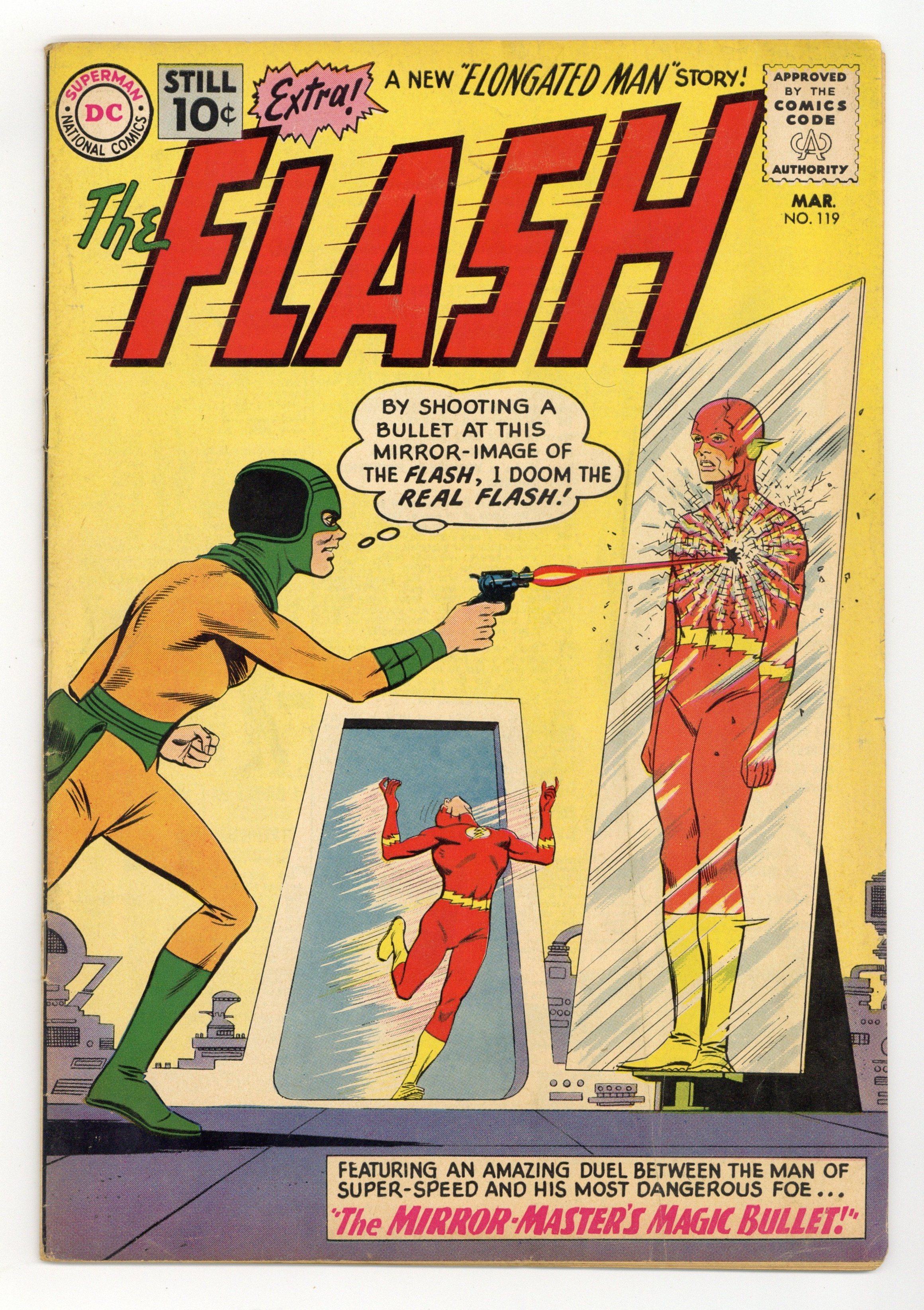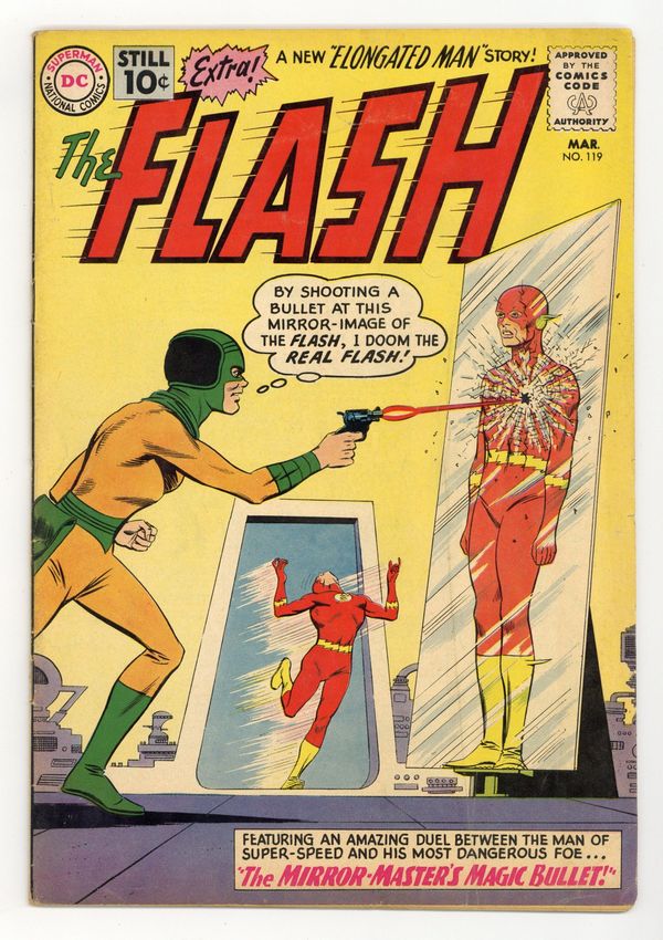 Cover pencils by Carmine Infantino, inks by Sid Greene. The Mirror-Master's Magic Bullet!, script by John Broome, pencils by Carmine Infantino, inks by Murphy Anderson; Mirror Master steals mirrors in a museum; Flash guards a rear mirror belonging to the father of a girl Iris gets jealous of; Mirror Master uses a mirror duplicator to make Flash his genie. The Elongated Man's Undersea Trap!, script by John Broome, pencils by Carmine Infantino, inks by Joe Giella; Elongated Man goes on a honeymoon with his new bride, debutante Sue Dearbon. Amazing Speeds fact page. The Brave and the Bold #34 ad with Hawkman. 36 Pages, Full Color. Cover price $0.10.