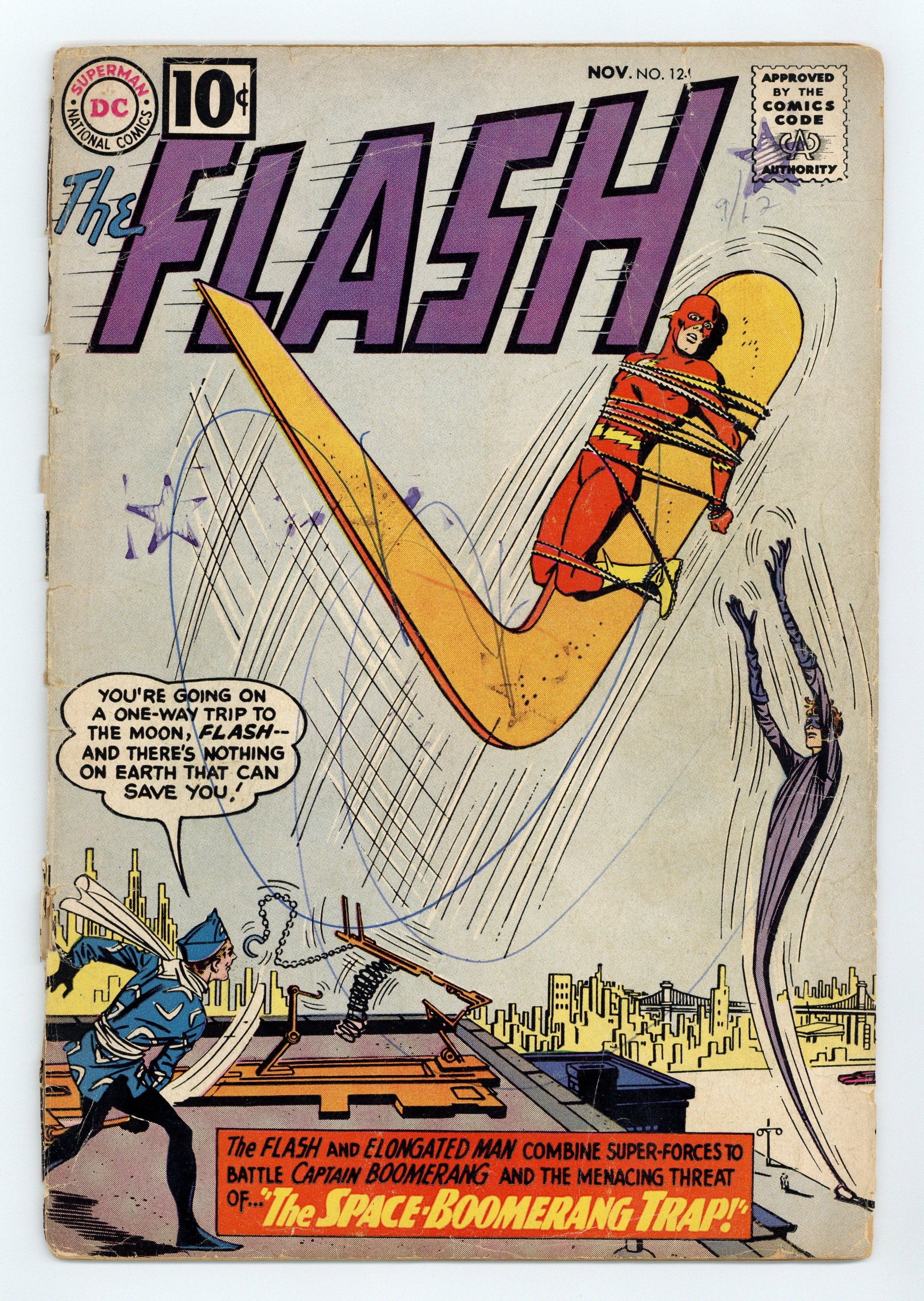 Last 10-cent cover price. Cover pencils by Carmine Infantino, inks by Joe Giella. Space-Boomerang Trap!, script by John Broome, pencils by Carmine Infantino, inks by Joe Giella; Captain Boomerang is paroled from prison and invents a time-traveling boomerang; Flash and Elongated Man stop Boomerang; all three join together to battle aliens. Vengeance Via Television!, script by John Broome, pencils by Carmine Infantino, inks by Joe Giella; When James Lawton is released from jail he takes revenge on those who put him in jail by using his new psi-helmet. Sea Devils #1 ad. Letter from fanzine writers Bernie Bubnis and Robert Jennings. Letter from Infantino. Amazing Speeds fact page. 36 Pages, Full Color. Cover price $0.10.