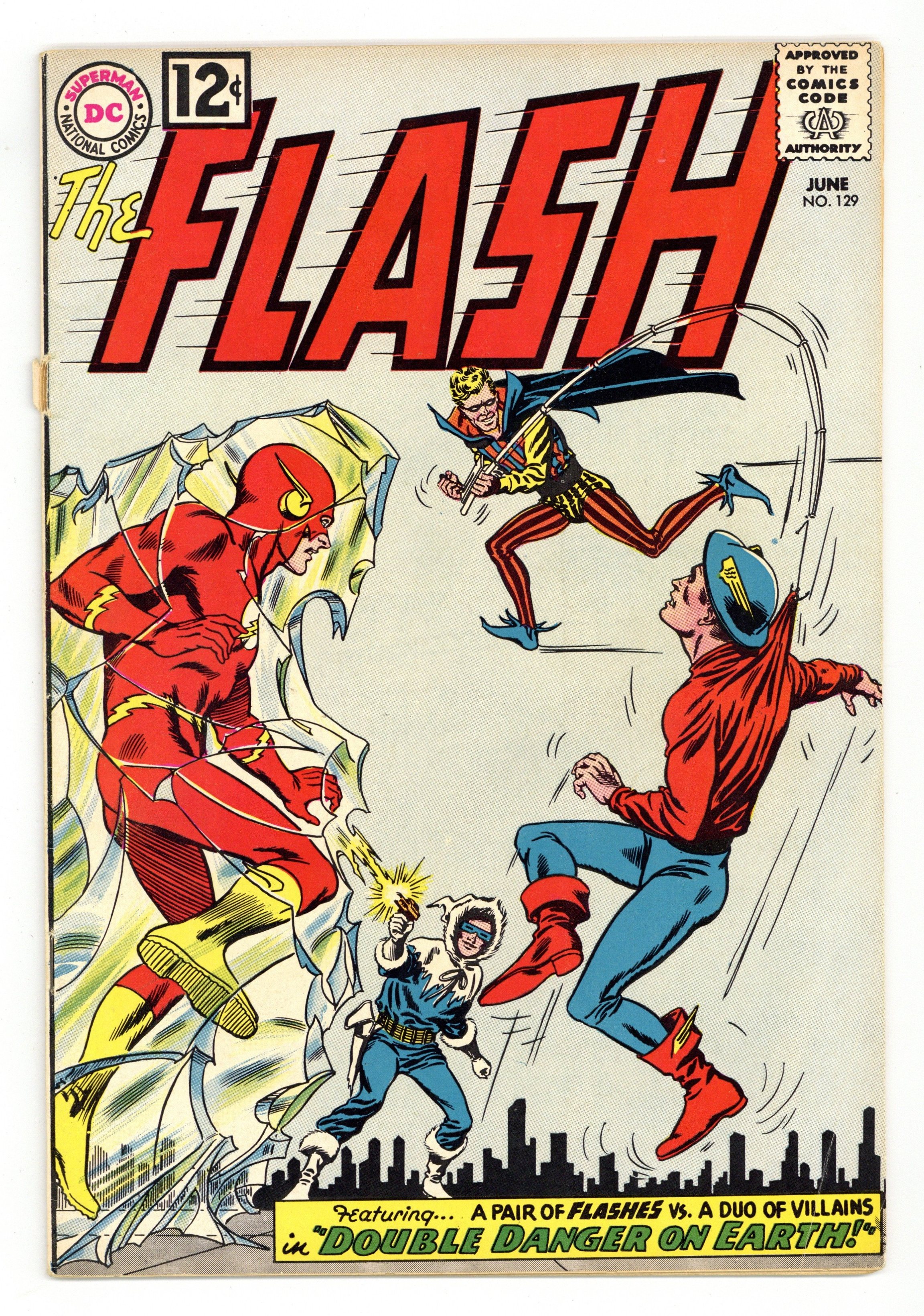 Cover pencils by Carmine Infantino, inks by Murphy Anderson. 2nd Silver Age appearance of Golden Age Flash from Earth-2 in Double Danger on Earth, script by Gardner Fox, pencils by Carmine Infantino, inks by Joe Giella; a comet strikes the sun, endangering Earth 2 with radiation; Barry and Iris attend a costume party on Earth 1, and the proceeds are stolen by Captain Cold; Jay and Barry team up; Cameo of the JSA vs. the Key. Ad for Atom #1. Palisades Amusement Park ad with Superman. Brave and the Bold ad with Hawkman. Letters to the editor from comics writer Don McGregor, publisher Bill Warren, and super fan Bernie Bubnis. 36 Pages, Full Color. Cover price $0.12.