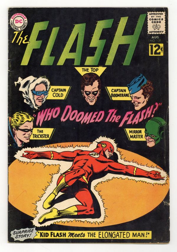 Cover pencils by Carmine Infantino, inks by Joe Giella. Who Doomed the Flash?, script by John Broome, pencils by Carmine Infantino, inks by Joe Giella; several Flash villains have been spotted around town, but Flash discovers that they are still in jail; Mirror Master imprisons Flash in a trap. Kid Flash Meets the Elongated Man!, script by John Broome, pencils by Carmine Infantino, inks by Joe Giella; Kid Flash teams up with the Elongated Man to capture the Weather Wizard. Ads for Giant Superman Annual, Giant Batman Annual, and Giant Lois Lane Annual. Palisades Amusement Park ad with Superman. 36 Pages, Full Color. Cover price $0.12.