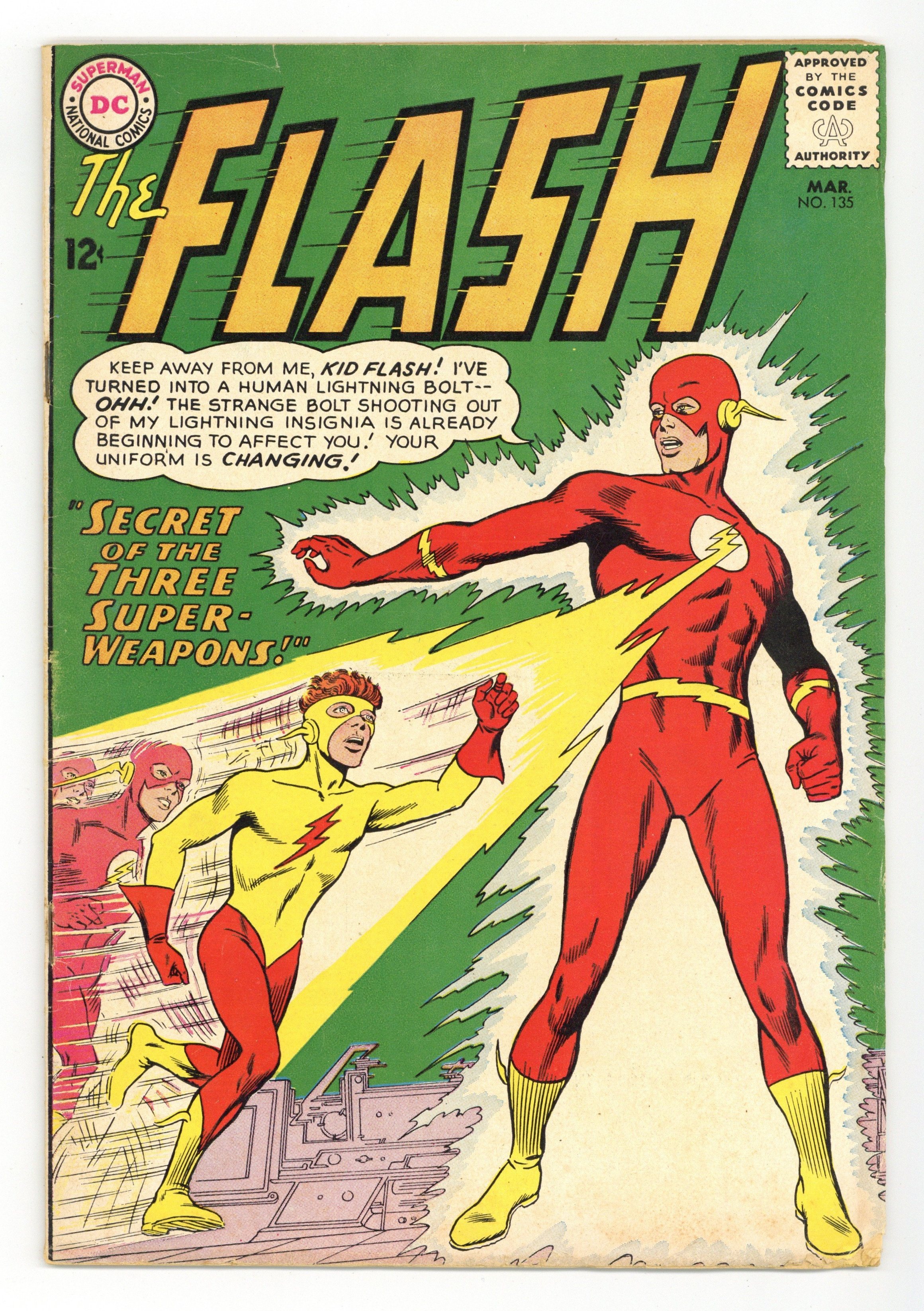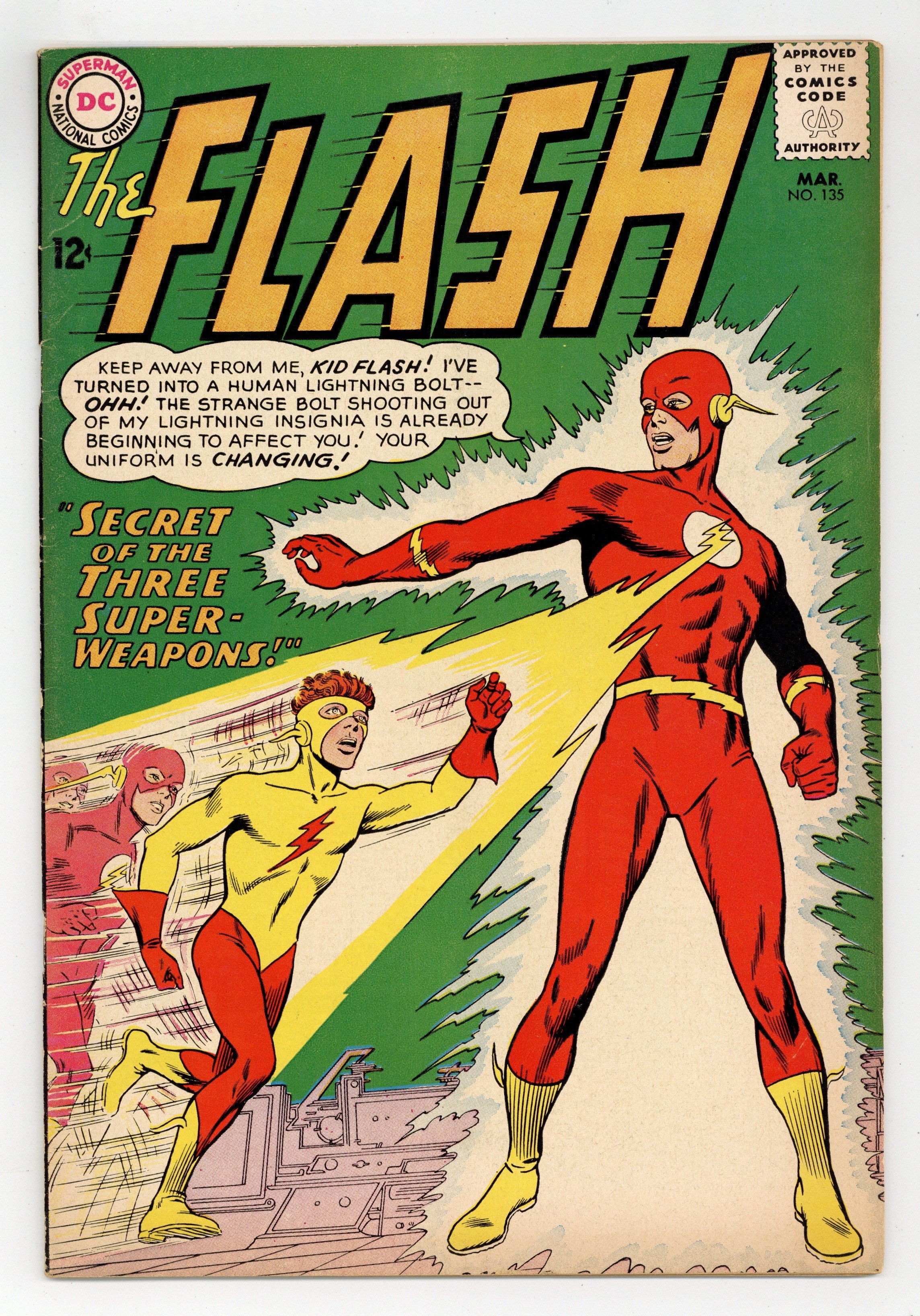 Starts Dec 8 Cover pencils by Carmine Infantino, inks by Murphy Anderson. Secret of the Three Super-Weapons, script by John Broome, pencils by Carmine Infantino, inks by Joe Giella; Wally West communicates with an inter-dimensional being called Ryla from the world of Korydon; the Makryds have conquered Korydon and have their sights set on Earth; while fighting an alien invasion, Wally gets a new uniform. Ad for Strange Adventures and Mystery in Space. Letter from MyComicShop owner Buddy Saunders! Ad for Justice League of America and Green Lantern. 36 Pages, Full Color. Cover price $0.12.