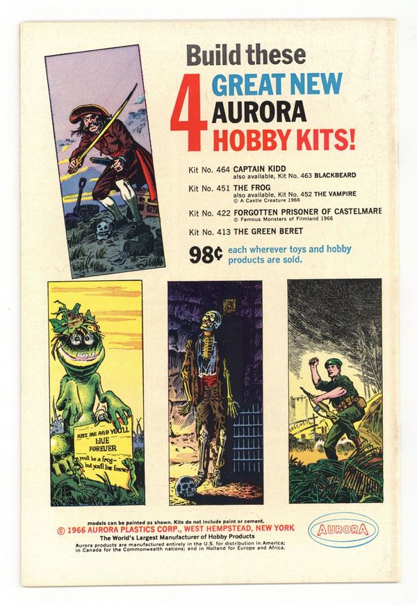 Cover art by Murphy Anderson. One Bridegroom Too Many!, script by John Broome, pencils by Carmine Infantino, inks by Joe Giella; Reverse Flash impersonates Barry Allen with the intent of marrying Iris West; luckily, Barry marries Iris in the end; Craig "Mr. Silver Age" Schutt has called this the greatest Silver Age wedding of all time. Lost--A Free Education! public service announcement starring Binky, script by Jack Schiff, art by Bob Oksner. Caps Hobby Hints strip by Henry Boltinoff. 80 pg. Giant Justice League ad. Batman Magic Photo Kit ad. Plastic Man ad. Letter from noted letter hack Guy H. Lillian III. Caps Hobby Hints strip by Henry Boltinoff. G.I. Joe Club ad. Back cover model kit ad featuring Captain Kidd, The Frog, Forgotten Prisoner of Castelmare, and The Green Beret. 36 Pages, Full Color. Cover price $0.12.