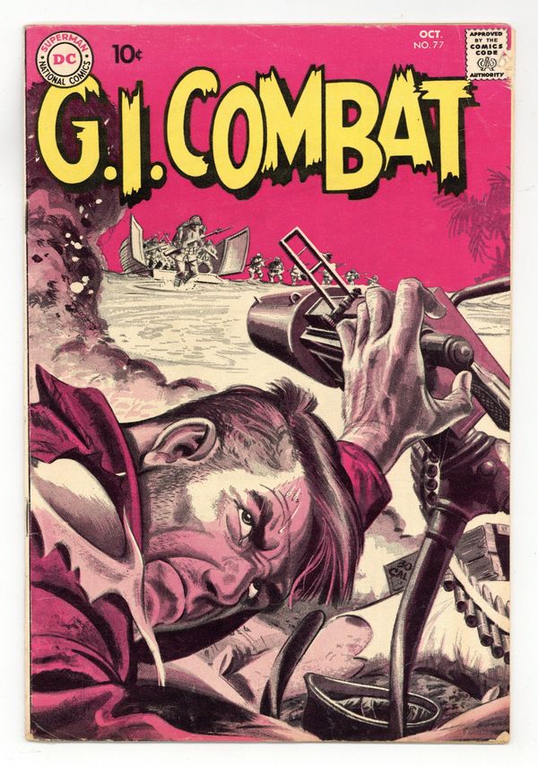 $65.00Cover by Jerry Grandenetti and Jack Adler (washtone). Written by Bob Haney and Hank Chapman. Art by Russ Heath, Joe Kubert, Ross Andru and Mike Esposito. In this issue: "H-Hour for a Gunner!" by Bob Haney and Russ Heath; "Get the Carriers" by Haney and Joe Kubert; "Last on a Match!" by Hank Chapman, Ross Andru and Mike Esposito; and half-pager "Anti-Mine Nets!" 36 Pages, Full Color. Cover price $0.10.