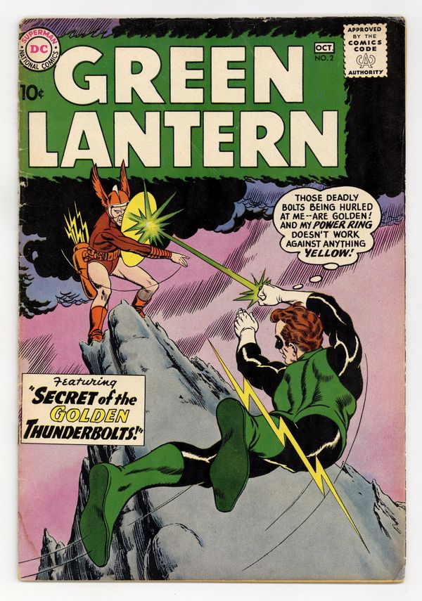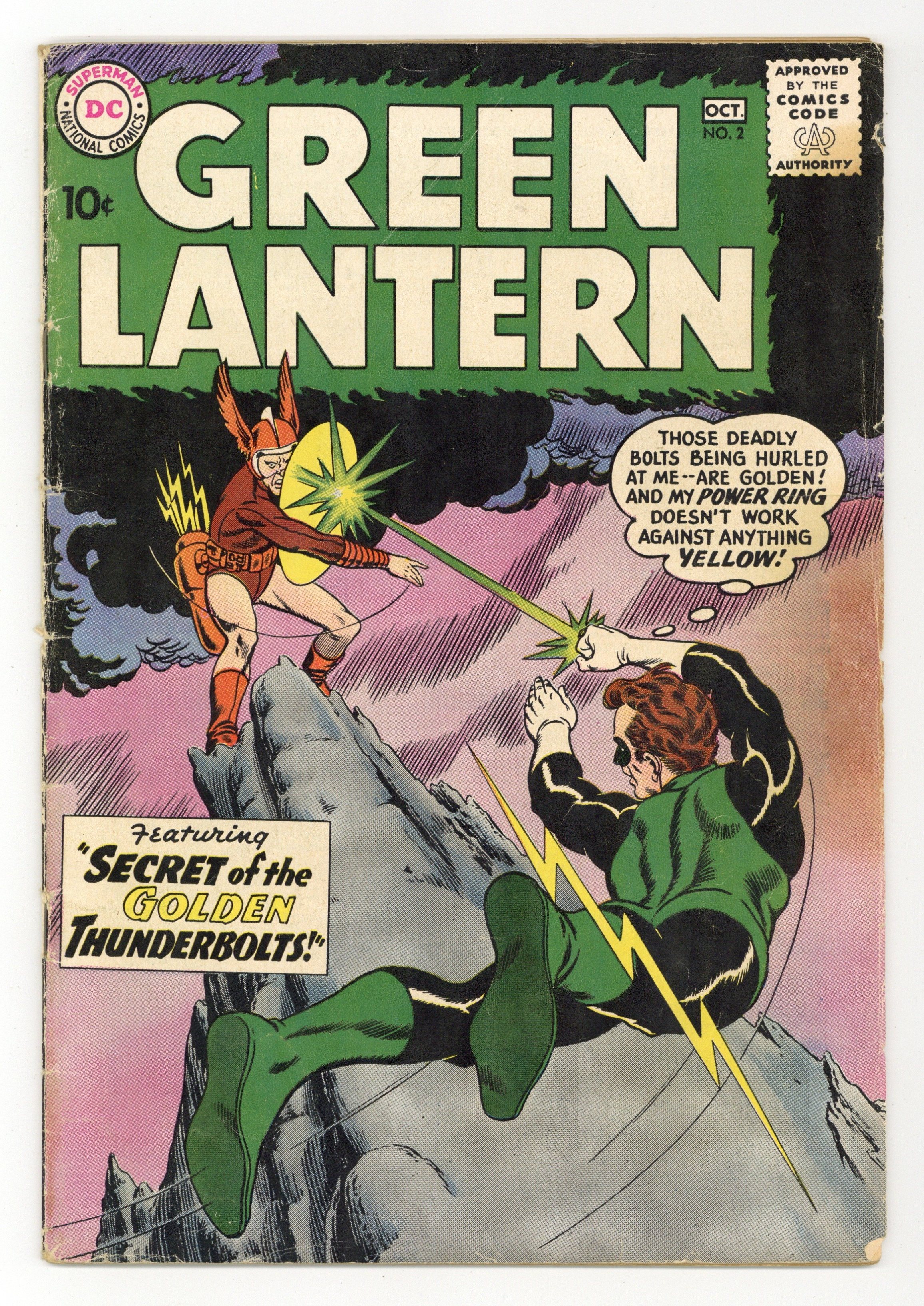 Cover pencils by Gil Kane, inks by Murphy Anderson. The Secret of the Golden Thunderbolts!, script by John Broome pencils by Gil Kane, inks by Joe Giella; Green Lantern learns of the anti-matter universe of Qward. He travels there to rescue the few lawful citizens and brings them to Earth and closes the portal between dimensions. Riddle of the Frozen Ghost Town!, script by John Broome, pencils by Gil Kane, inks by Joe Giella; Tom Kalmakus' father and Jimmy Dawes had stumbled on a gold mine and split the map for keeping while Dawes raised money to work it, but Tom's father died and Dawes lost his map while gambling. Duke Danfield won the map half and steals Tom's half to find the gold, but Green Lantern defeats his gang and Tom discovers Hal's secret identity as Green Lantern; Introduction of Pieface [Thomas Kalmaku]. 36 pages, full color. Cover price $0.10.