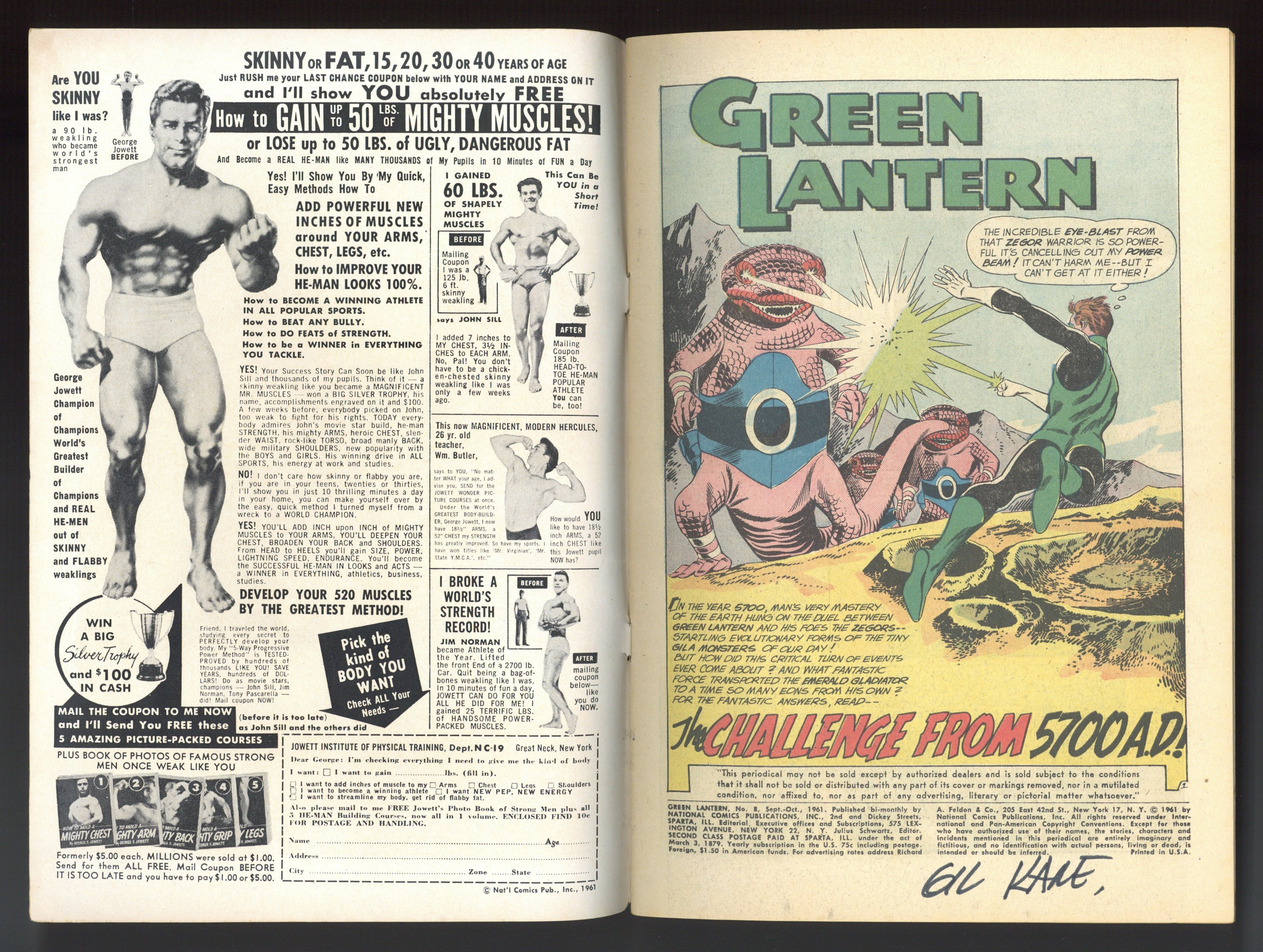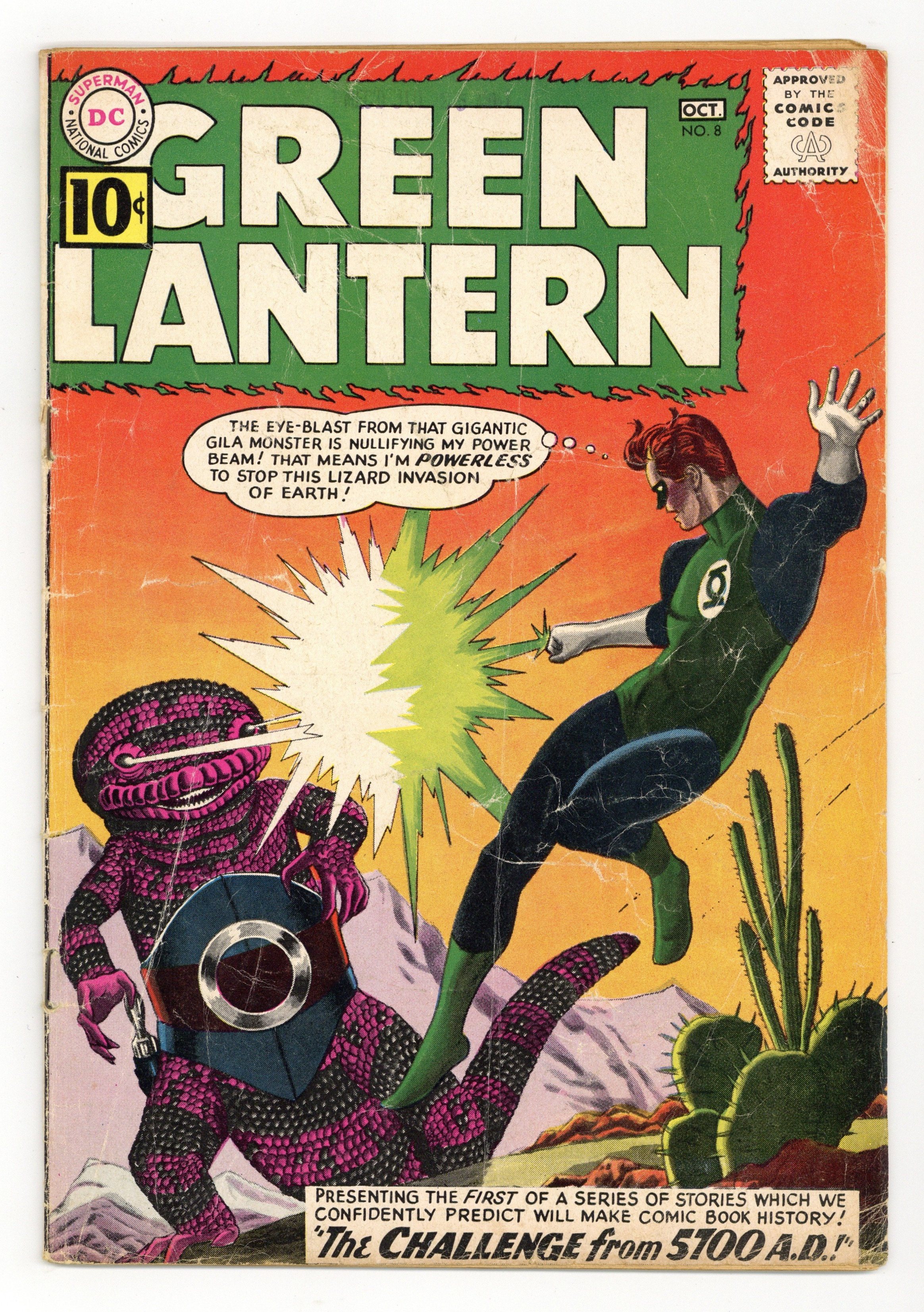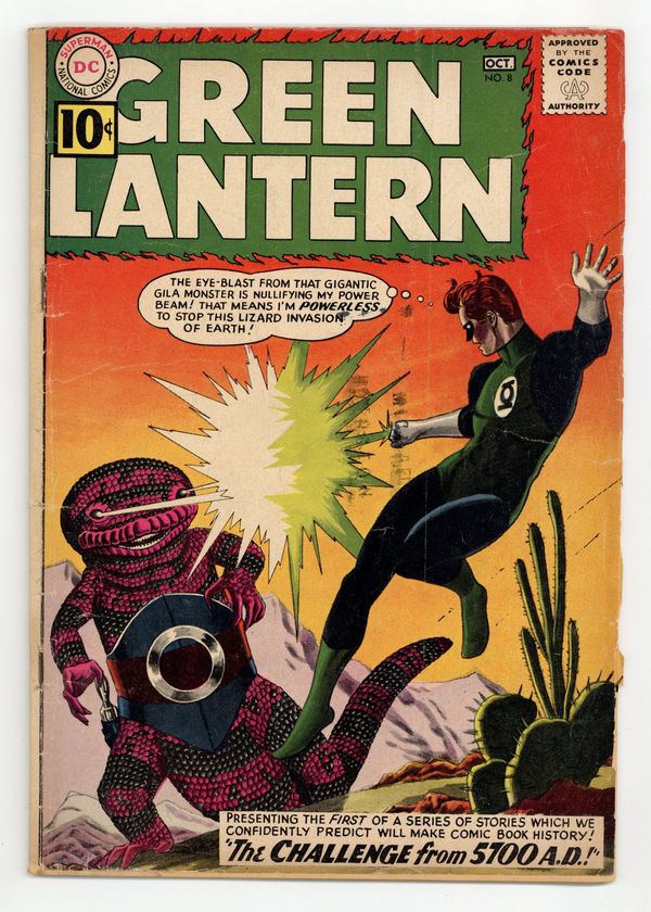 Cover pencils by Gil Kane, inks by Jack Adler. The Challenge From 5700 A.D.!, script by John Broome, pencils by Gil Kane, inks by Joe Giella; Zegors, a highly evolved gila monster form, have the earth under attack in 5700 AD, and the ruling Solarite council brings Hal Jordan to defeat them; He does so by destroying their main weapon and is returned to the present, with no knowledge of his adventure. 36 pgs. $0.10. Cover price $0.10.