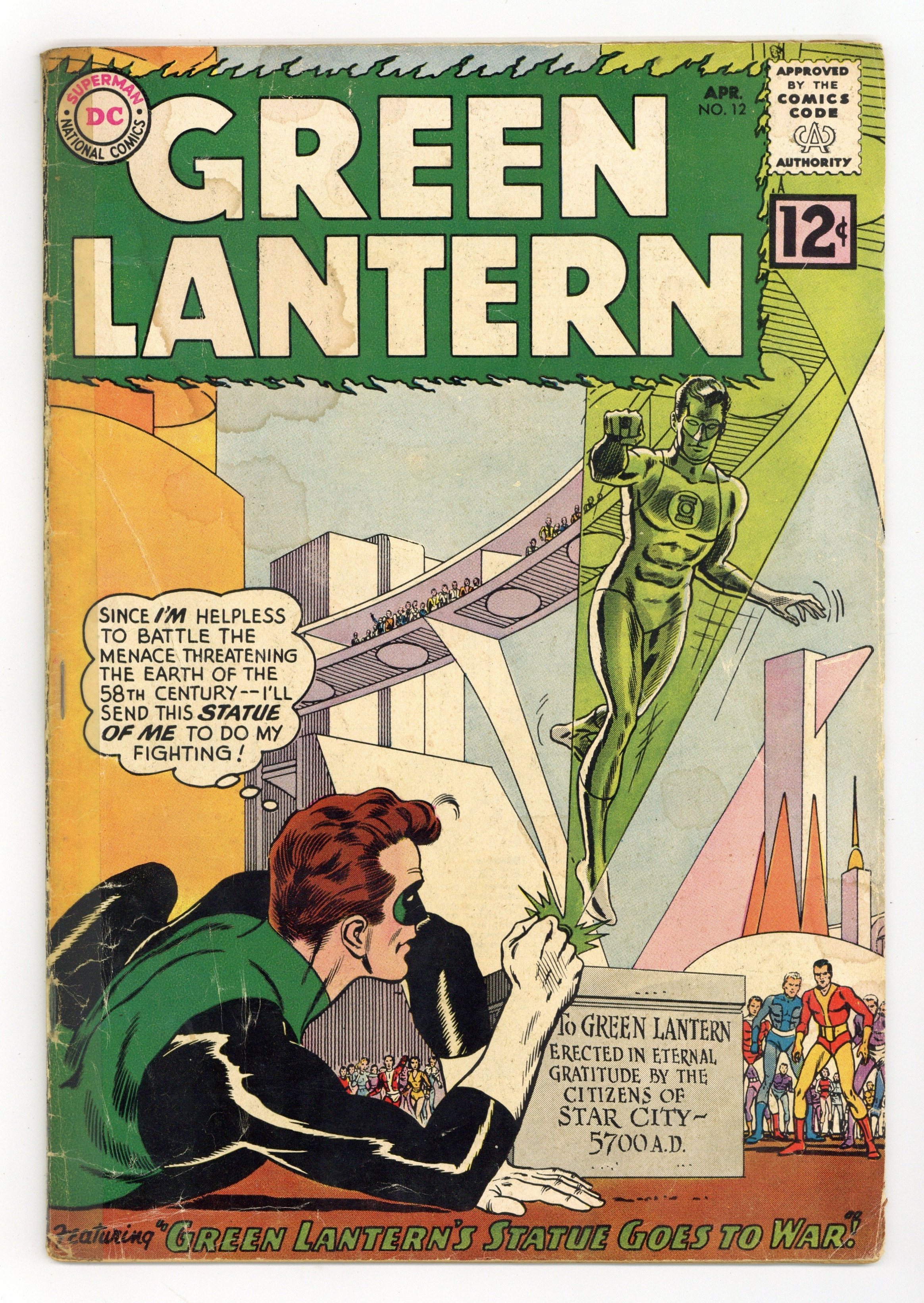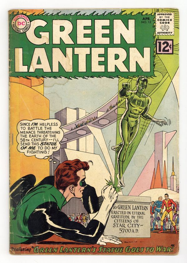 Cover pencils by Gil Kane, inks by Murphy Anderson. Green Lantern's Statue Goes to War!, script by John Broome, pencils by Gil Kane, inks by Joe Giella; Green Lantern is brought to the future again to assume his Pol Manning identity to discover why three generals are trying to overthrow the government. Zero Hour in the Silent City!, script by John Broome, pencils by Gil Kane, inks by Joe Giella; Green Lantern must discover what has stopped all sound in the city. 36 pgs. $0.12. Cover price $0.12.