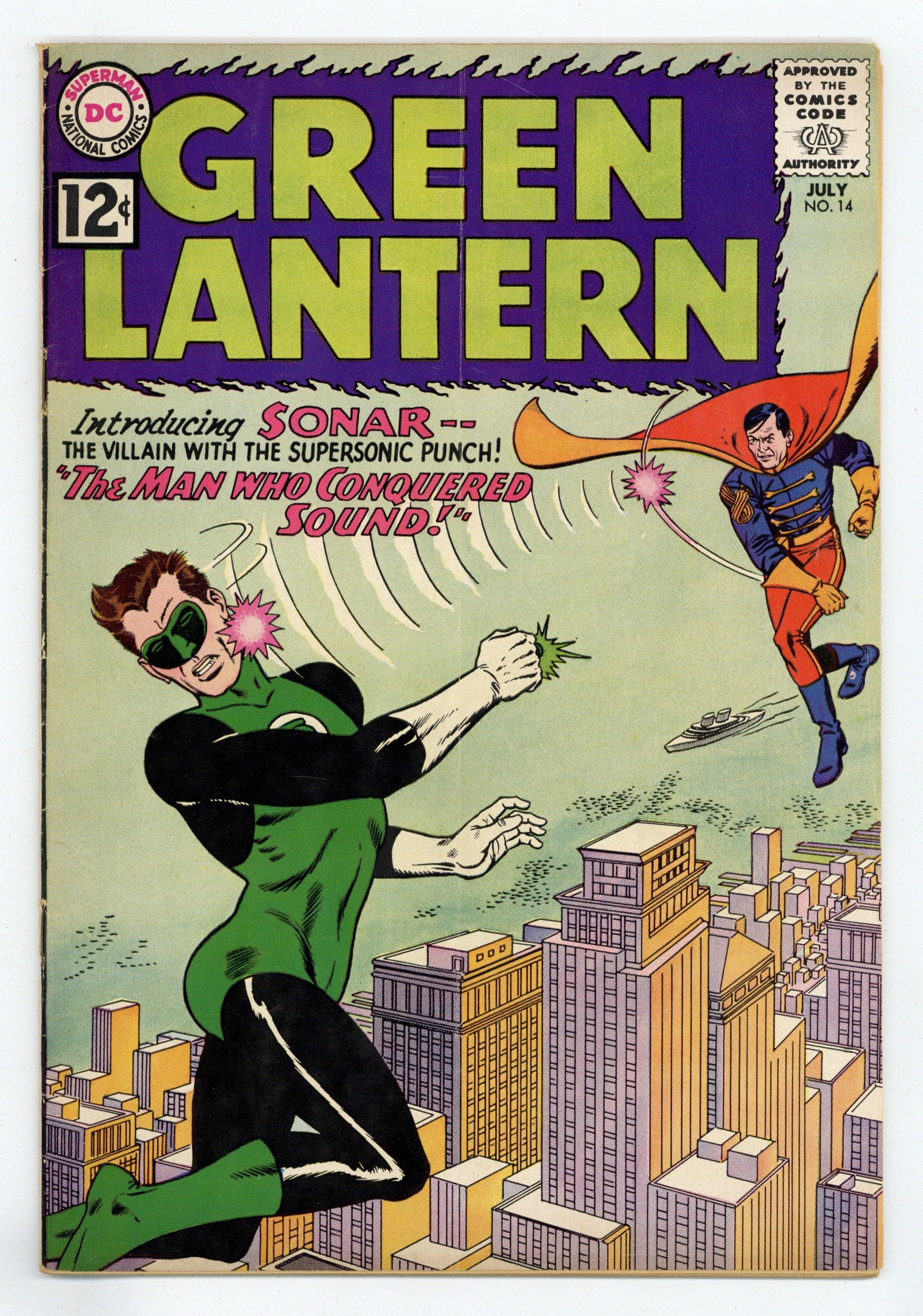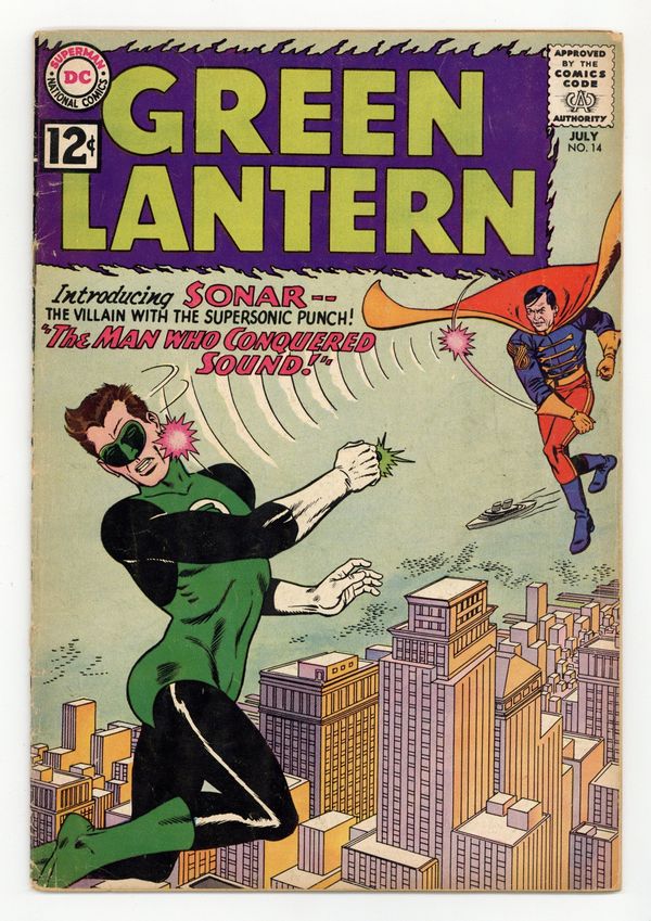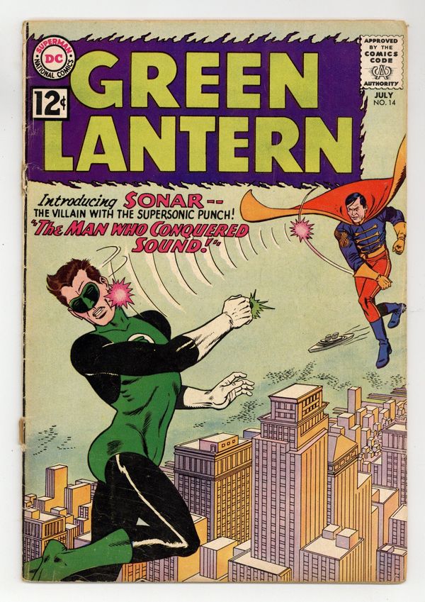 Cover pencils by Gil Kane, inks by Murphy Anderson. The Man Who Conquered Sound!, script by John Broome, pencils by Gil Kane, inks by Joe Giella; Green Lantern stops in the tiny country of Modora to get a stamp for Pieface's collection but instead learns of Sonar's plans to take over the world. My Brother, Green Lantern!, script by John Broome, pencils by Gil Kane, inks by Joe Giella; When Hal disguises his power ring as his fraternity ring it accidentally gets switched with his brother Jim Jordan's fraternity ring. Letter to the editor from editor E. Nelson Bridwell. Cover price $0.12.
