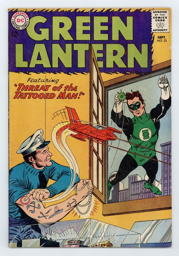 Cover pencils by Gil Kane, inks by Murphy Anderson. Threat of the Tattooed Man!, script by Gardner Fox, pencils by Gil Kane, inks by Frank Giacoia and Joe Giella; A new villain uses tattoos to commit his crimes. The Green Lantern Disasters, script by Gardner Fox, pencils by Gil Kane, inks by Joe Giella; Hal helps out Xax (first appearance), a fellow Green Lantern. 36 pgs. $0.12. Cover price $0.12.