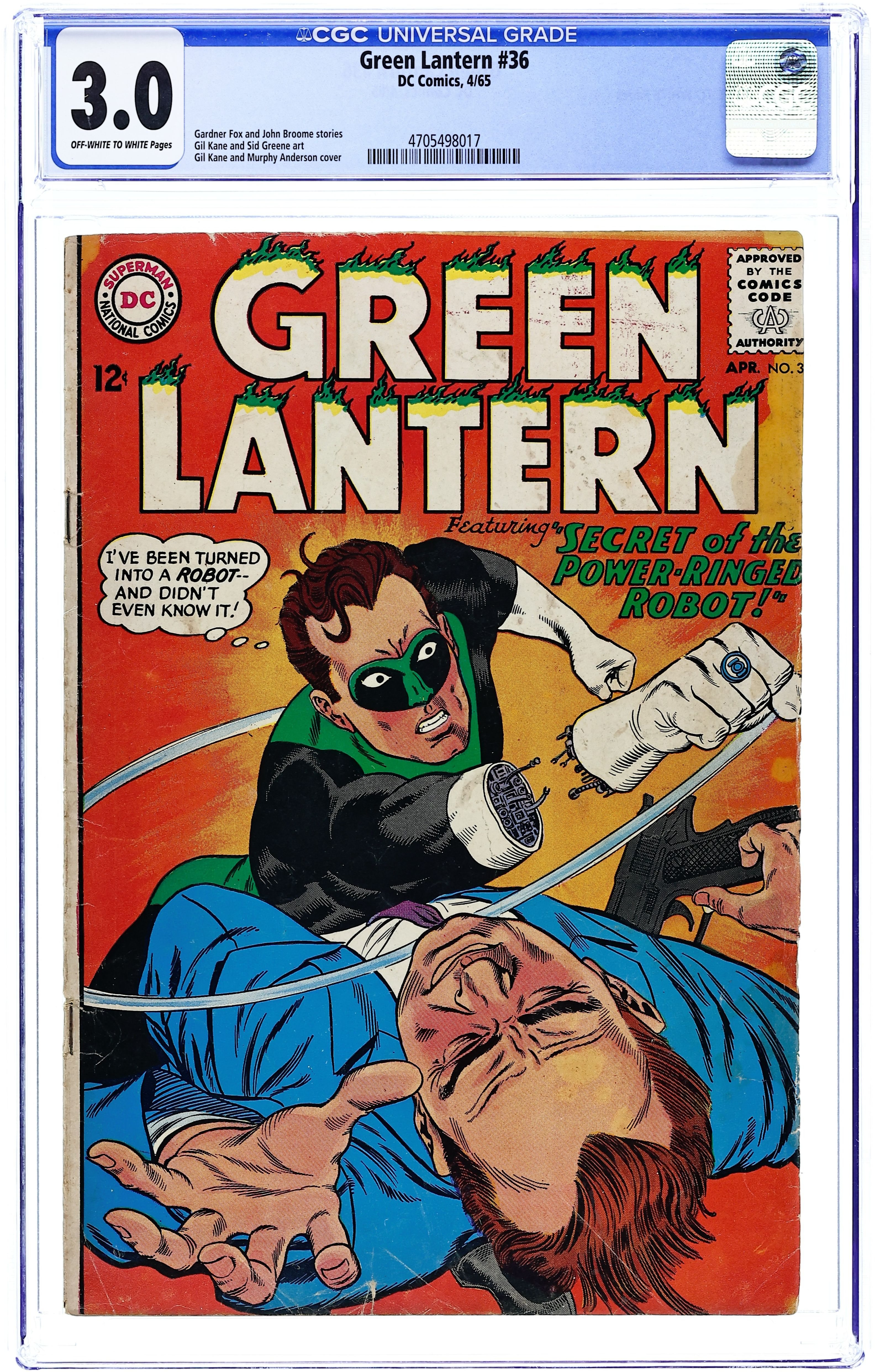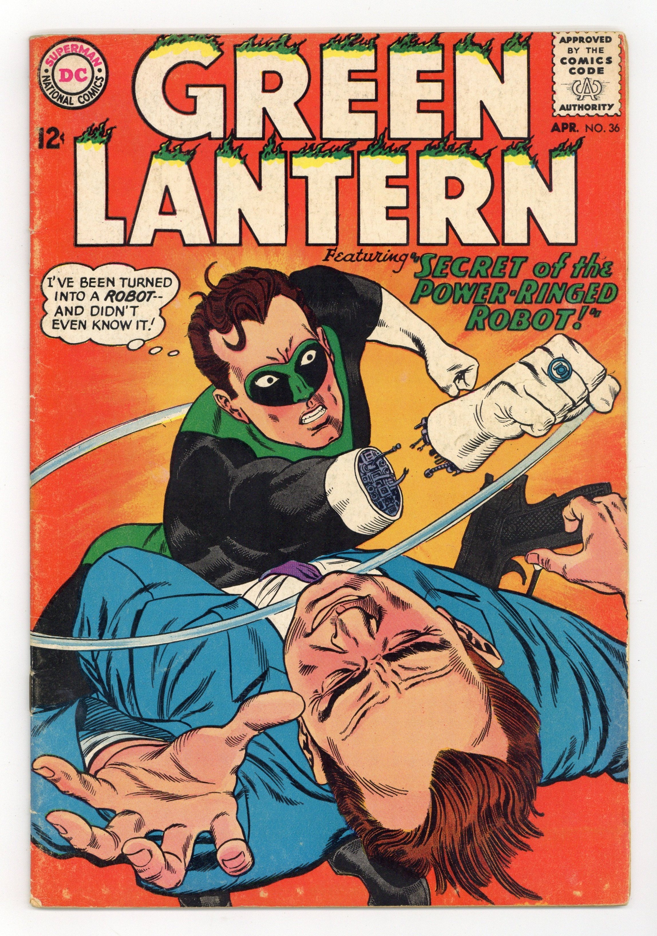 Cover pencils by Gil Kane, inks by Murphy Anderson. Secret of the Power-Ringed Robot!, script by Gardner Fox, pencils by Gil Kane, inks by Sid Greene; Hal turns himself into a robot to stop some criminals, and finds himself trapped in the robot body. Green Lantern's Explosive Weekend!, script by John Broome, pencils by Gil Kane, inks by Sid Greene; Green Lantern rescues a pretty alien from the Headmen. What's the Difference Between Perfume... Fragrance... Aroma and Star Names fact half-pages by Julius Schwartz. 36 pgs. $0.12. Cover price $0.12.