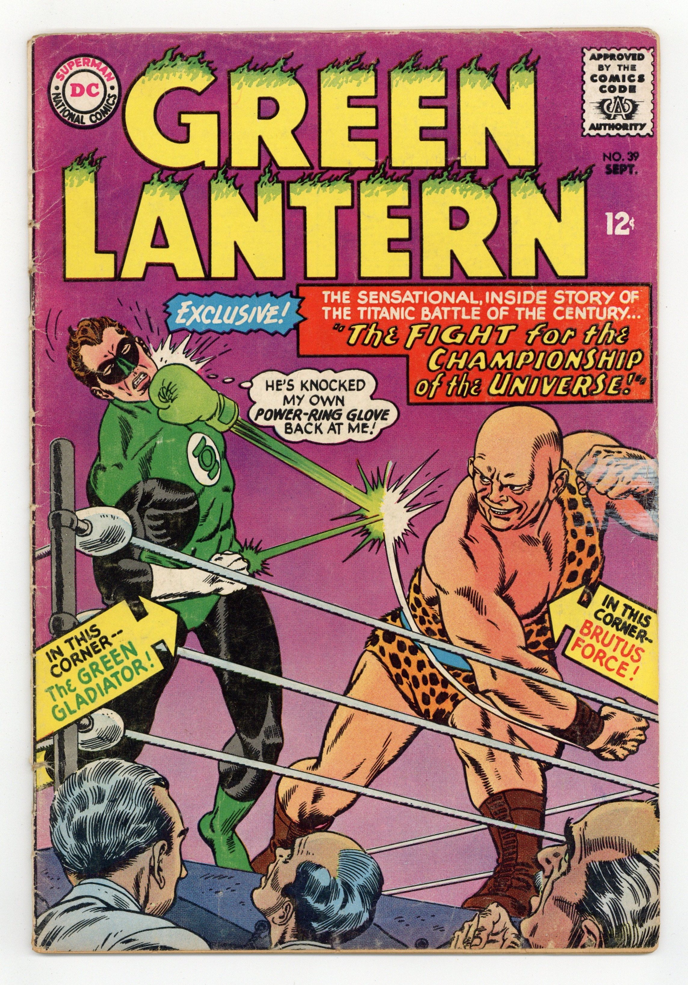 Tags: Green Lantern$9.00Cover pencils by Gil Kane, inks by Murphy Anderson. Practice Makes The Perfect Crime, script by John Broome, pencils by Gil Kane, inks by Sid Greene; Black Hand uses he power-light to create the illusion that Green Lantern is Black Hand, leading to GL's arrest for stealing the Dona Maria. The Fight For the Championship of the Universe, script by John Broome, pencils by Gil Kane, inks by Sid Greene; An intergalactic fighting champion wants a shot at Green Lantern. 36 pgs. $0.12. Cover price $0.12.